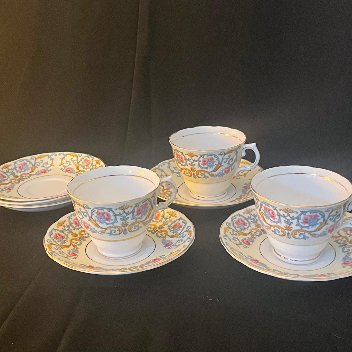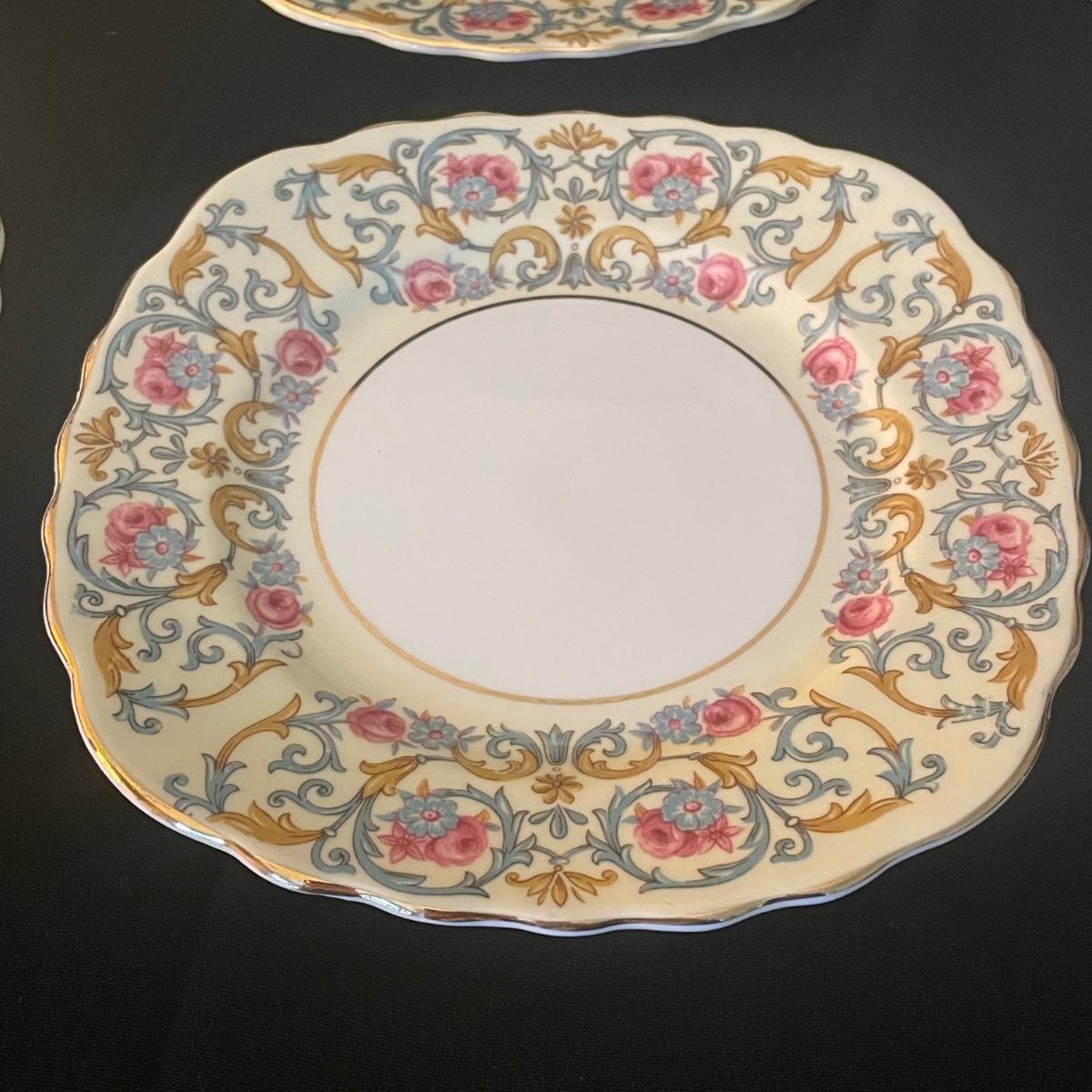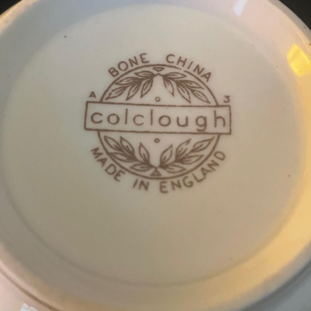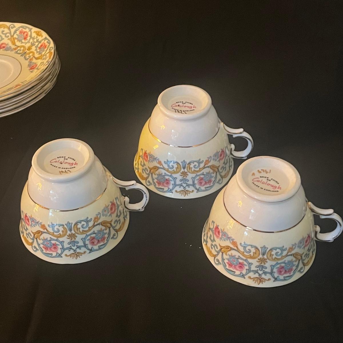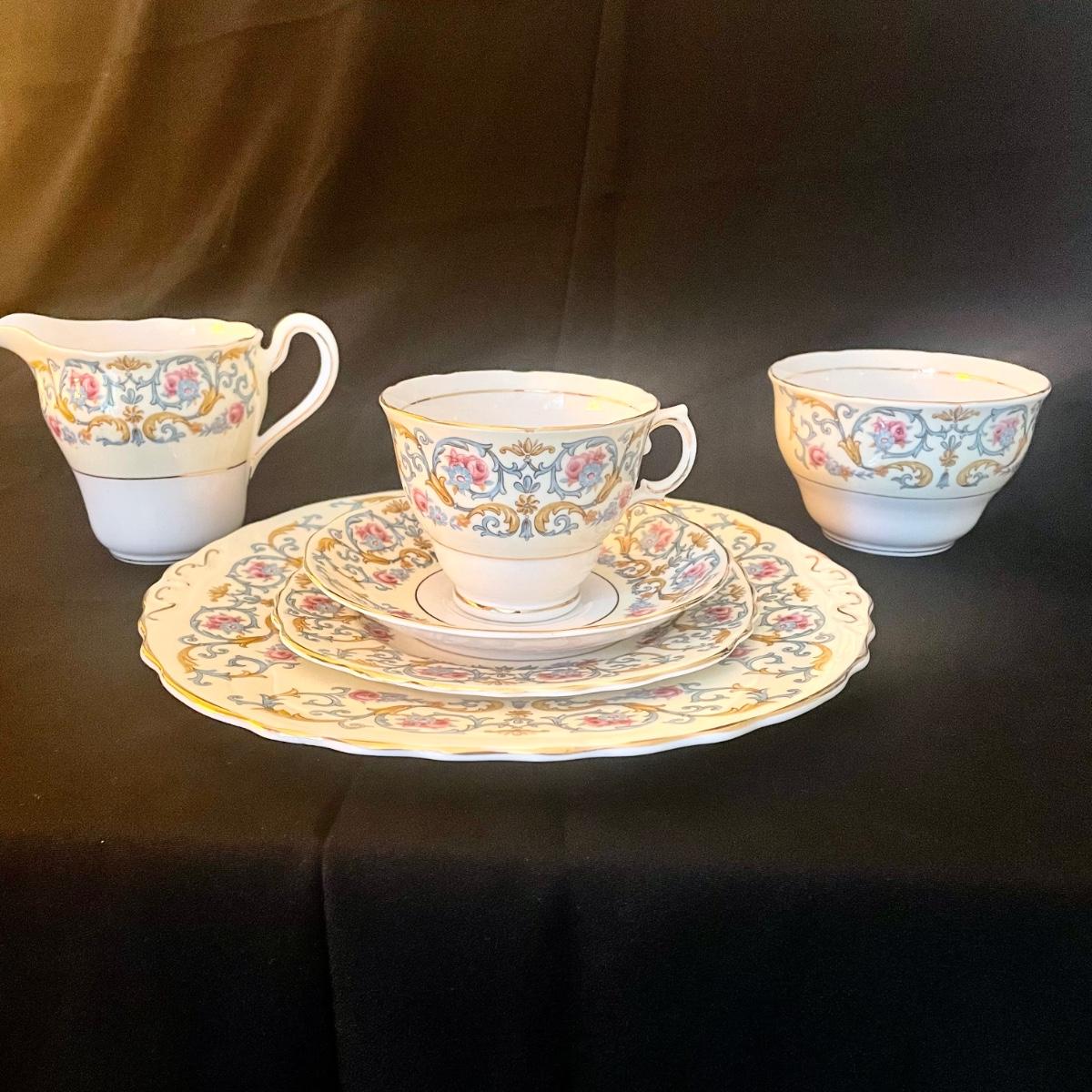 One large plate (9” d), 6 side plates (6” d), 6 saucers, 3 cups, creamer and sugar bowl make up this set of Colclough fine bone China from England. A pretty blue and pink floral pattern with gold rims, this set is in great condition.