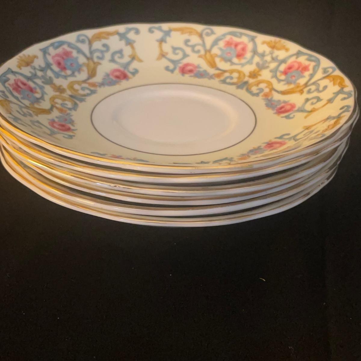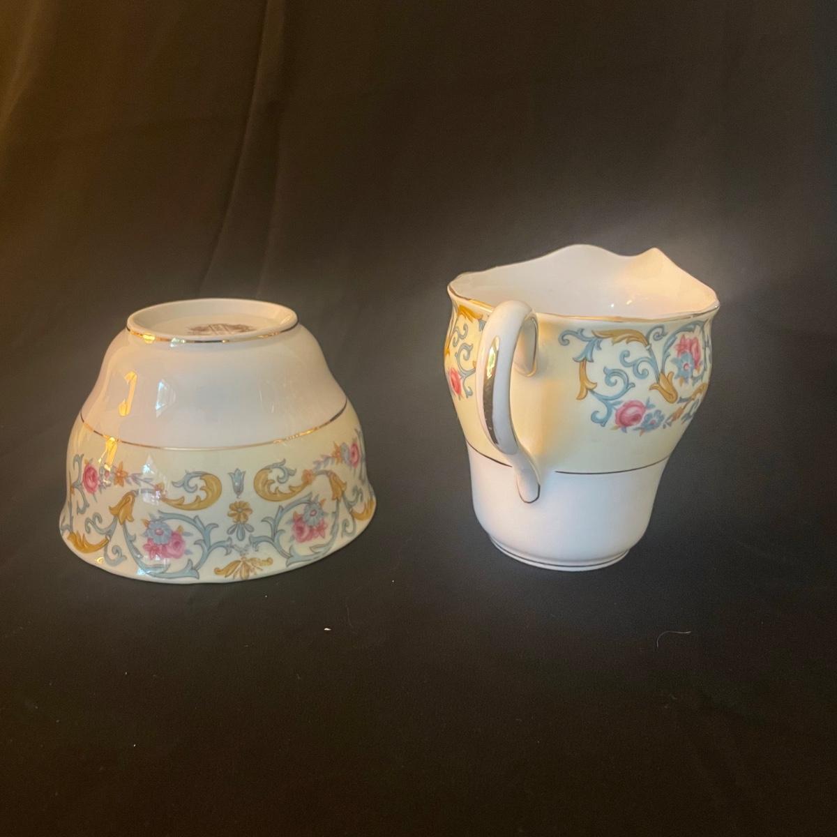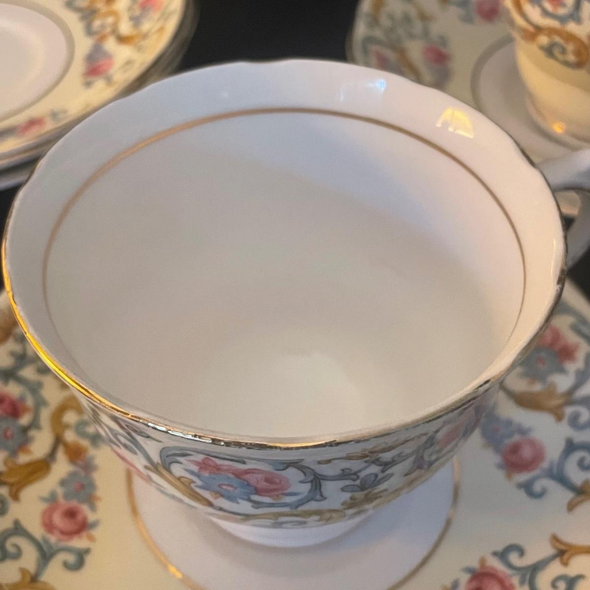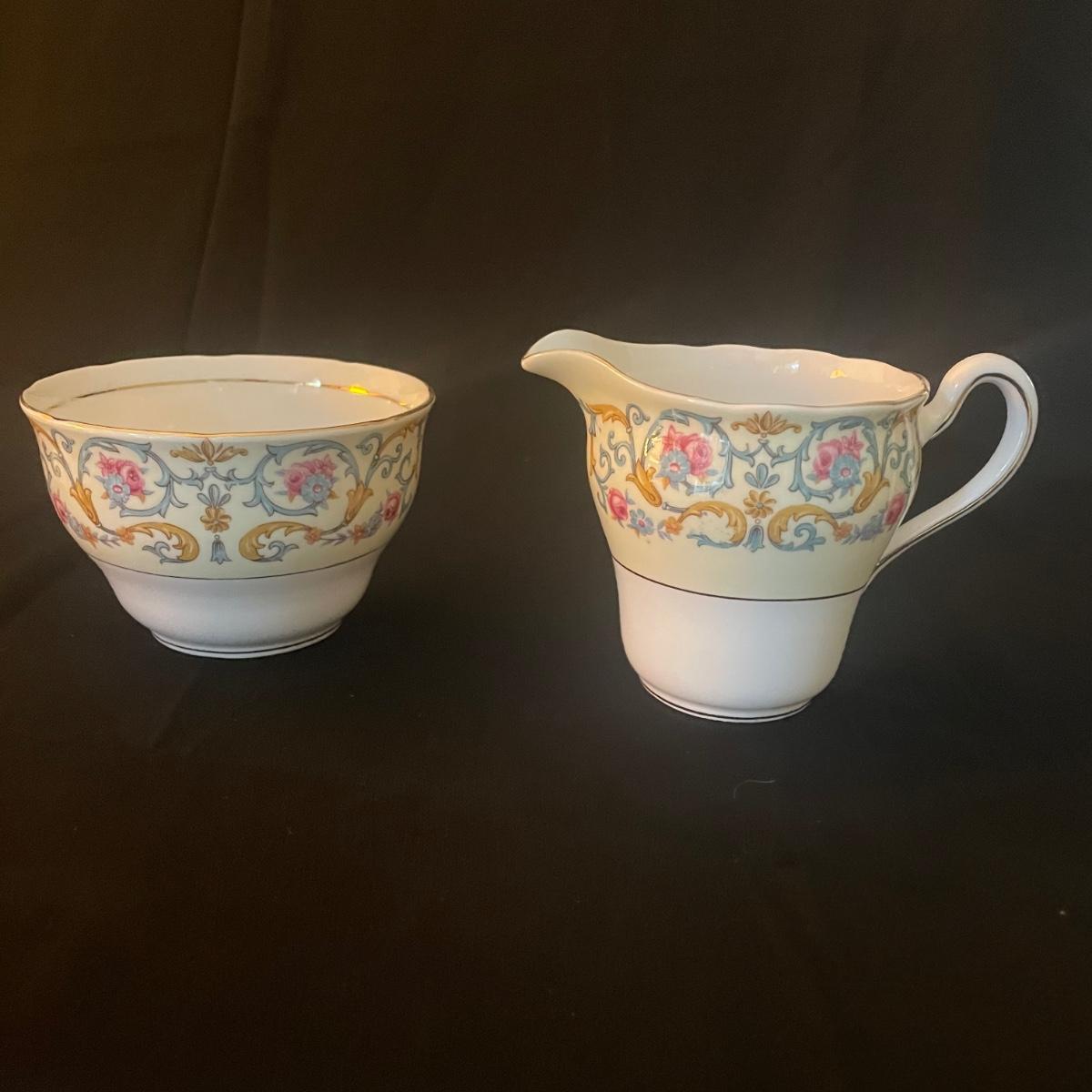 One large plate (9” d), 6 side plates (6” d), 6 saucers, 3 cups, creamer and sugar bowl make up this set of Colclough fine bone China from England. A pretty blue and pink floral pattern with gold rims, this set is in great condition.