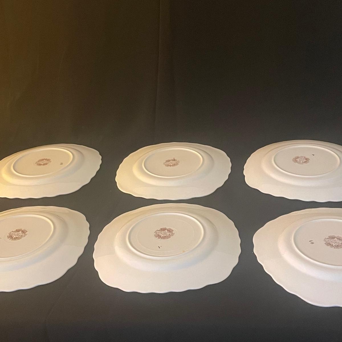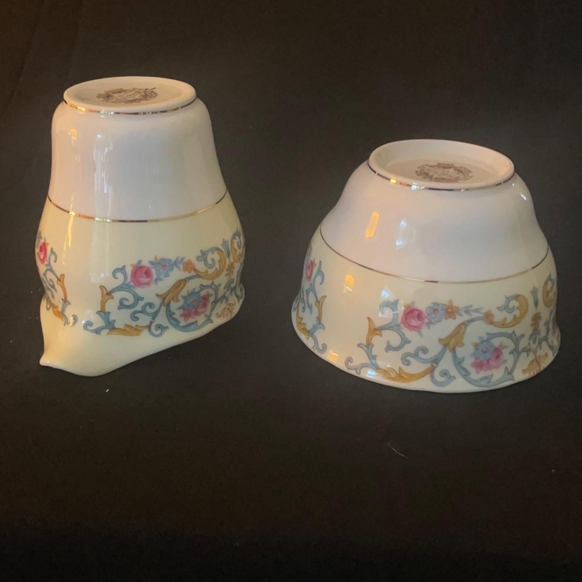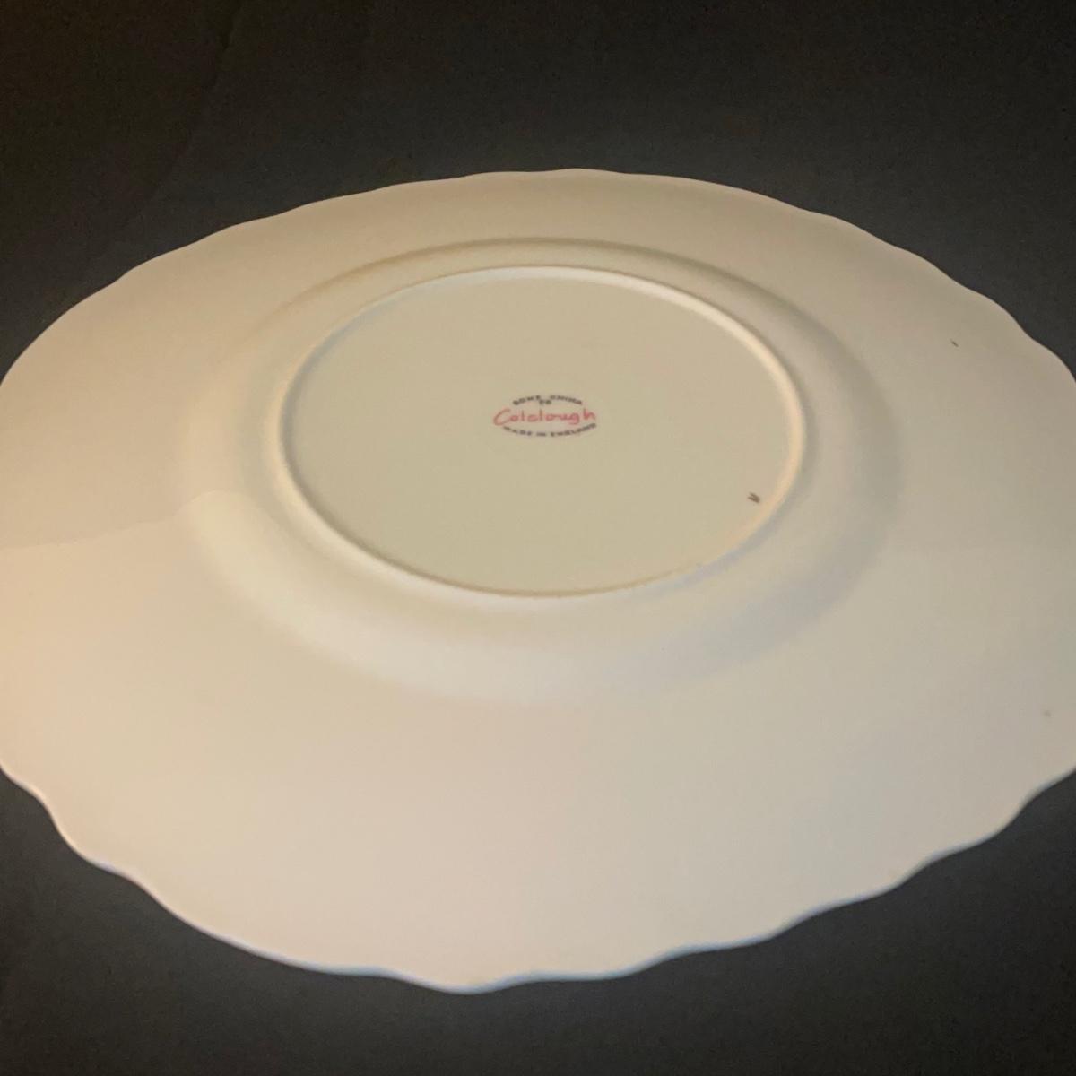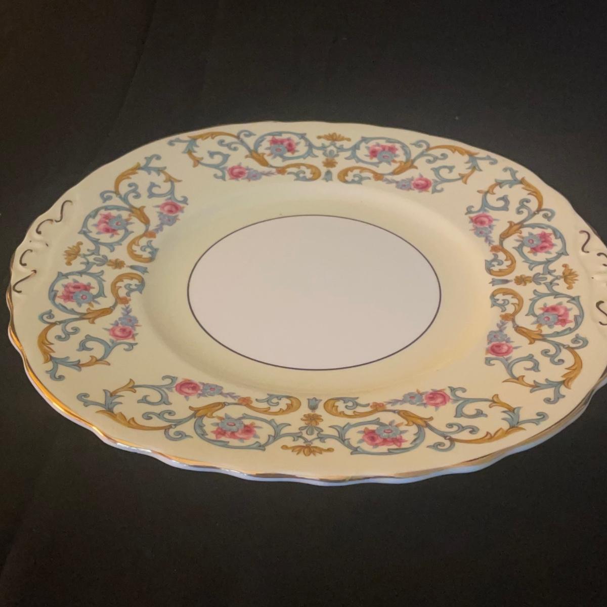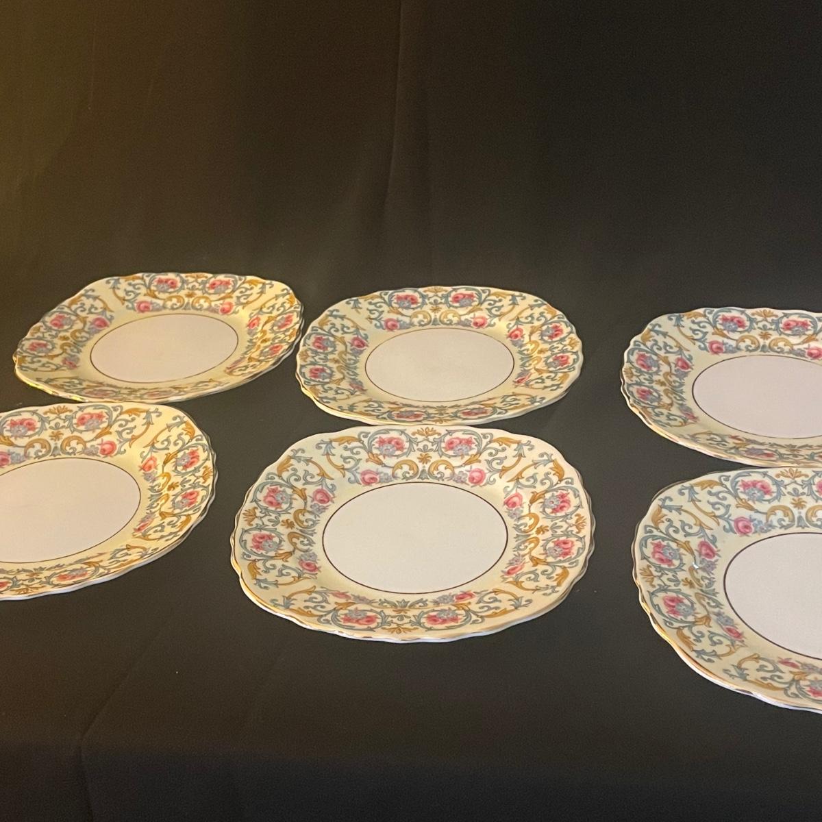 One large plate (9” d), 6 side plates (6” d), 6 saucers, 3 cups, creamer and sugar bowl make up this set of Colclough fine bone China from England. A pretty blue and pink floral pattern with gold rims, this set is in great condition.