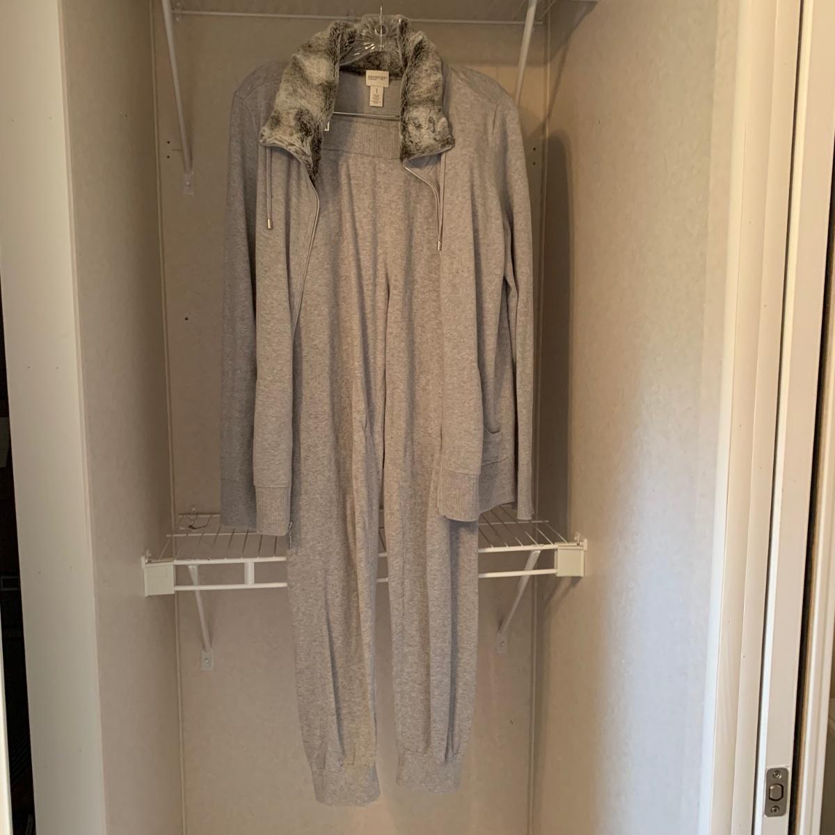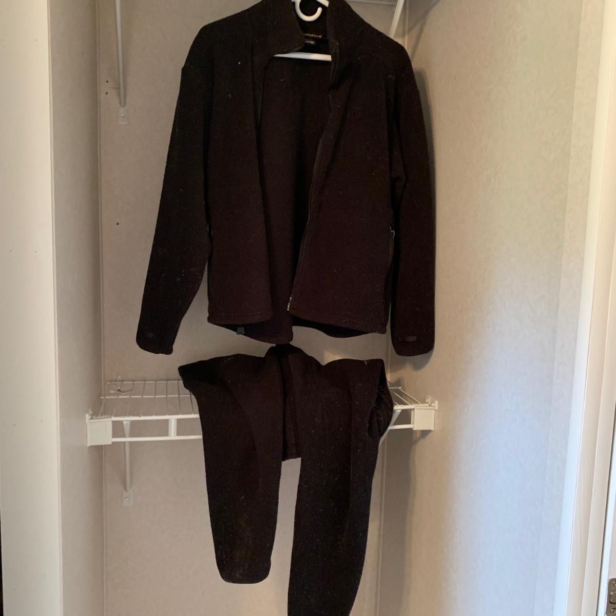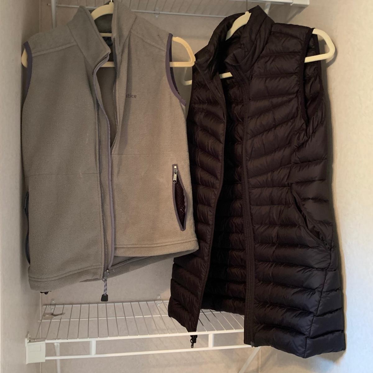 A variety of clothing for cold weather, with a hat, gloves, a neck warmer, and scarves. There is a size 6 organic cotton thermal set by Cottonique, two size M fleece-like sets by Columbia and Solstice, a soft and cozy Zenergy set by Chicos (size 1), two vests, a fleece pullover jacket, a fleece sweatshirt, and a Tri-Mountain fleece-lined jacket. Six pairs of gloves are included, as well as a cute hat, an incredibly soft neck warmer, and three scarves. The Solstice Polartec set has a lot of fuzz on it, but it comes off with a lint roller so should be removable.
