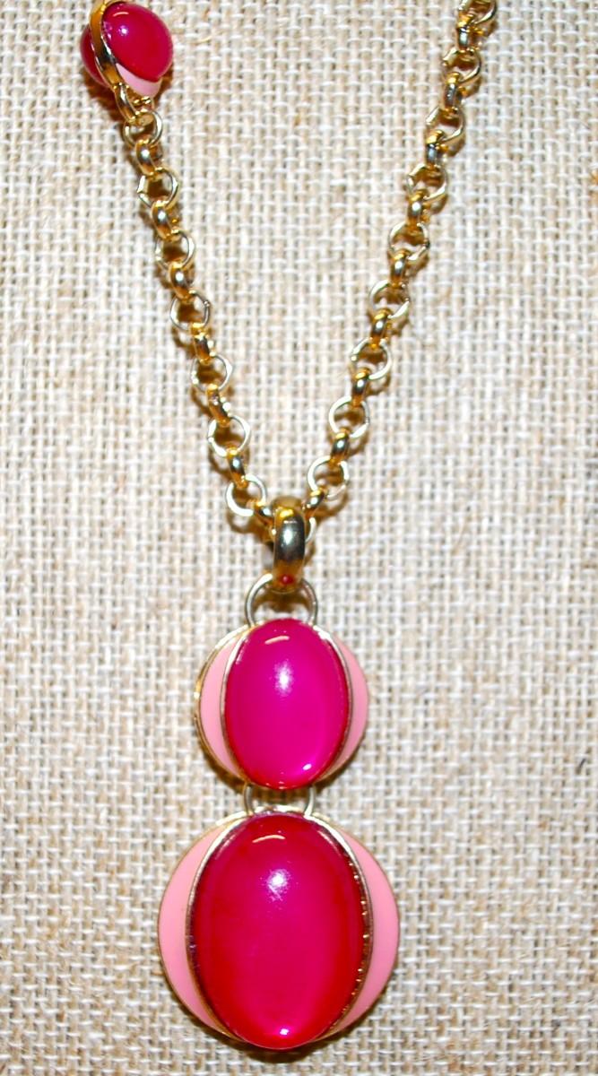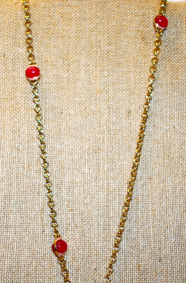 "Coldwater Creek" Brand Necklace with Red & Pink Baubles on a Gold Tone Chain 30" L