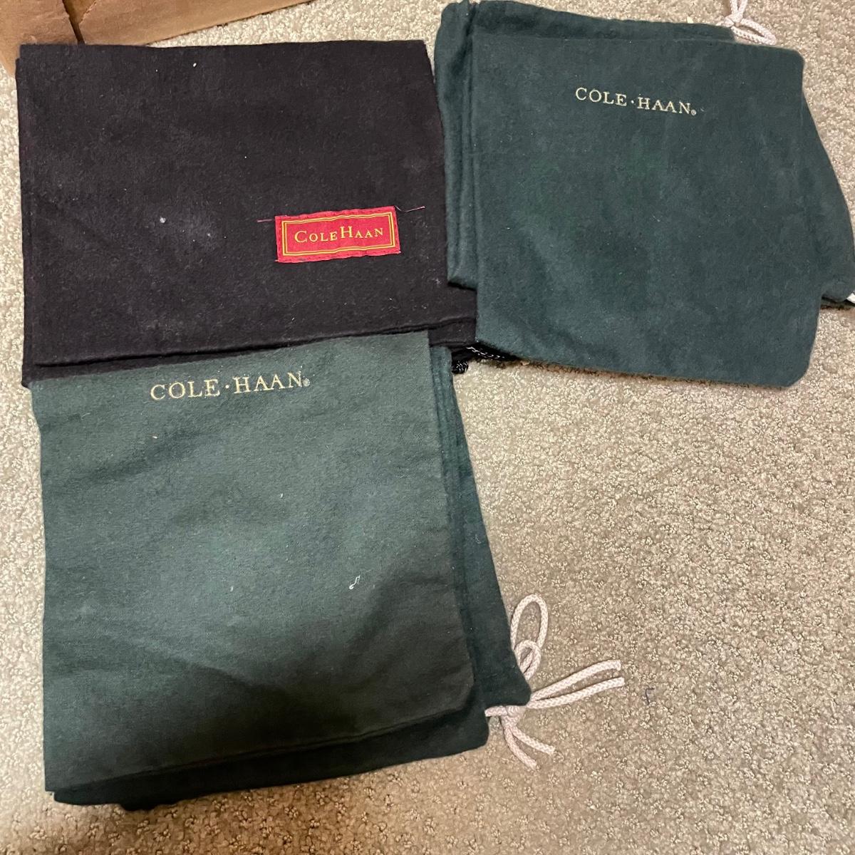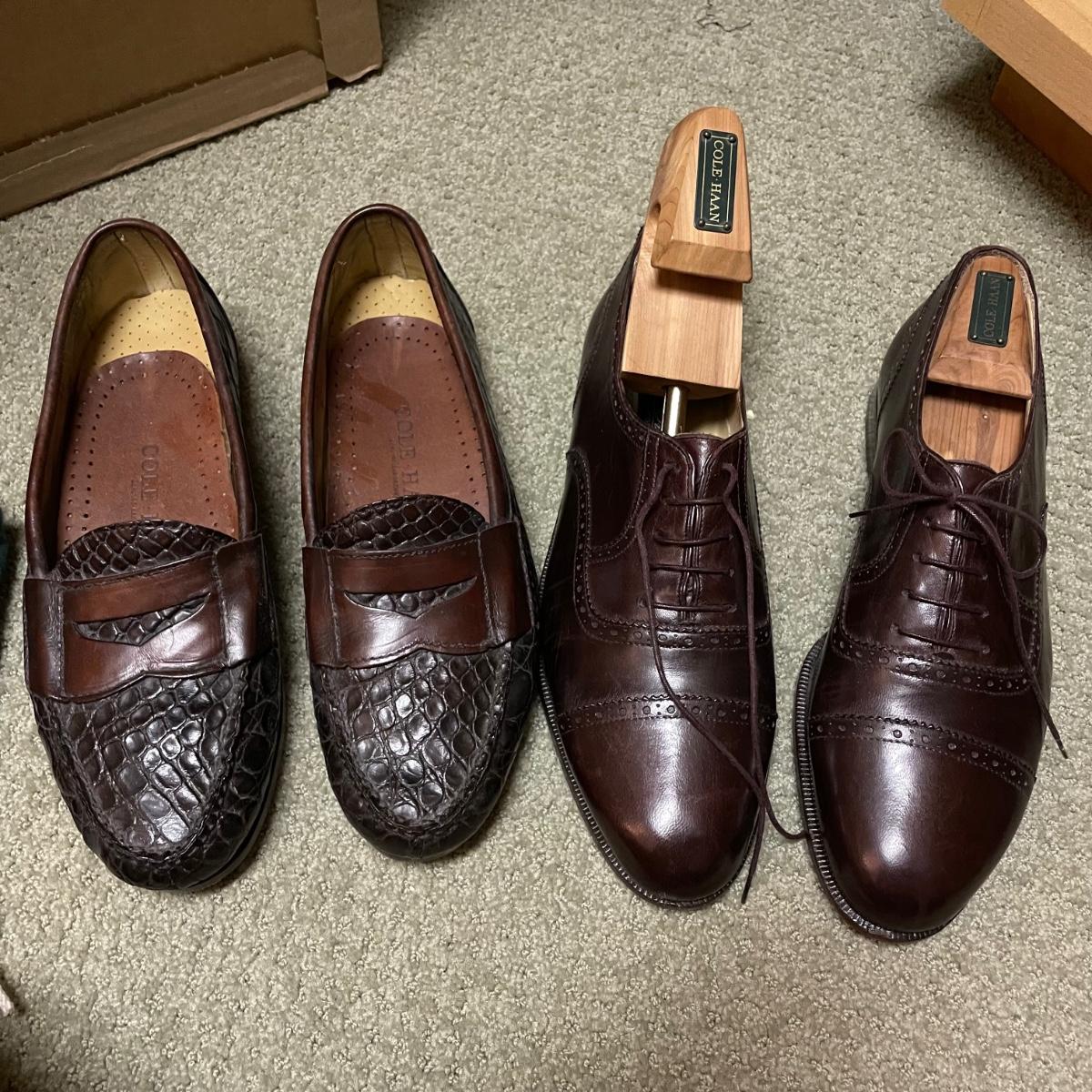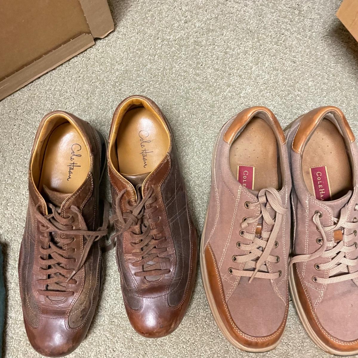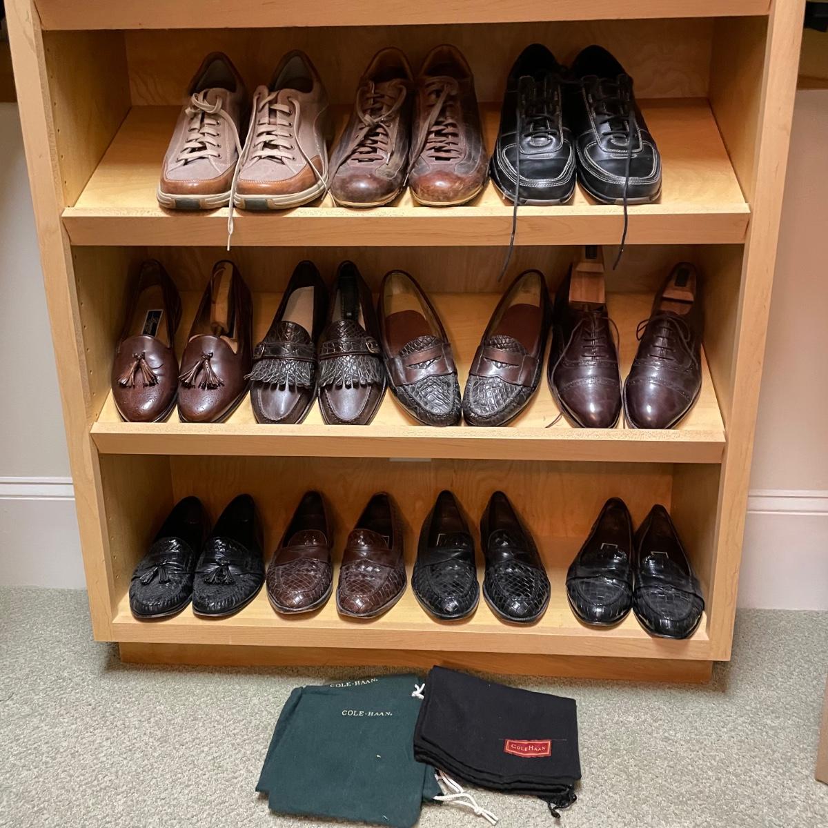 Eight pairs of Cole Haan loafers, two pairs of Cole Haan tennis shoes and one pair of Rockport sneakers. Ten pairs are men’s size 10, one pair of loafers is sized 9.5. Lot includes three pairs of Cole Haan dust bags. Shoes vary in condition, most are a bit dusty, but otherwise clean. Some have removable inserts (the one half removed in photos will need to be replaced. Some odd shoe trees shown in images are included. See images. Shipping available.