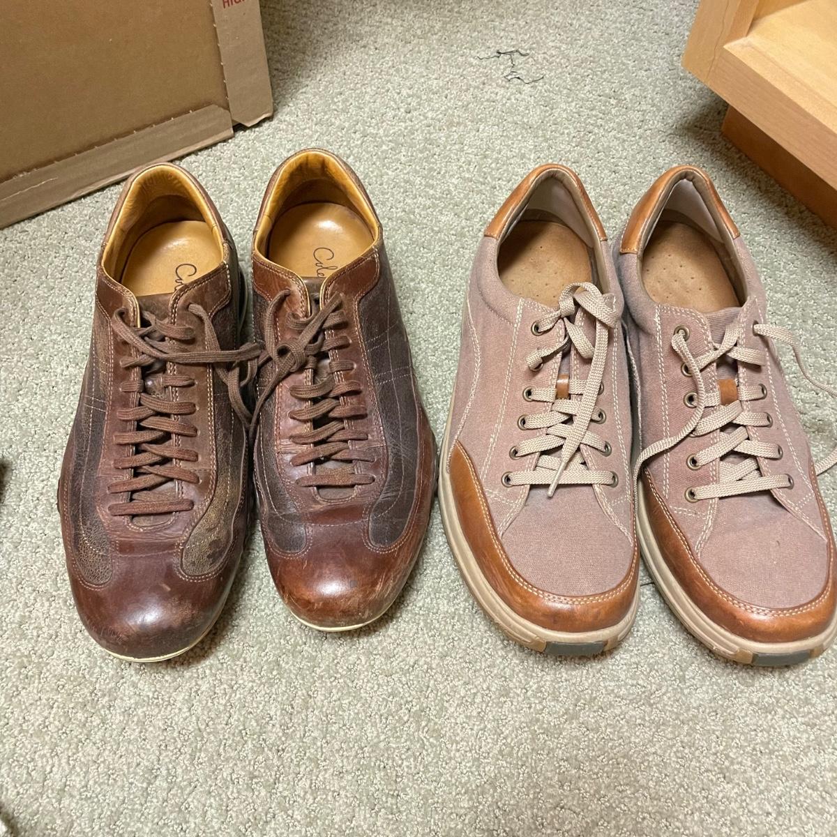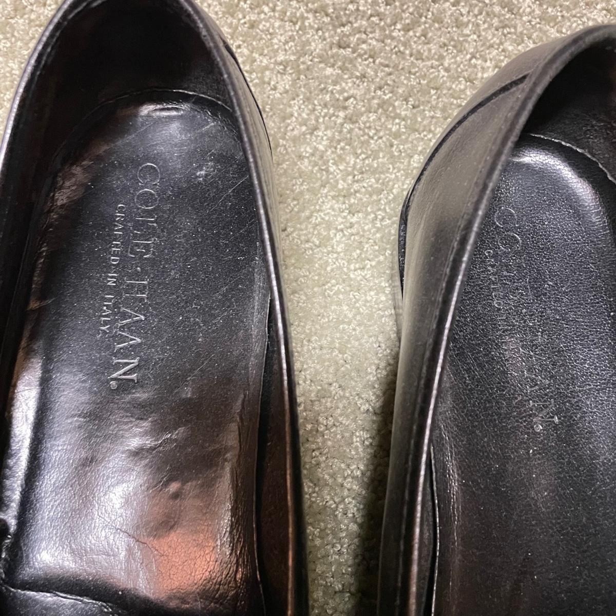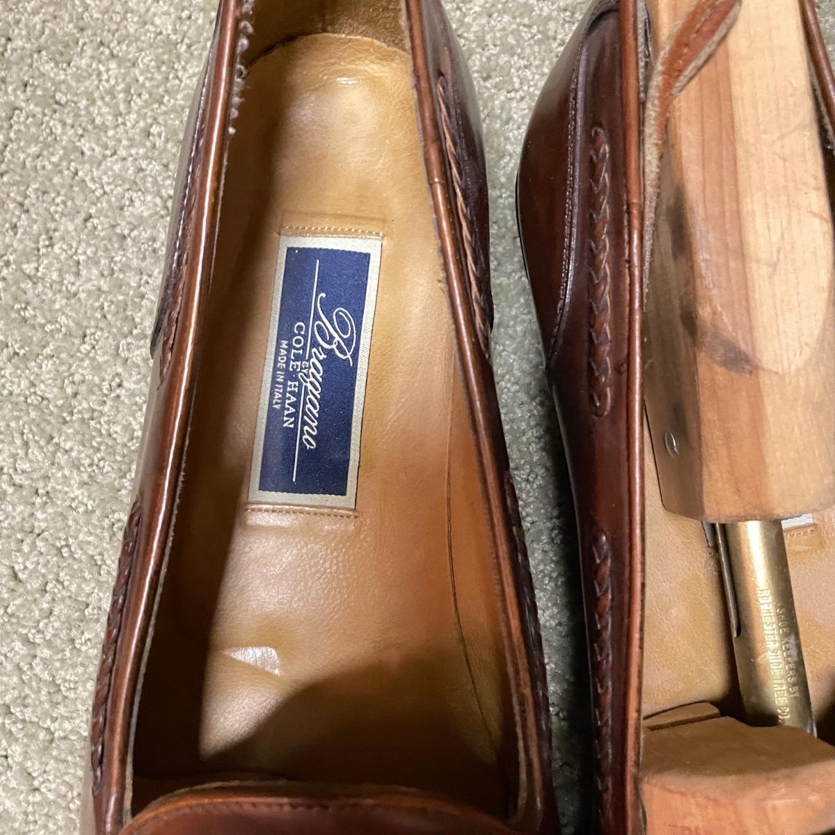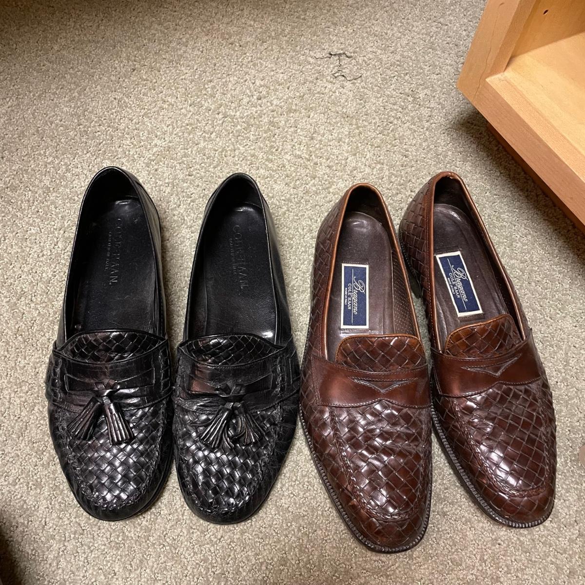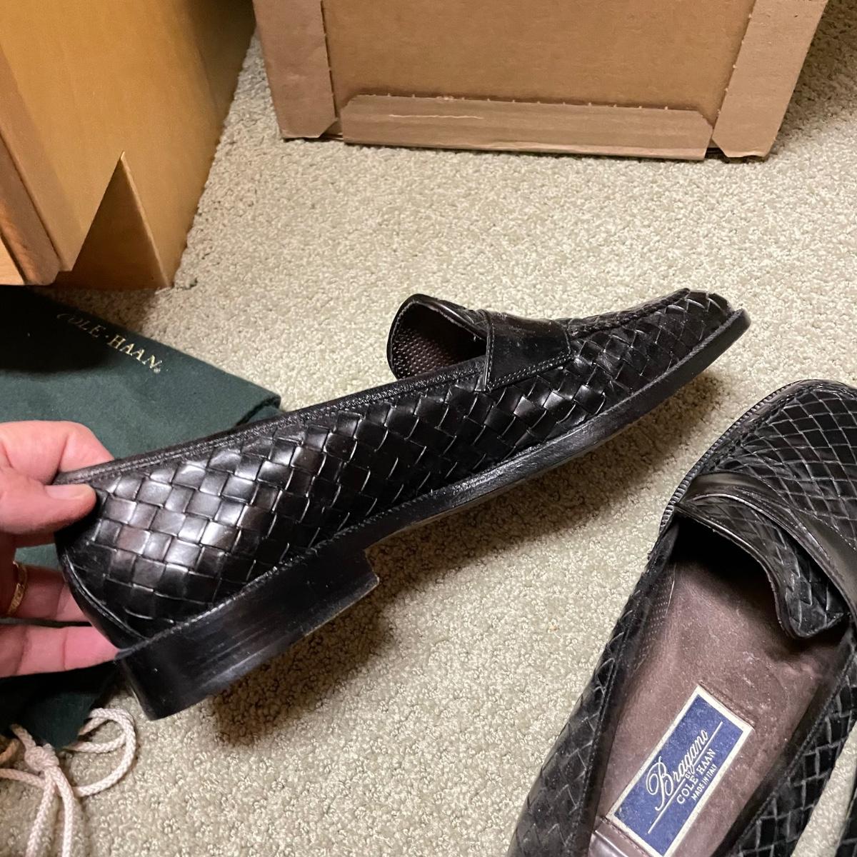 Eight pairs of Cole Haan loafers, two pairs of Cole Haan tennis shoes and one pair of Rockport sneakers. Ten pairs are men’s size 10, one pair of loafers is sized 9.5. Lot includes three pairs of Cole Haan dust bags. Shoes vary in condition, most are a bit dusty, but otherwise clean. Some have removable inserts (the one half removed in photos will need to be replaced. Some odd shoe trees shown in images are included. See images. Shipping available.