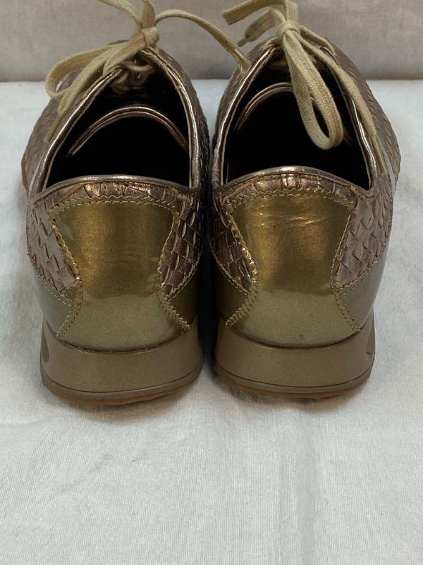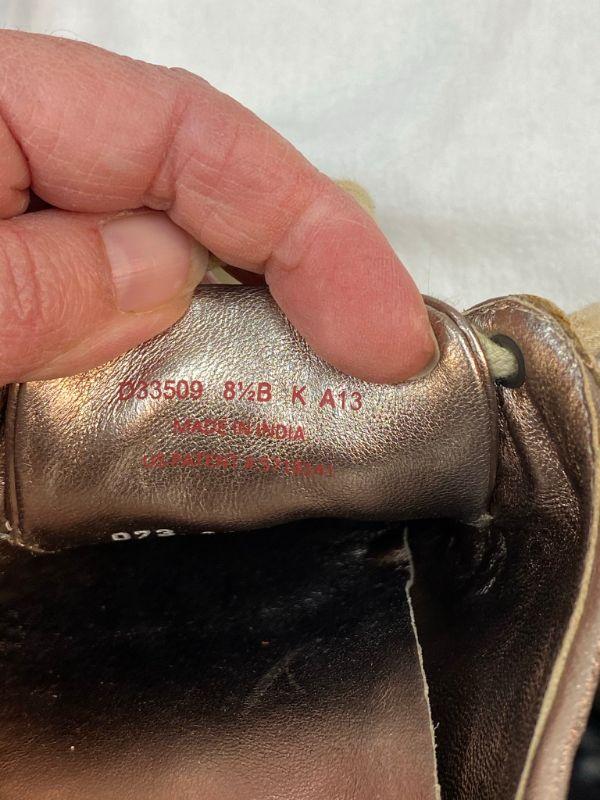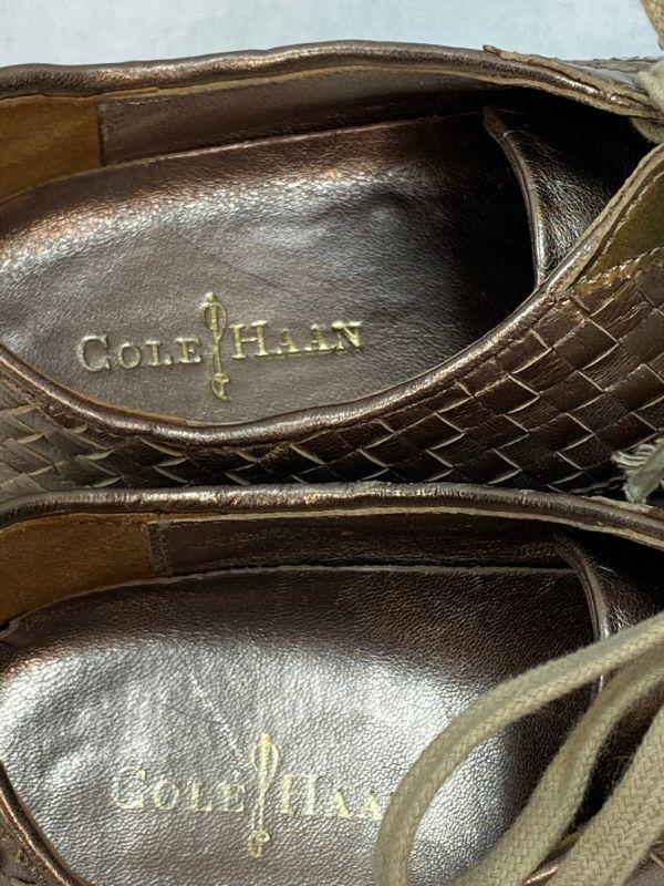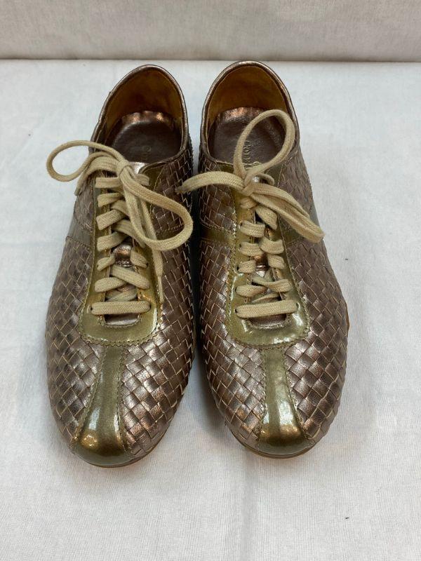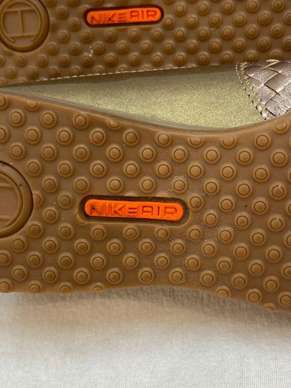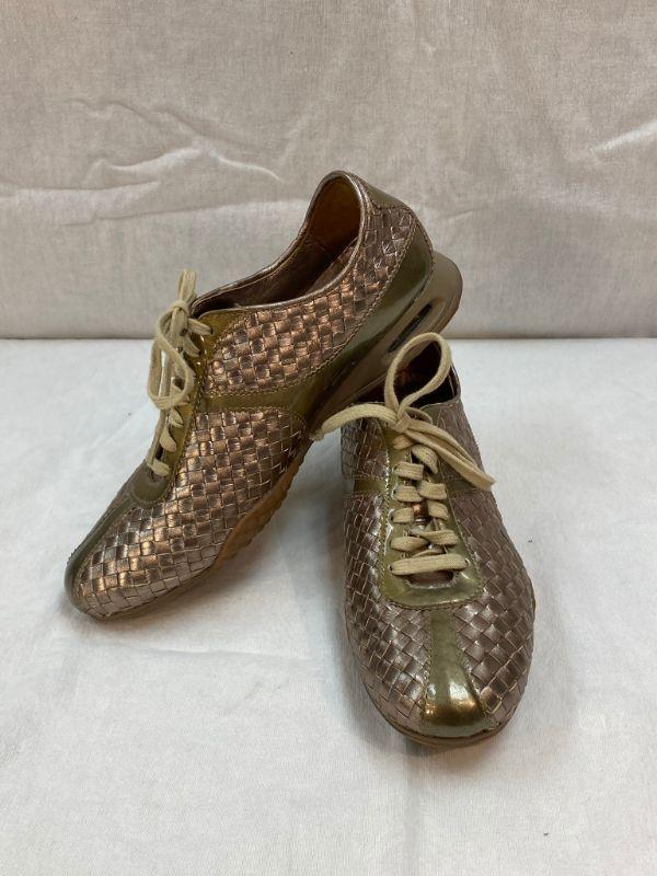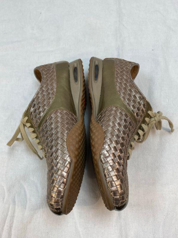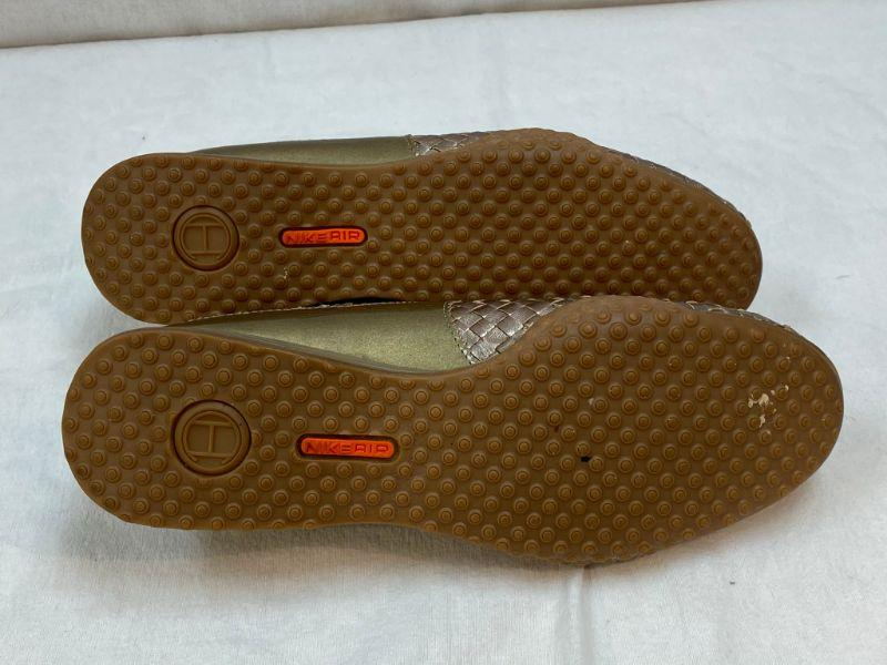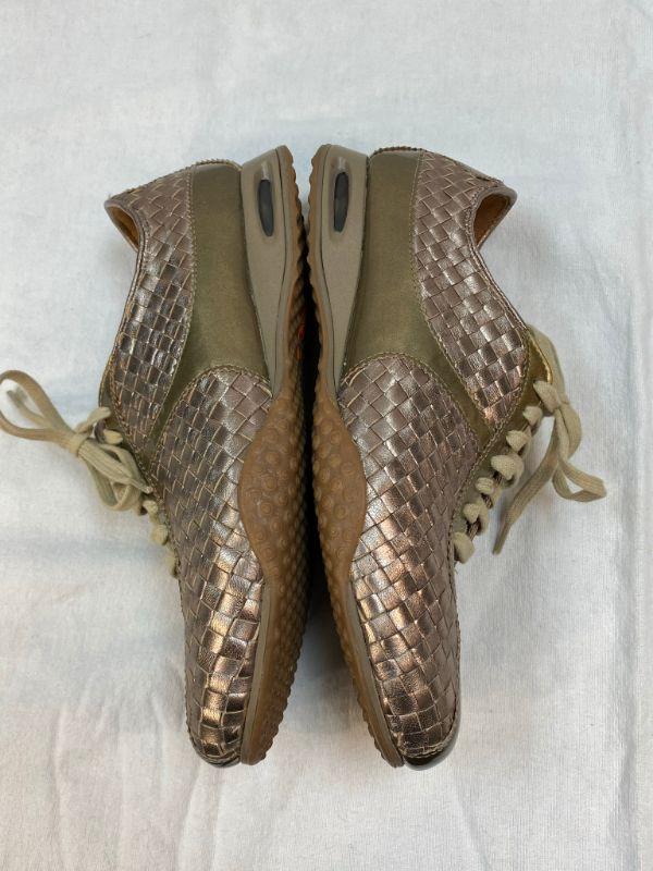 Cole Haan + Nike Air metallic sneaker. Sort of a bronze gold metallic. Has a woven texture to the material, reminds me of a fancy bowling shoe. Size 8.5B. In good lightly worn condition.