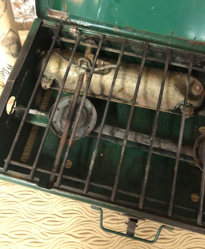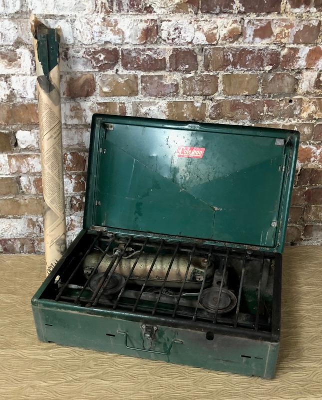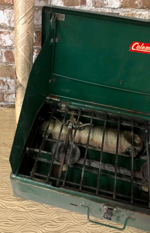 With legs here is a used Coleman Model 214E 2-Burner Gas Camp Stove...