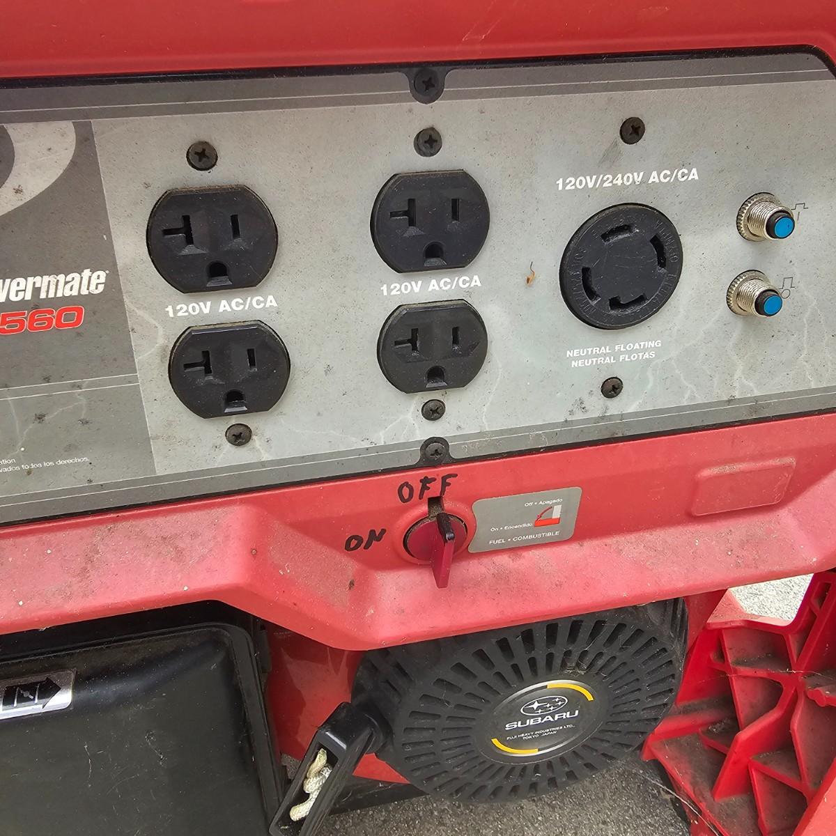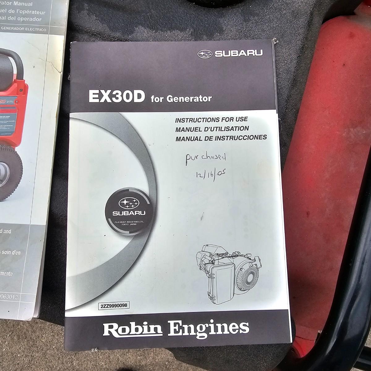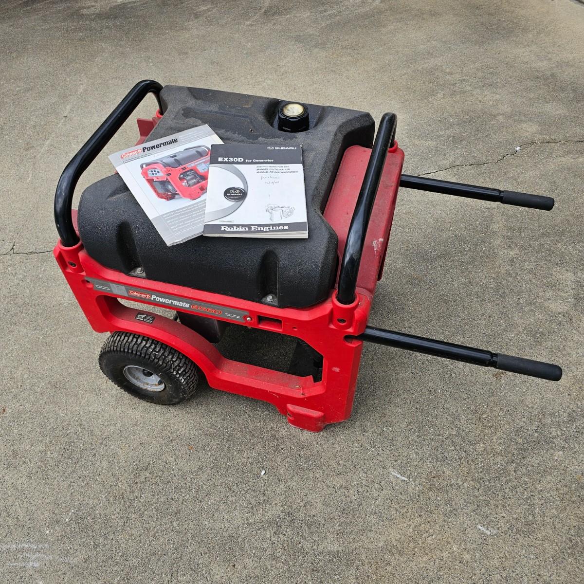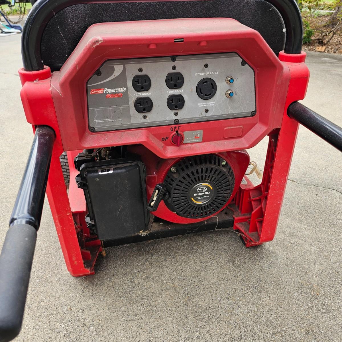 6500 watt Coleman portable generator unit with Subaru engine. Rig has handles and pneumatic tires for ease of movement. Equipped with four 120V AC outlets and one 120/240V AC outlet. Has seven gallon tank, manual says should run 13 hours. Engine pulled over smoothly and started fine. Includes manuals. See photos for details. Local pickup only. Winning bidder must bring assistance to help move and load this item due to its weight and/or size.