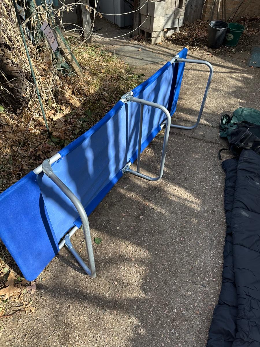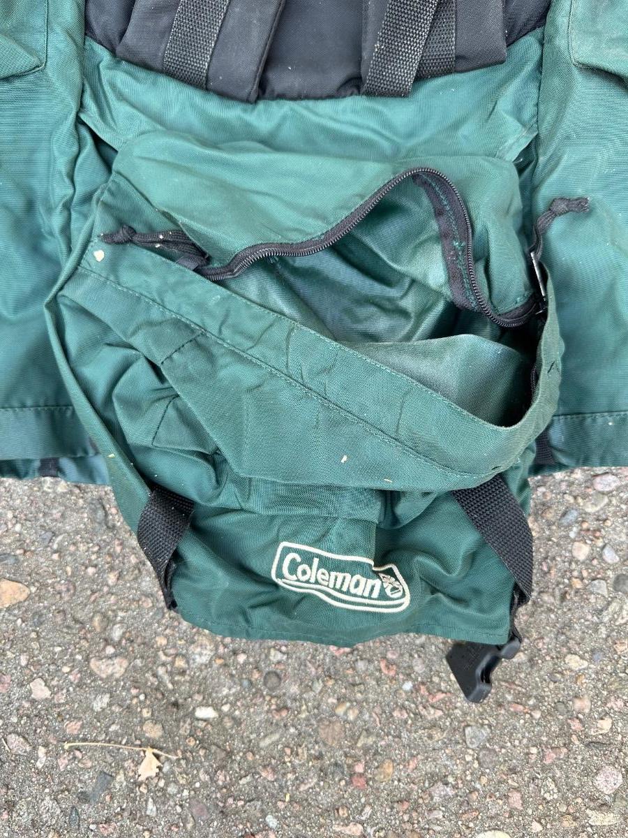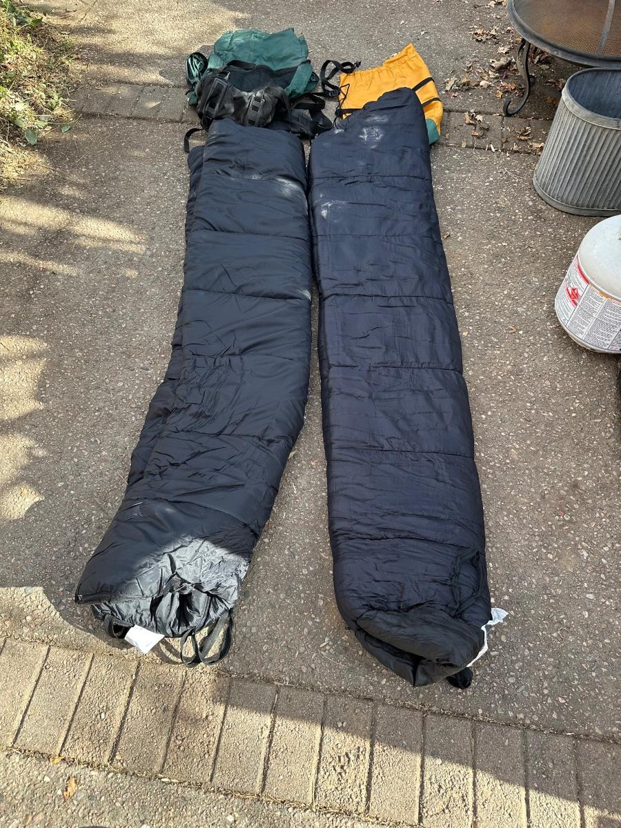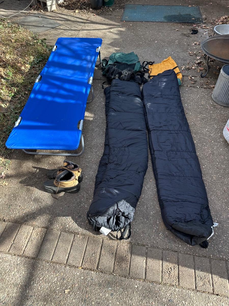 COLEMAN BACKPACK, 2 DUPONT SLEEPING BAGS, FOLDING CAMPING COT PLUS HIKING BOOTS SIZE 11