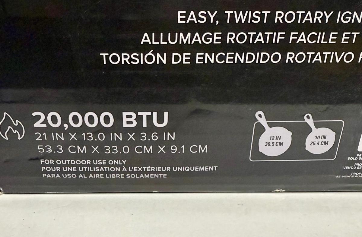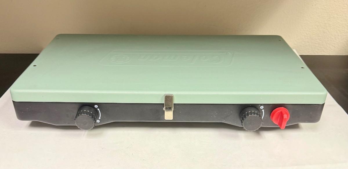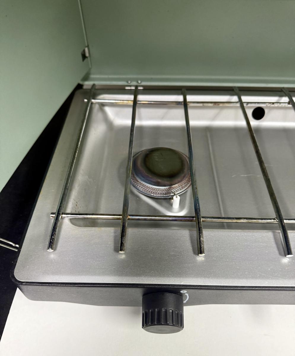 All-metal classic 2-burner design, with igniter. Uses propane. Near-new condition with original box.