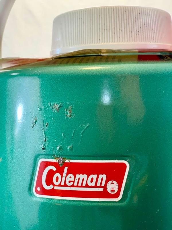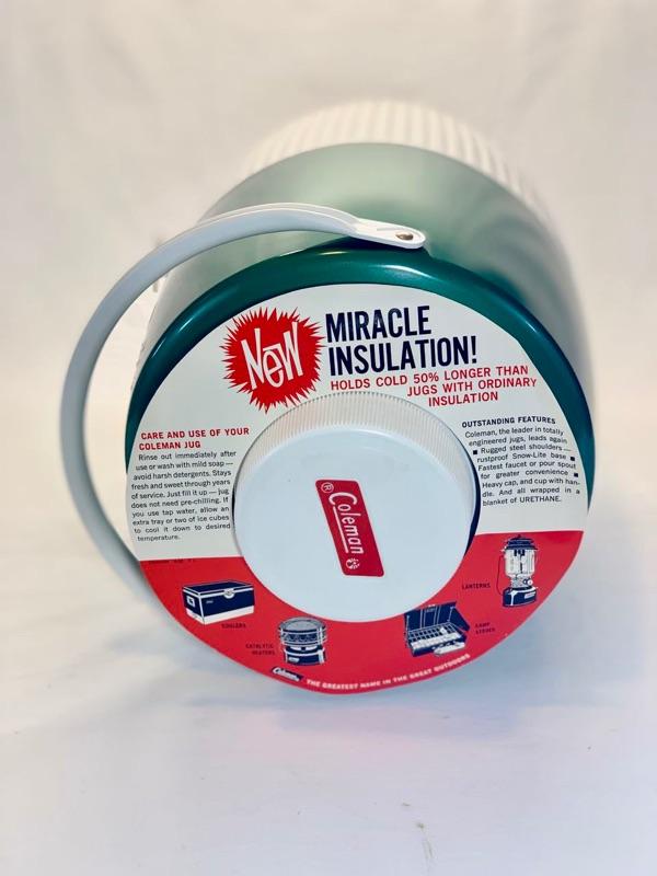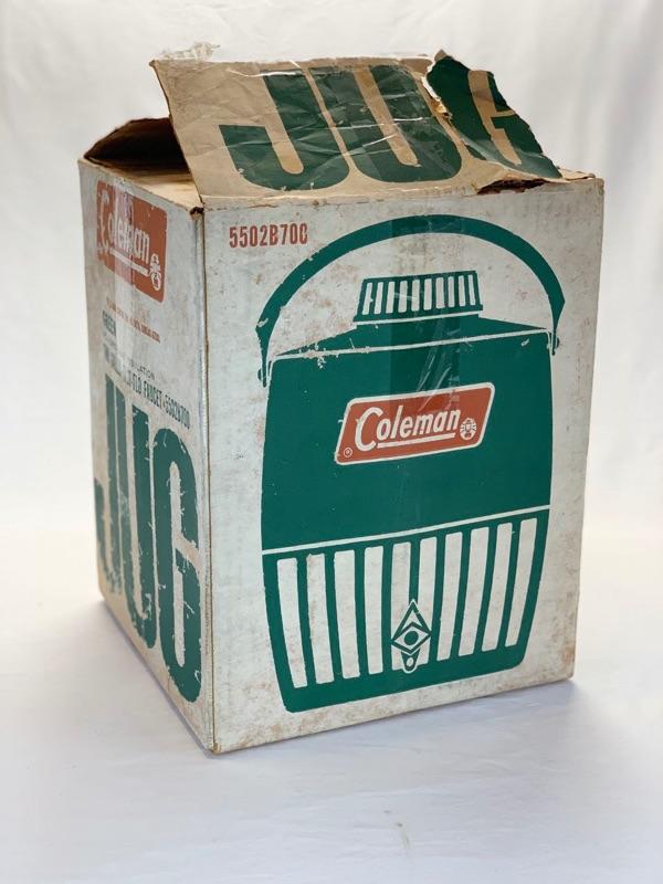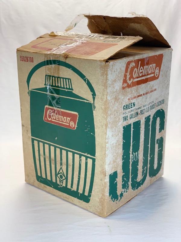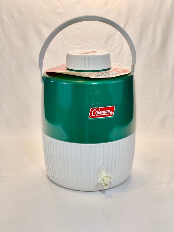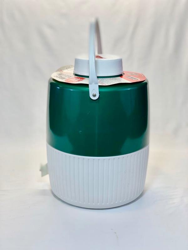 Vintage 2 gallon green and white Coleman insulated jug. Great for picnichs and ball games. Never used in original box. One blemish on side, see photo. Local pickup only.