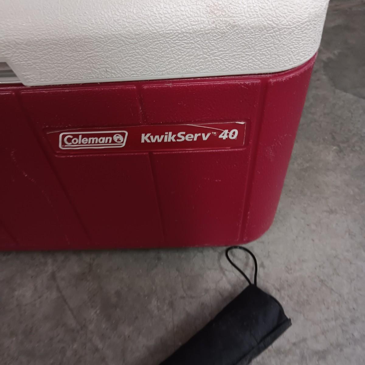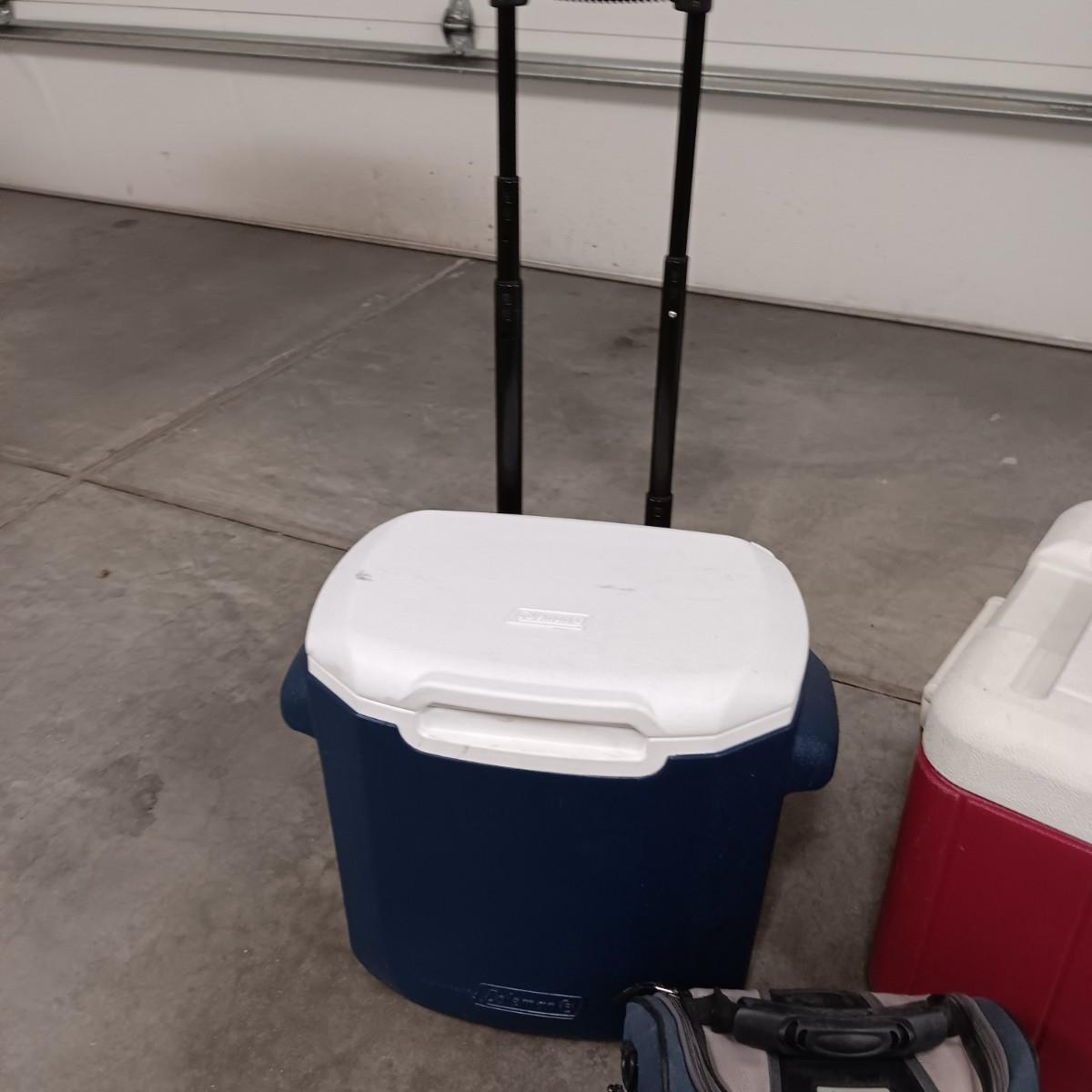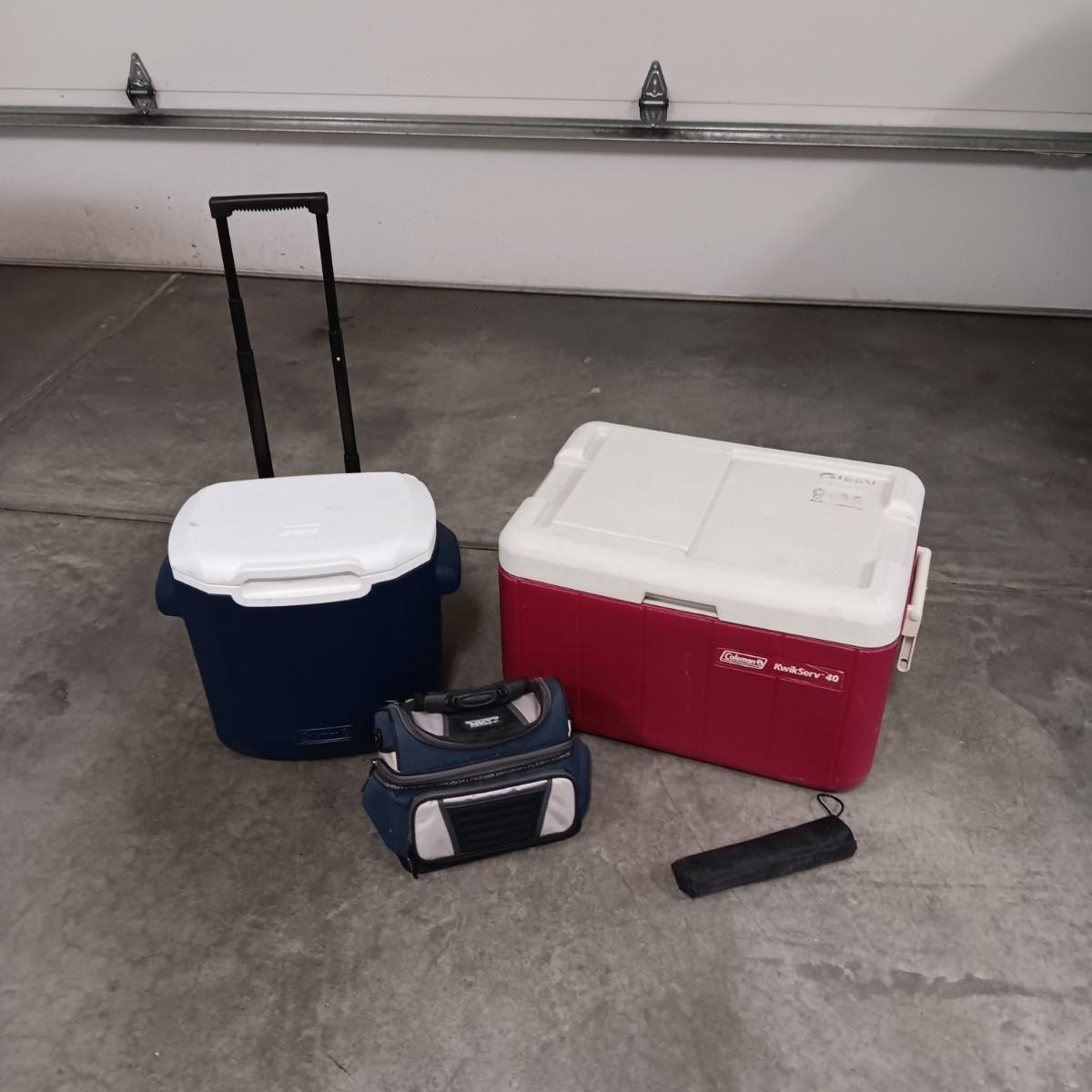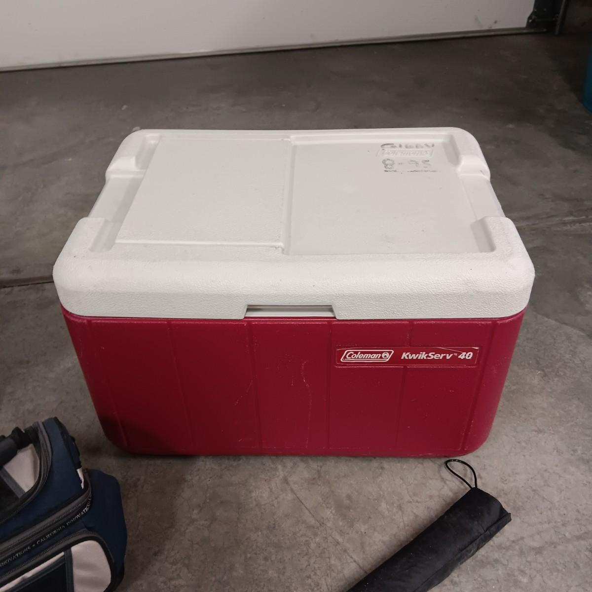 COLEMAN KWIK SERV COOLER AND ANOTHER ON WHEELS PLUS A LUNCH BAG AND UMBRELLA