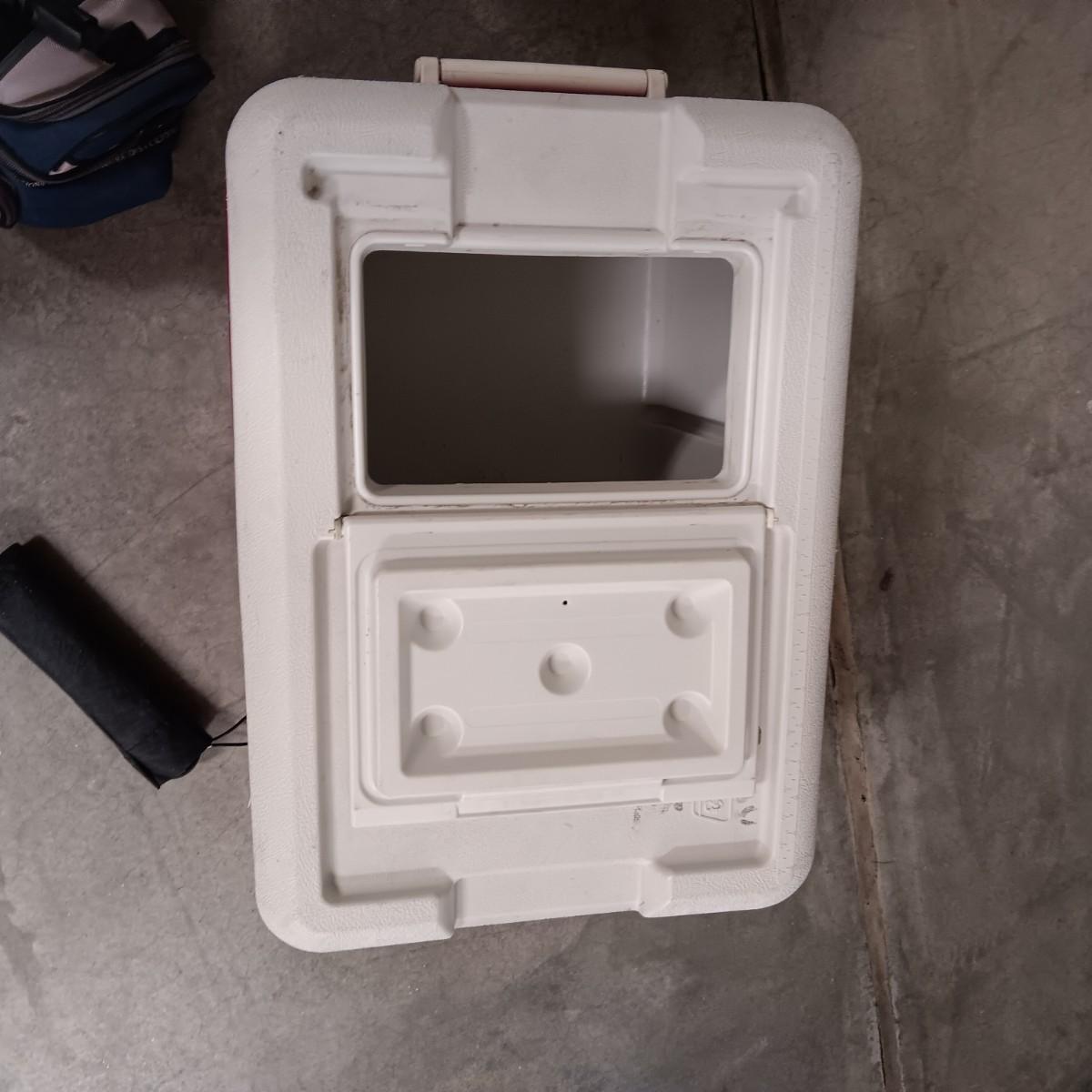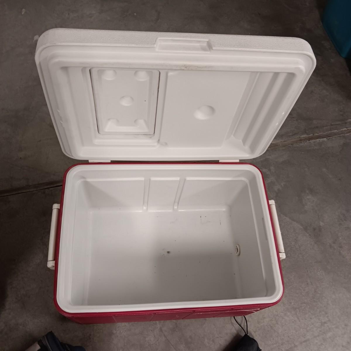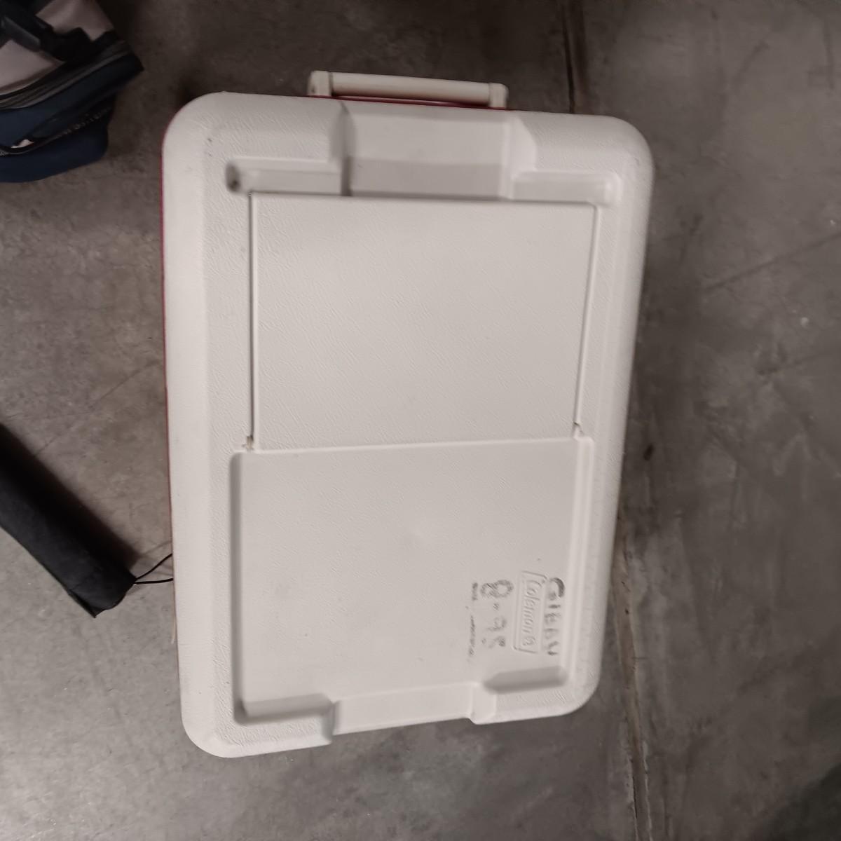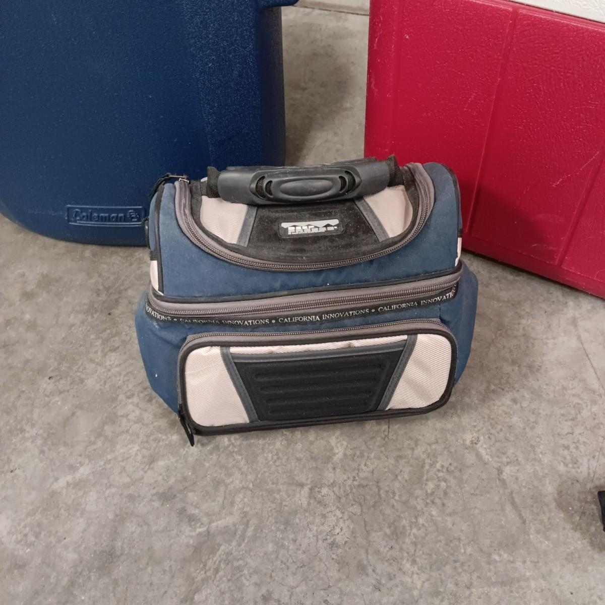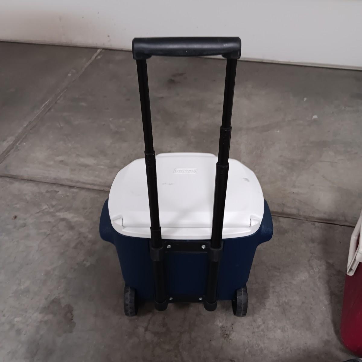 COLEMAN KWIK SERV COOLER AND ANOTHER ON WHEELS PLUS A LUNCH BAG AND UMBRELLA