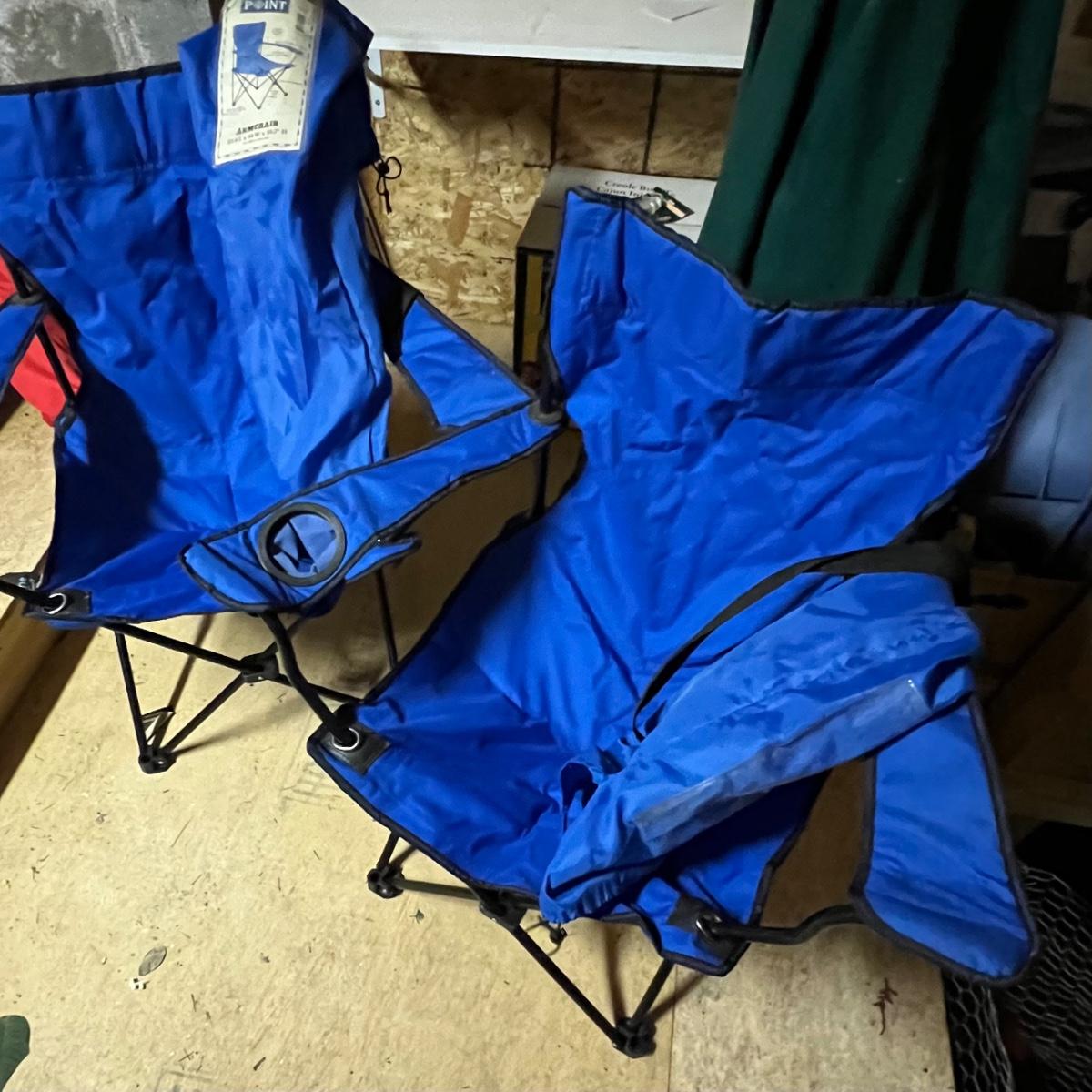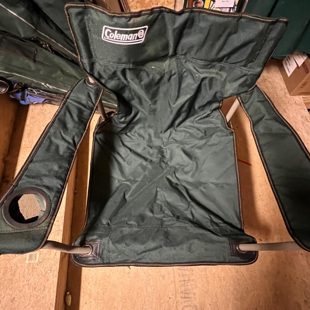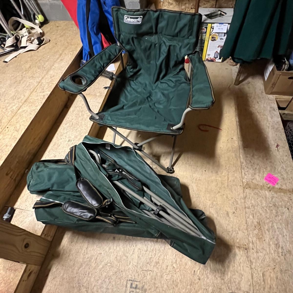 A total of six camping chairs includes four matching dark green Coleman chairs (one chair has no bag) and two blue North Point; see image for measurements. Lot also includes a handy portable stool.