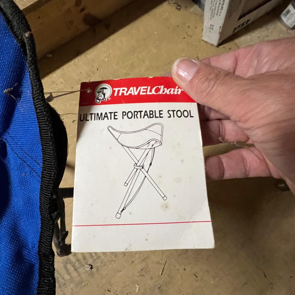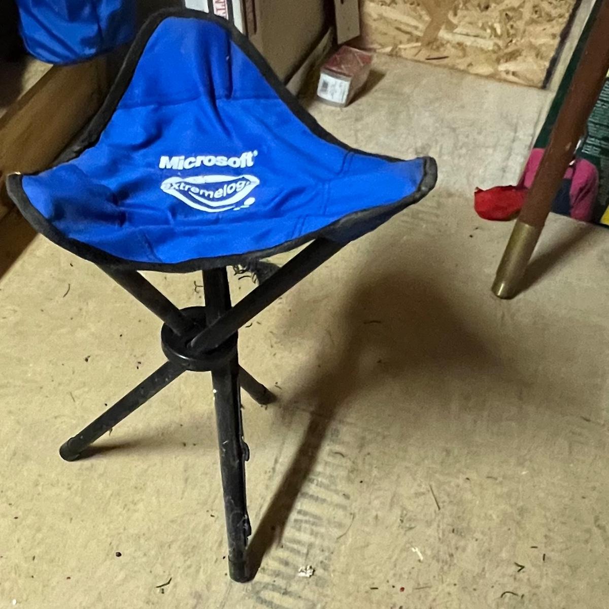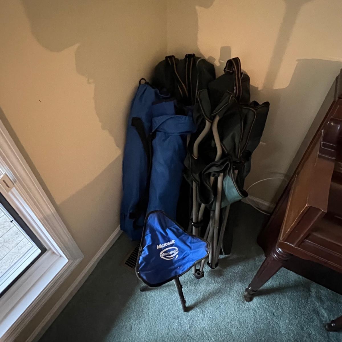 A total of six camping chairs includes four matching dark green Coleman chairs (one chair has no bag) and two blue North Point; see image for measurements. Lot also includes a handy portable stool.