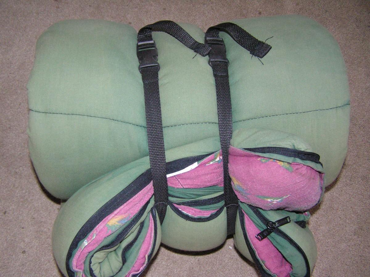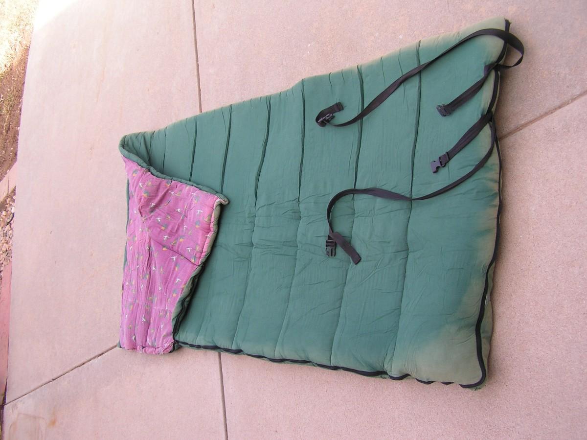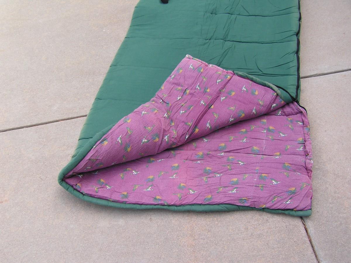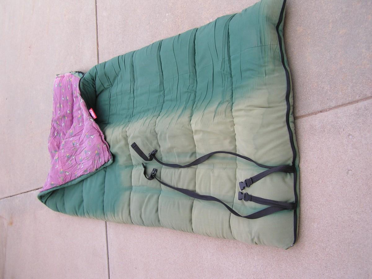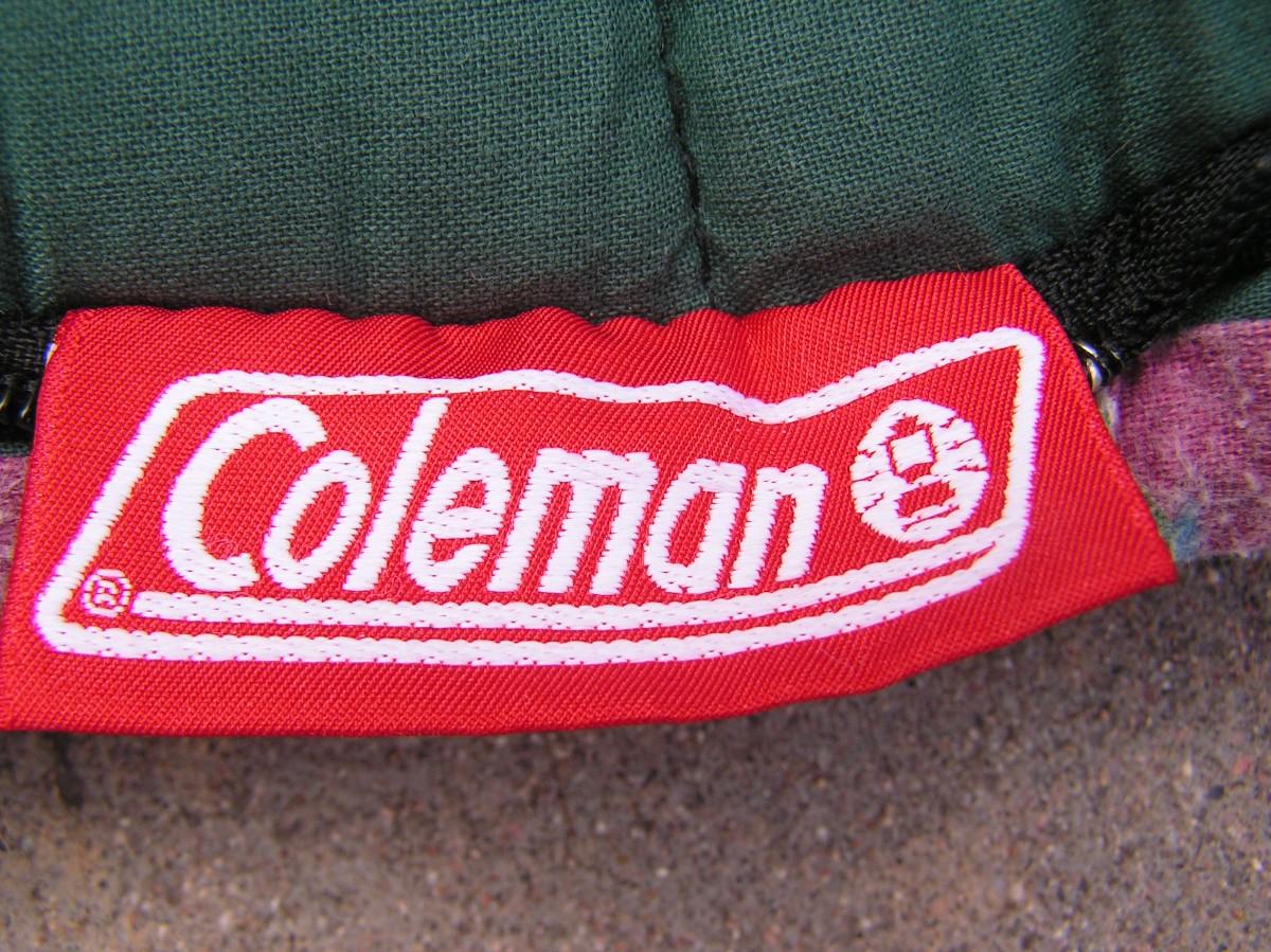 Coleman over sized (big/tall) 3 season 'stay warm' sleeping bag. is 77”x36” zipped. Tested good working zipper has pulls inside & out. Has some fading in areas due to not having a stuff bag but fabric is still strong. Exterior is light denim type fabric & inside is cotton flannel. Tie straps w/buckles are sewn on. Good clean, sturdy bag with years of usable life remaining.