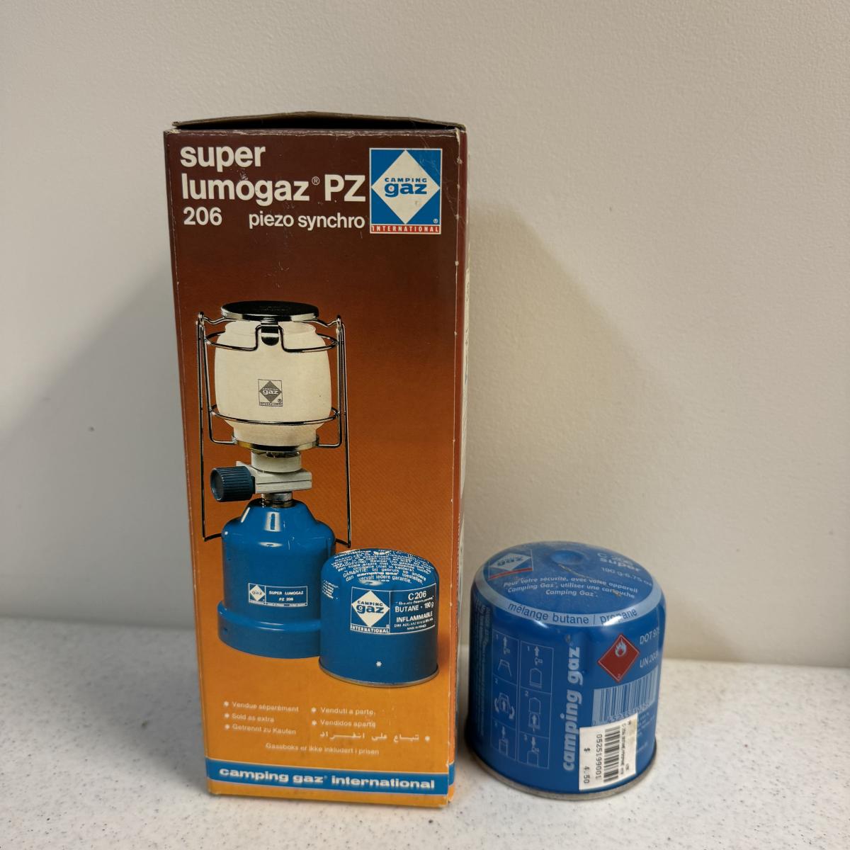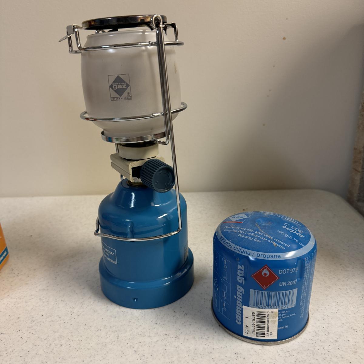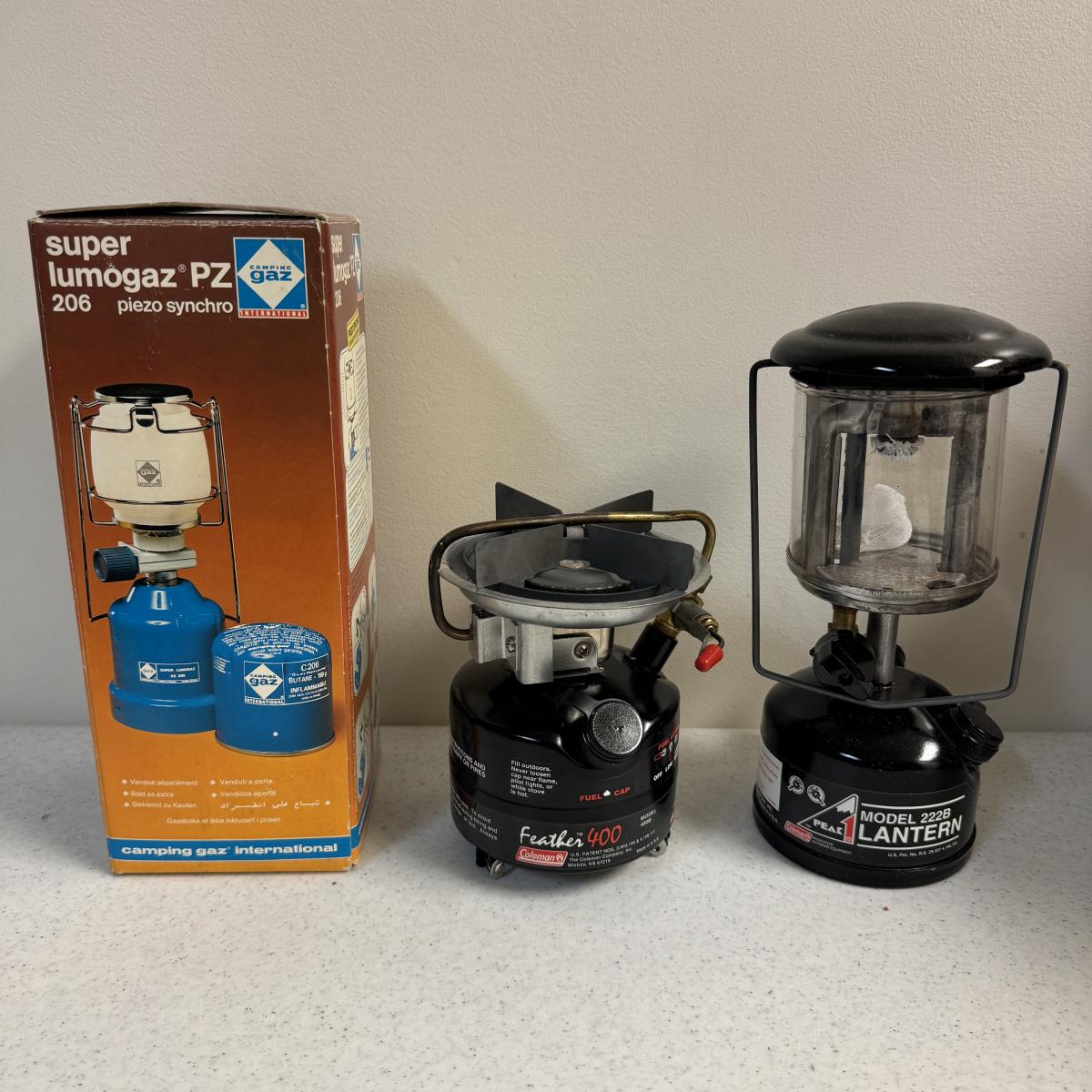 Lot includes a Coleman Peak camp stove Feather 400 with storage bag. The other is a Coleman Peak Model 222B Lantern with storage bag. All parts are photographed. Lot also includes a Super Lumogaz PZ 206 gas lantern. Box instructions are written in another language. Also has an unused propane that goes with it. Local pick up only.