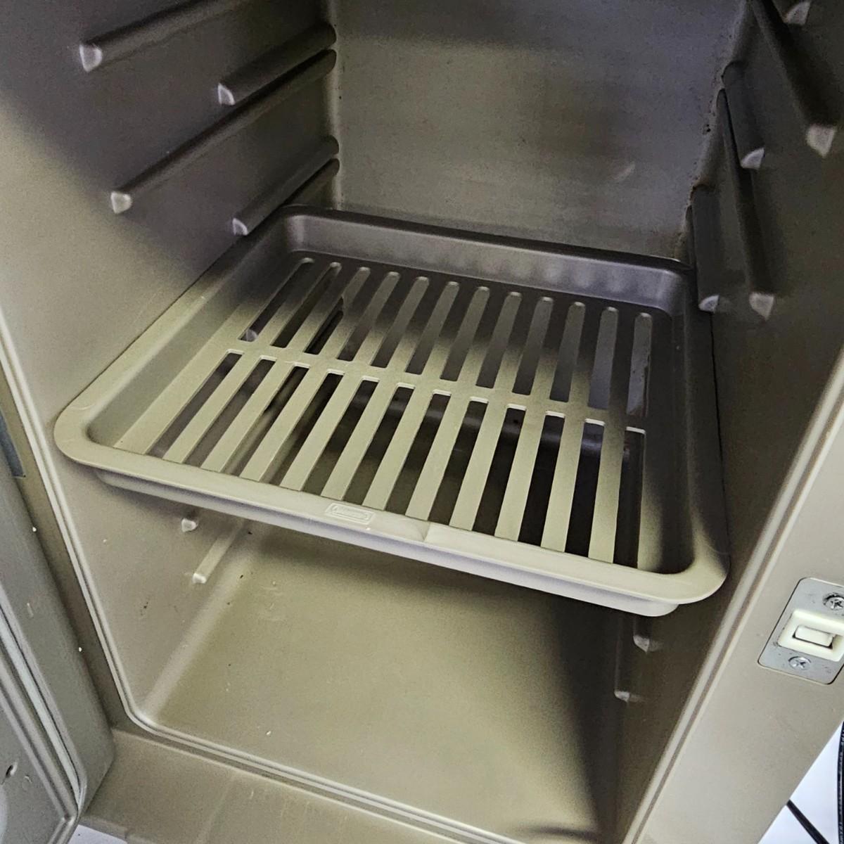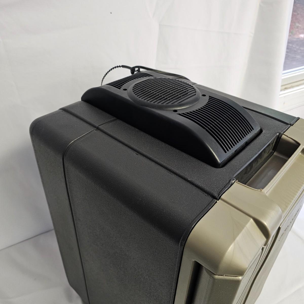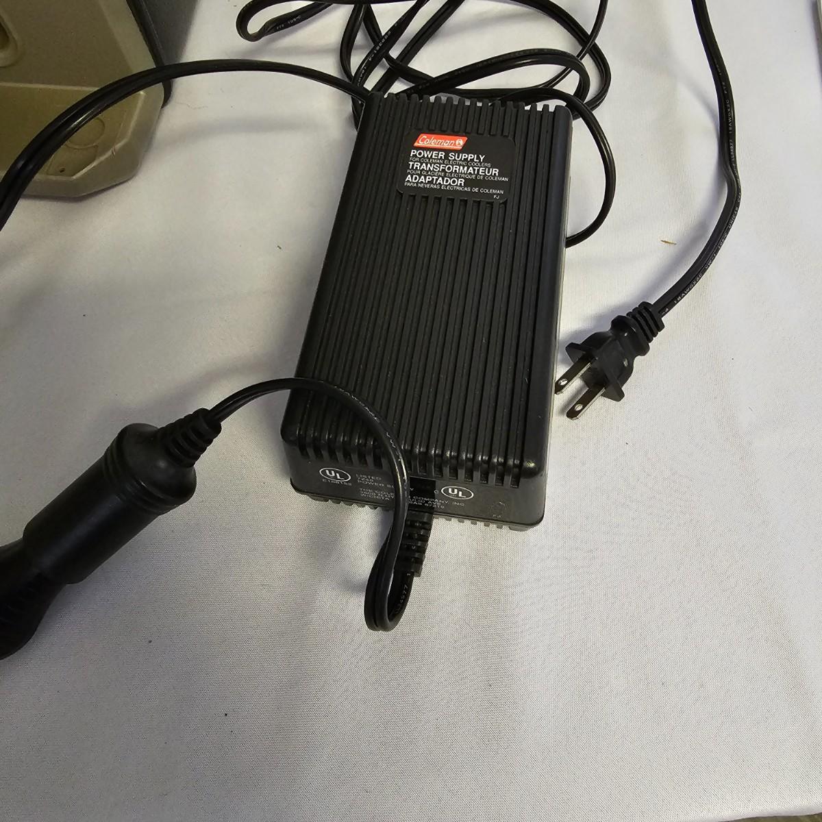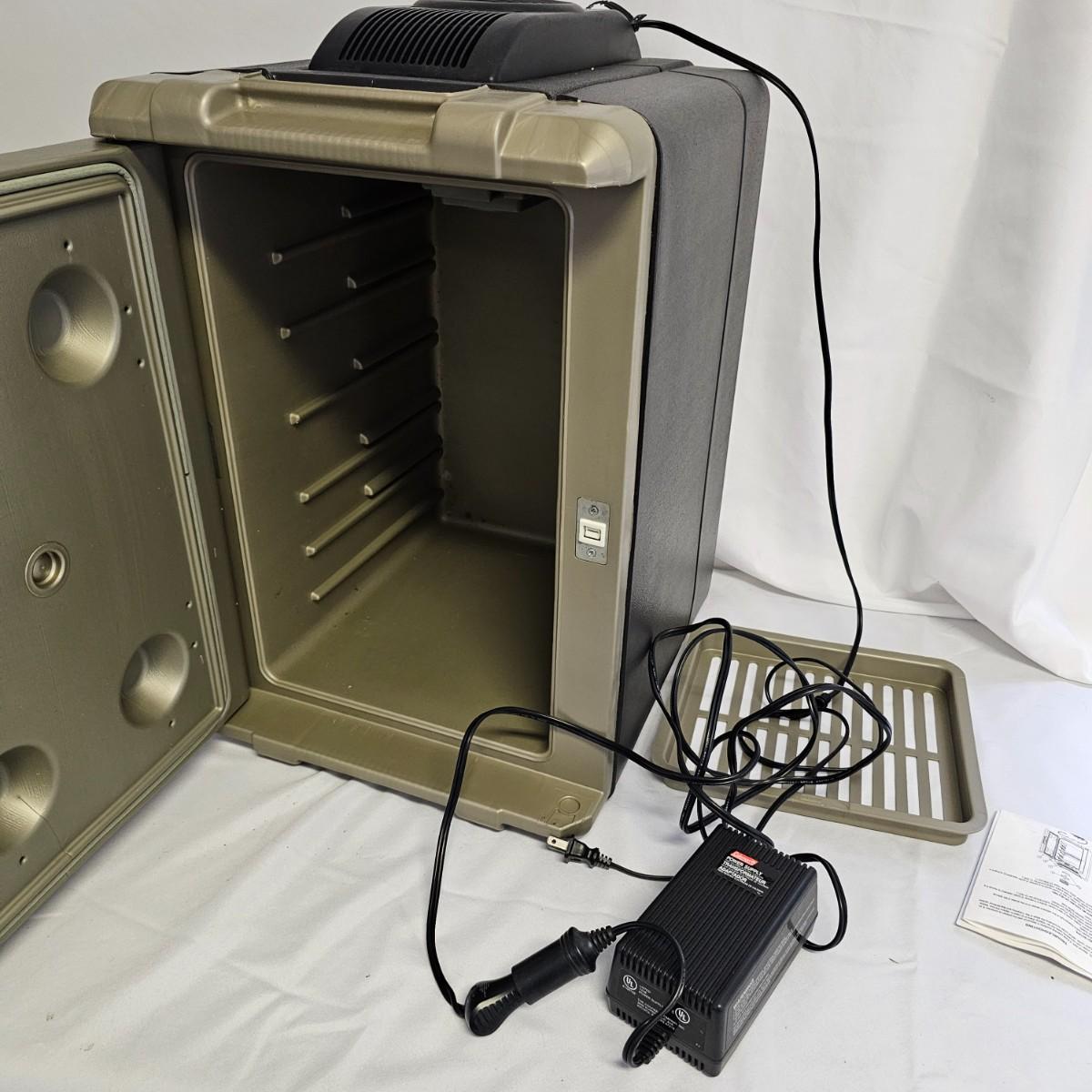 A portable cooler for home or vehicle use, this Coleman will run on 12 volts DC or 120 volts AC, with included power supply. Has one internal tray and instructions. Unit measures 15" x 17" x 24"H, has all plastic body. Unit powered on when plugged in. See photos for details. Shipping available.
