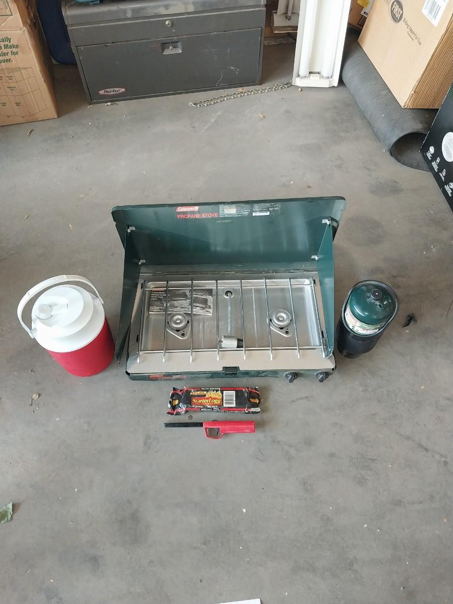 COLEMAN PROPANE CAMPING STOVE-PROPANE BOTTLE- WATER JUG AND MORE