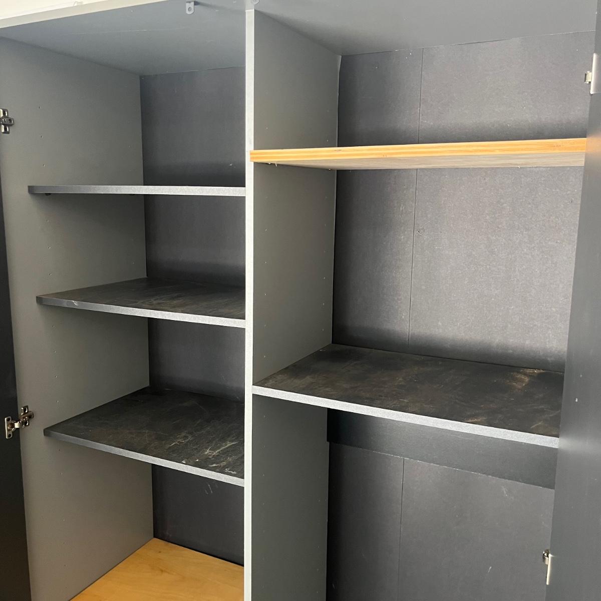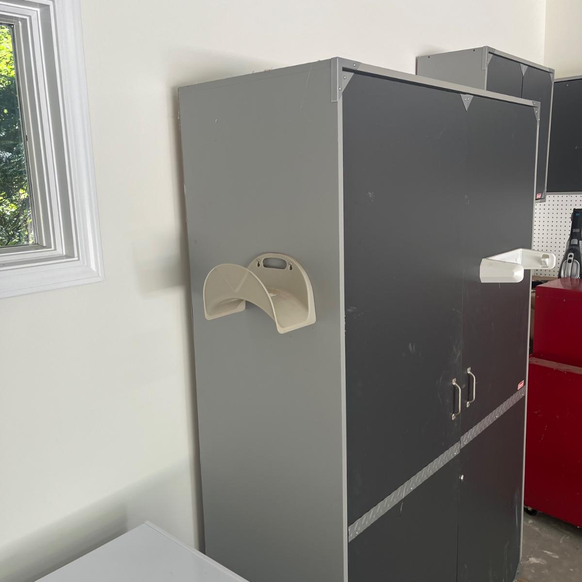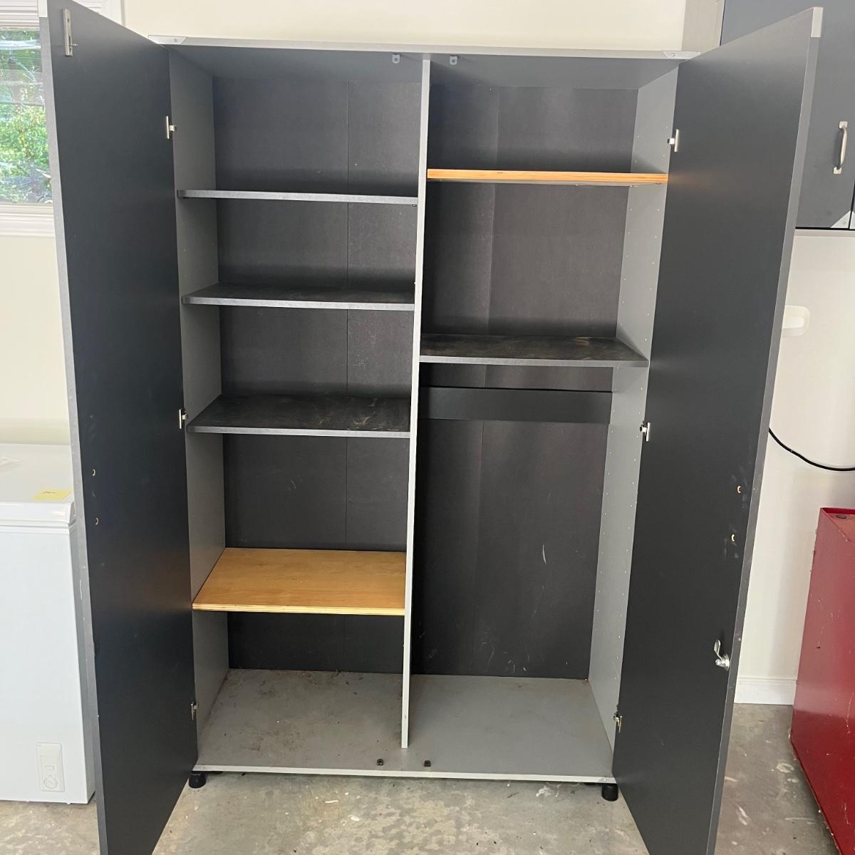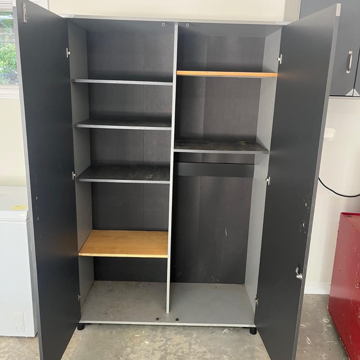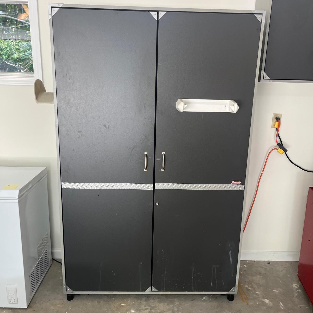 Lot includes a Coleman storage cabinet with six adjustable shelves. Cabinet measures 19.5” x 47.5” x 75.5”H. Cabinet has some minor scratches and nicks. Cabinet is pressed wood. Also includes keys.