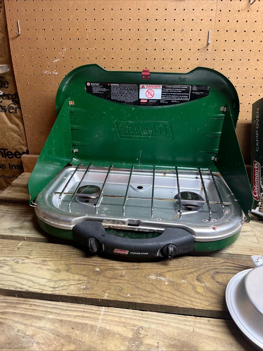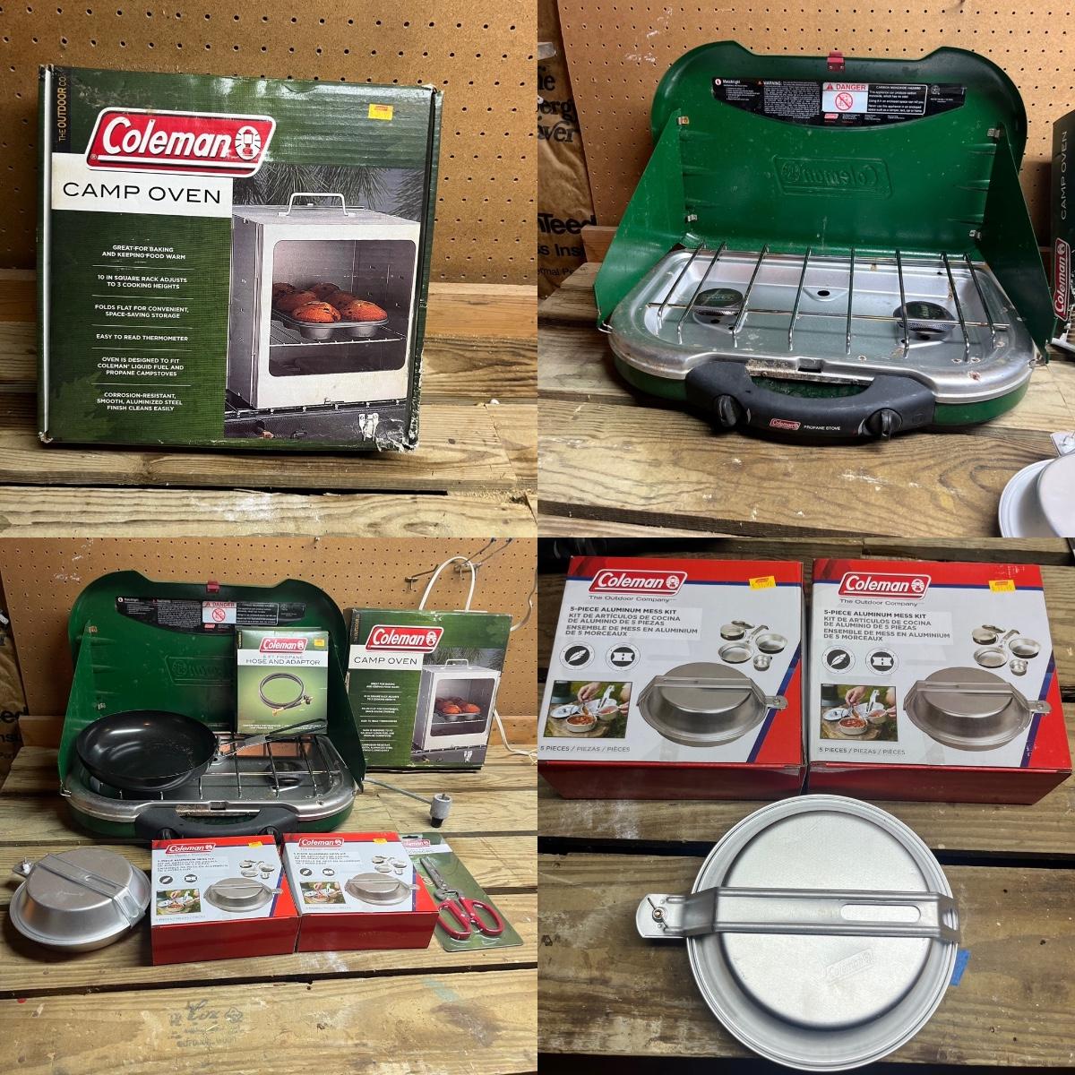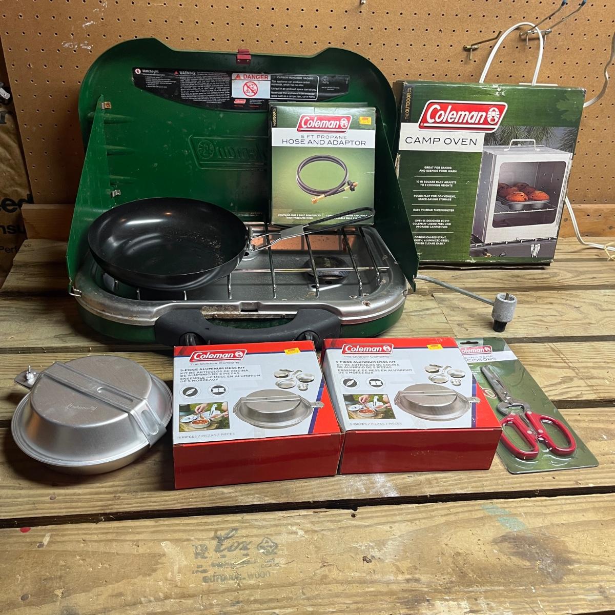 Lot includes a Coleman two burner propane stove, NIB camp oven, three mess kits, folding skillet, propane hose and adapter and camp scissors. Stove measures 21” x 15” x 4” when closed.
