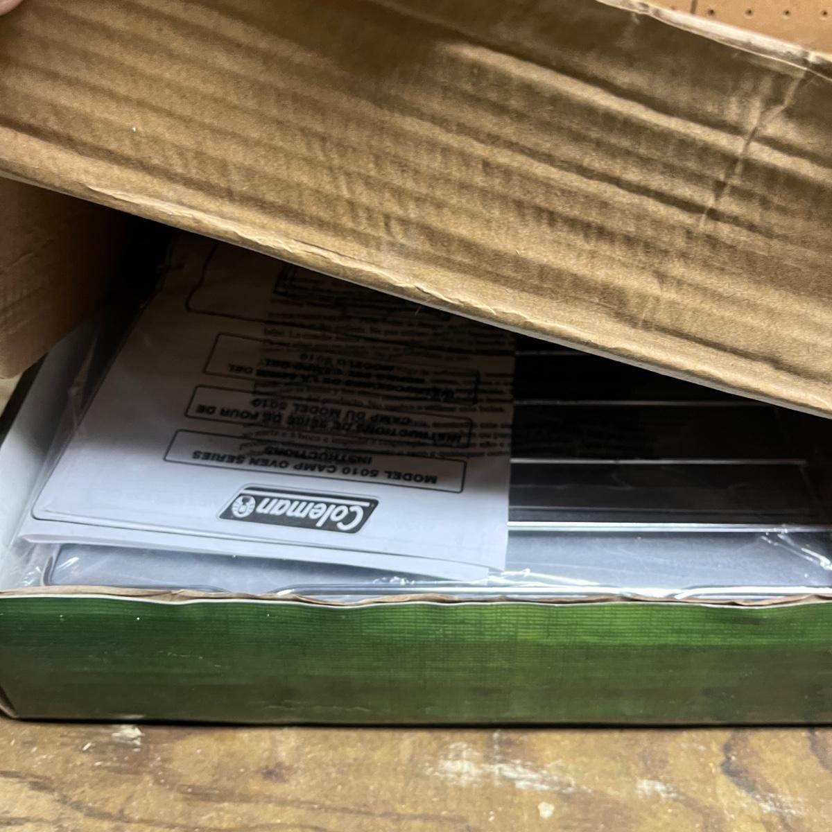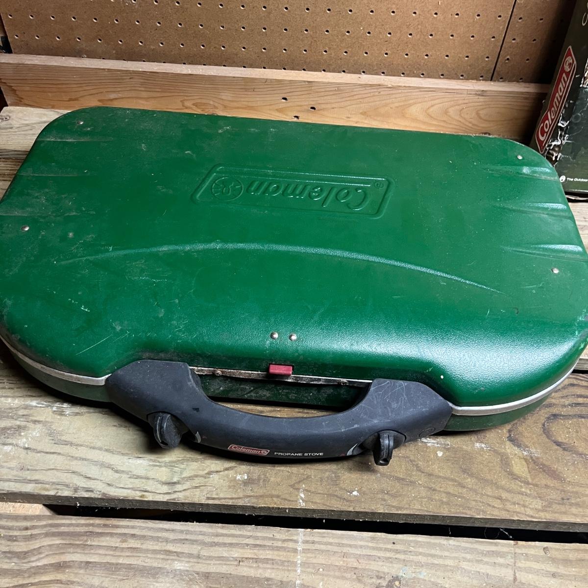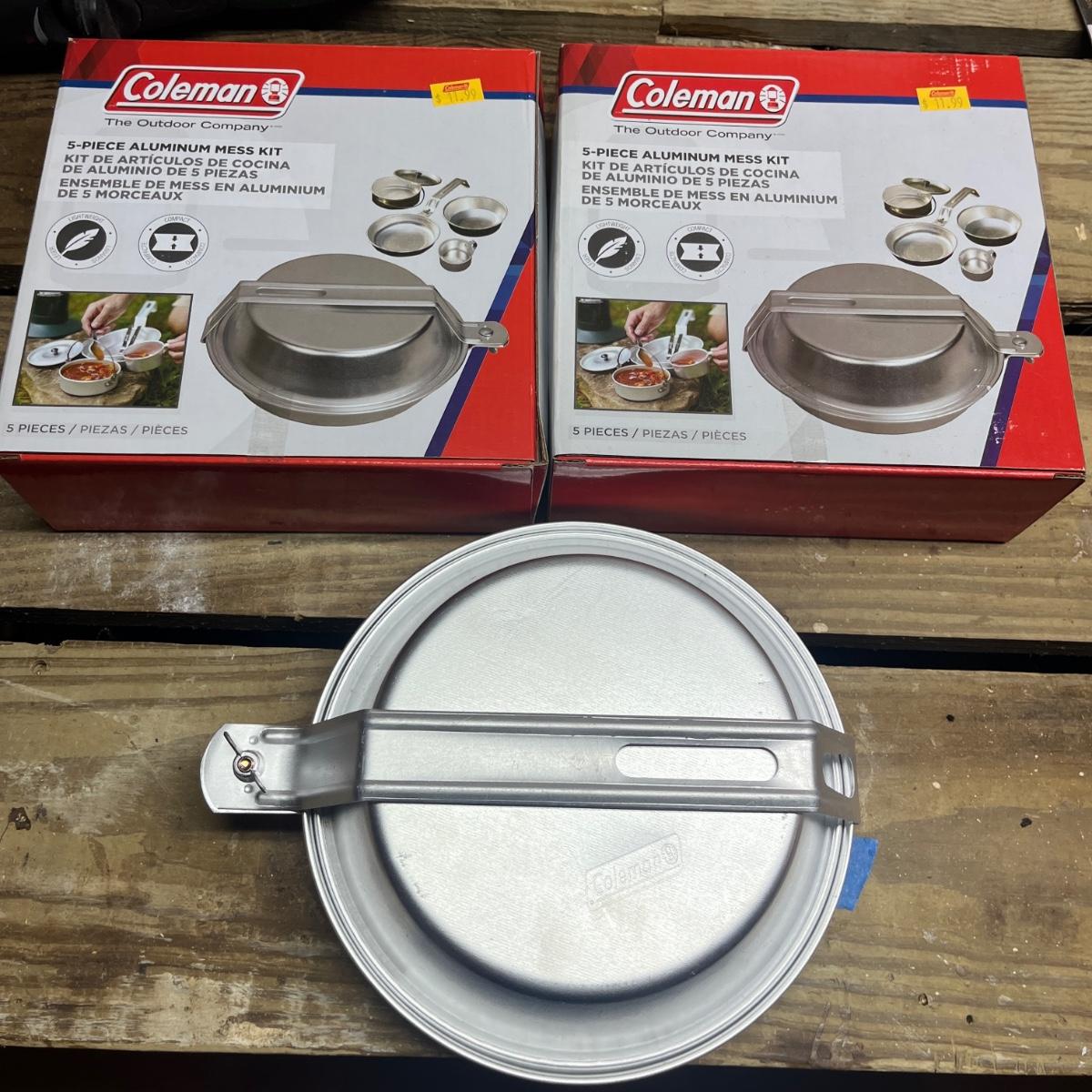 Lot includes a Coleman two burner propane stove, NIB camp oven, three mess kits, folding skillet, propane hose and adapter and camp scissors. Stove measures 21” x 15” x 4” when closed.