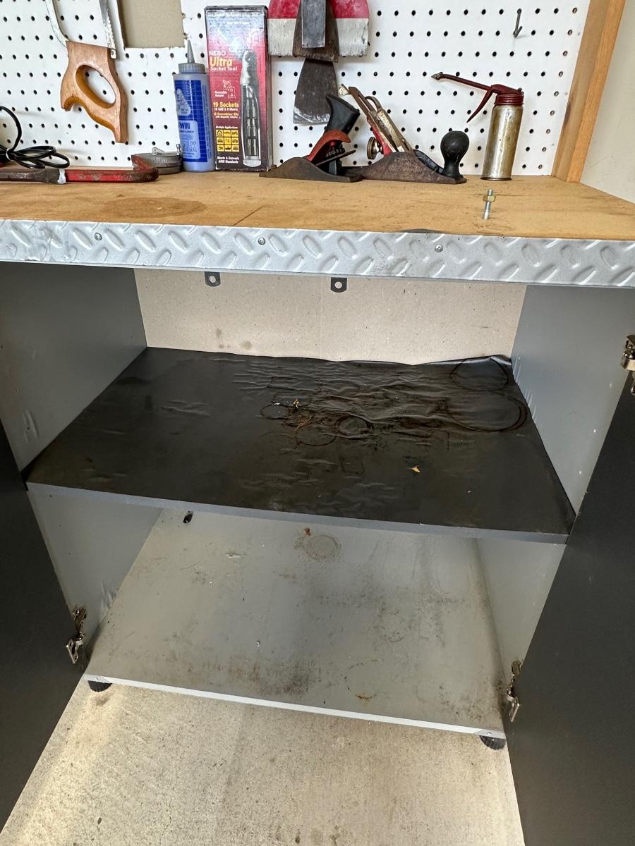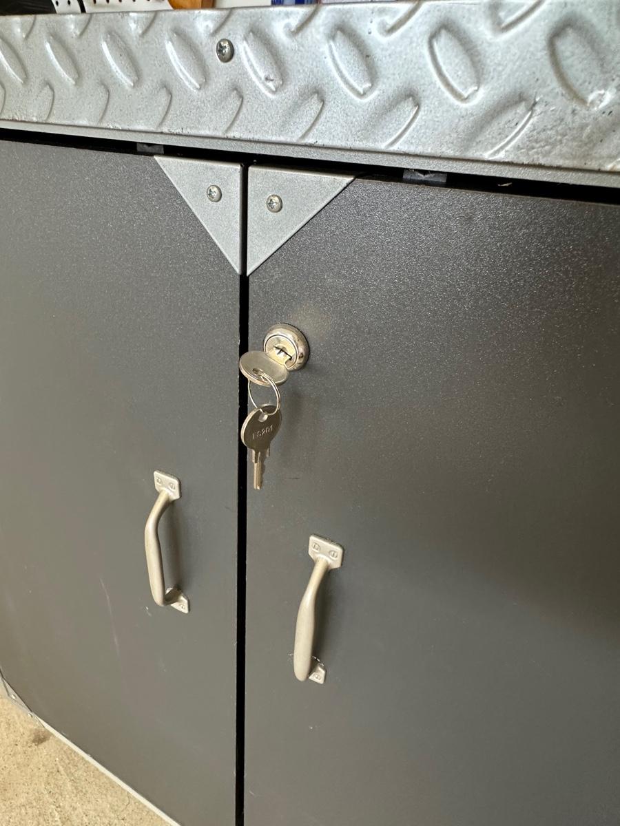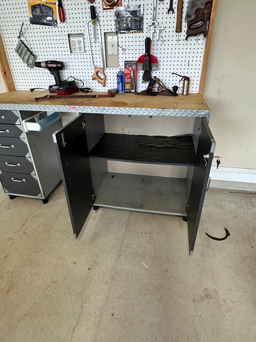 Ok ~ What you see, is what you get. Some disassembling is required ~ Work bench has been well used, see top. Also the interior of the cabinet will need some new lining (see photo) ~ cabinet door does has lock and key ~ All drawers slide easily ~ 34” H to top of table - 63” W x 21” D ~ back board is 47” H from top of table surface ~