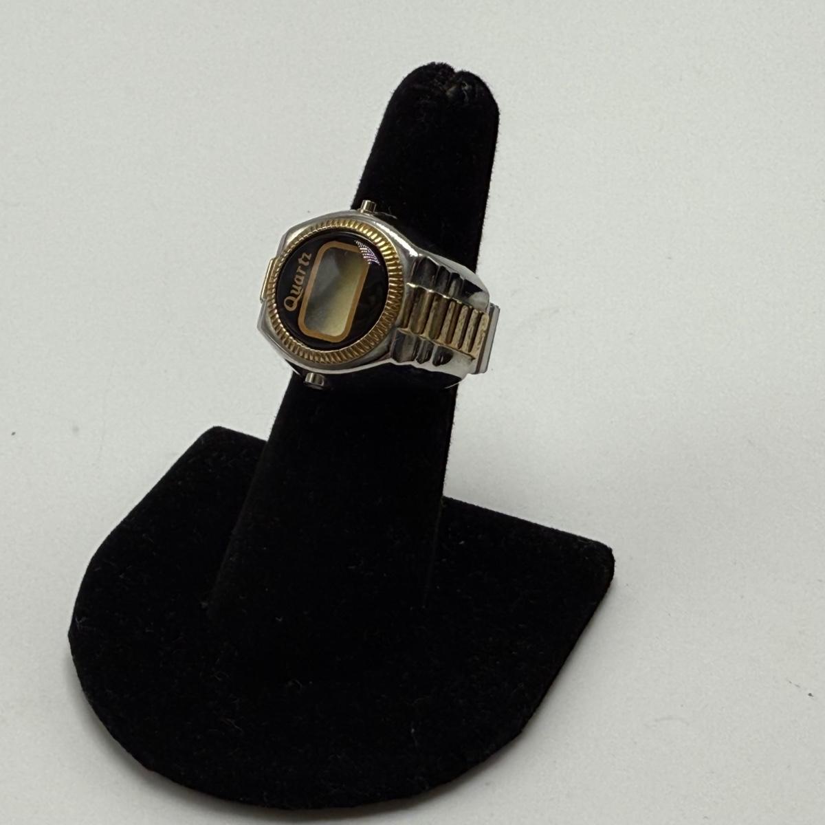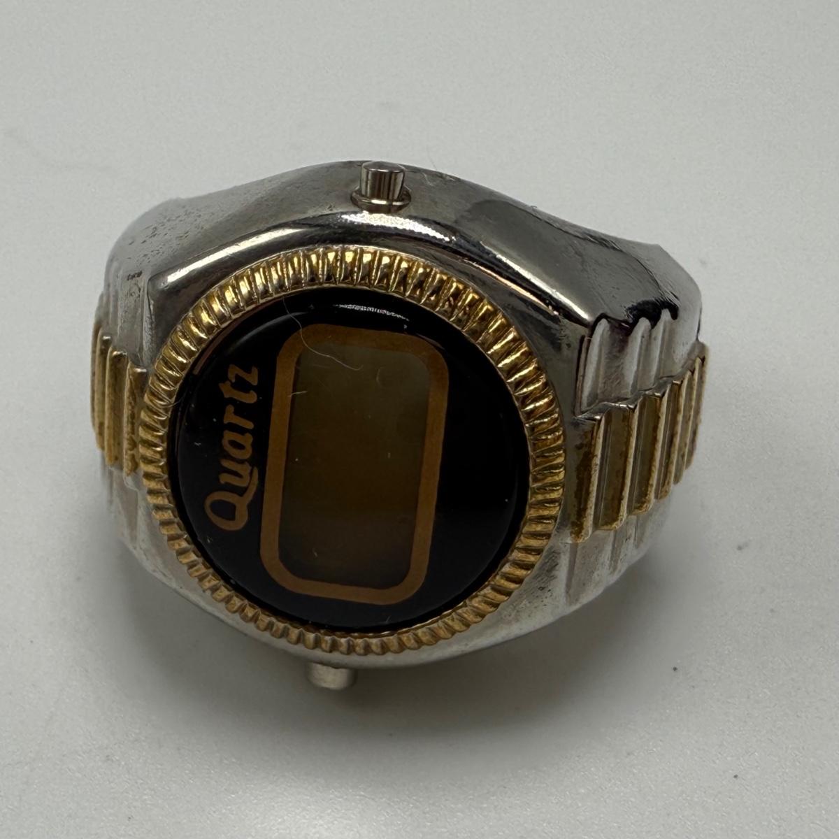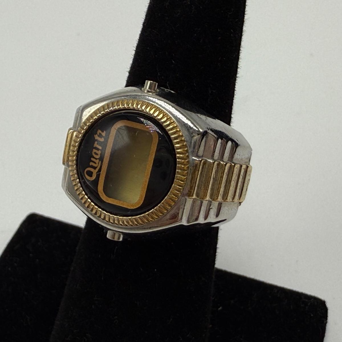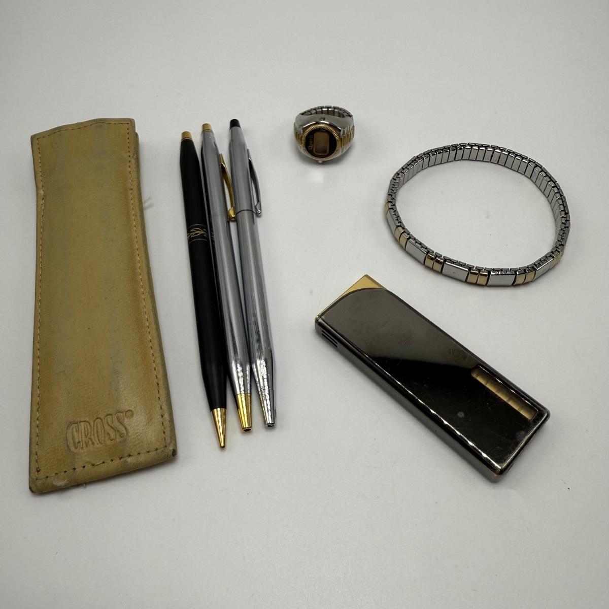 This lot contains a vintage style refillable Colibri lighter, a quartz ring watch, a bracelet, and two Cross brand pens with one Cross mechanical pencil with a leather case. The lighter is 1” x 0.25” x 2.75". The ring watch is not currently functioning.