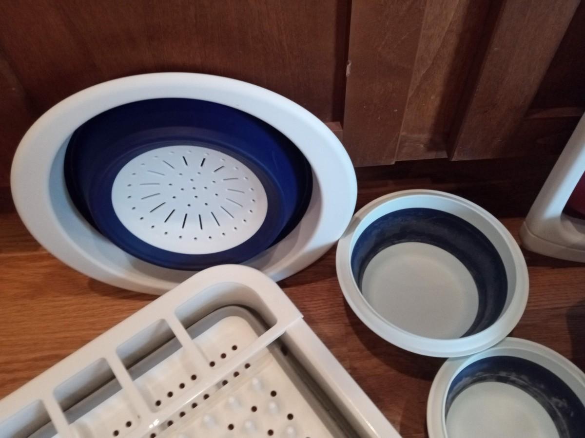 SEVERAL SIZE BOWLS, COLLANDERS, DISH DRYER