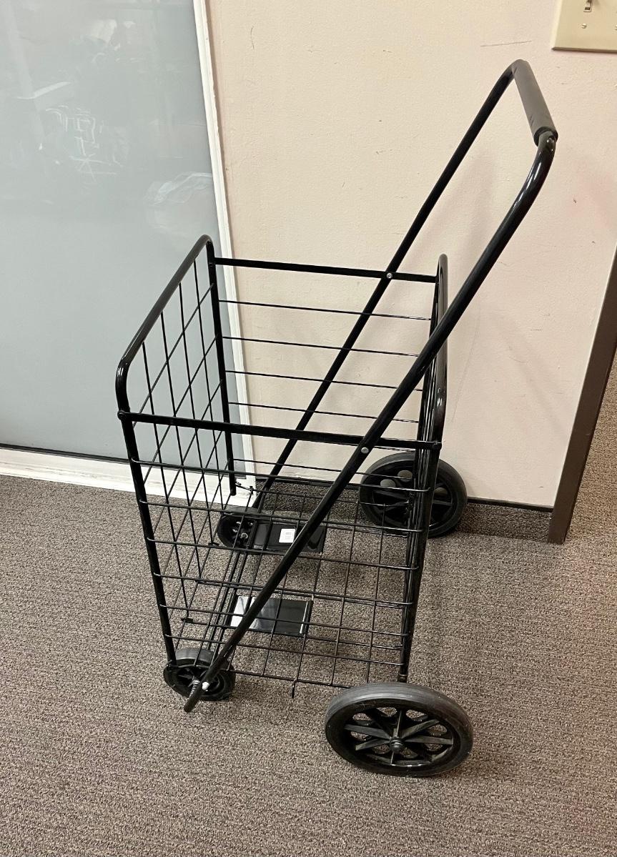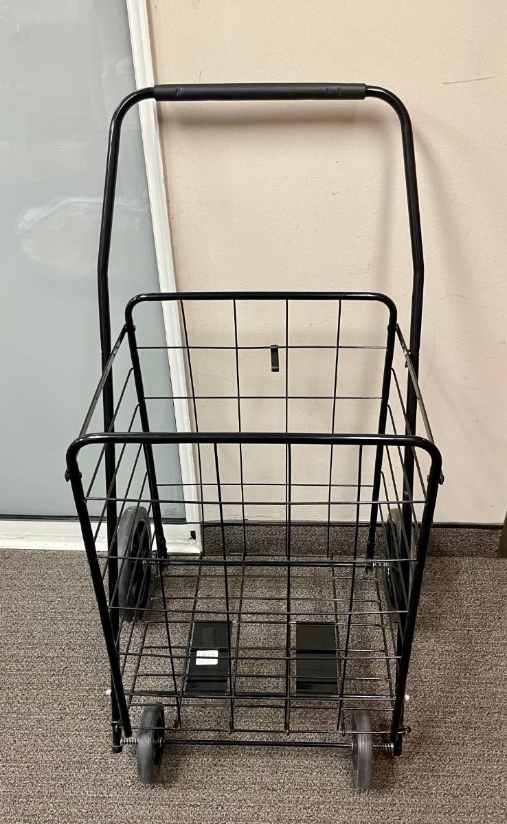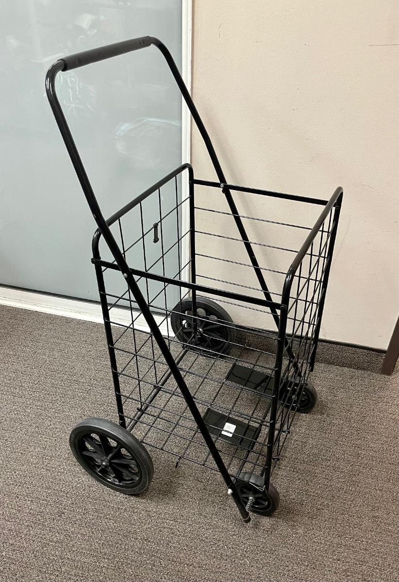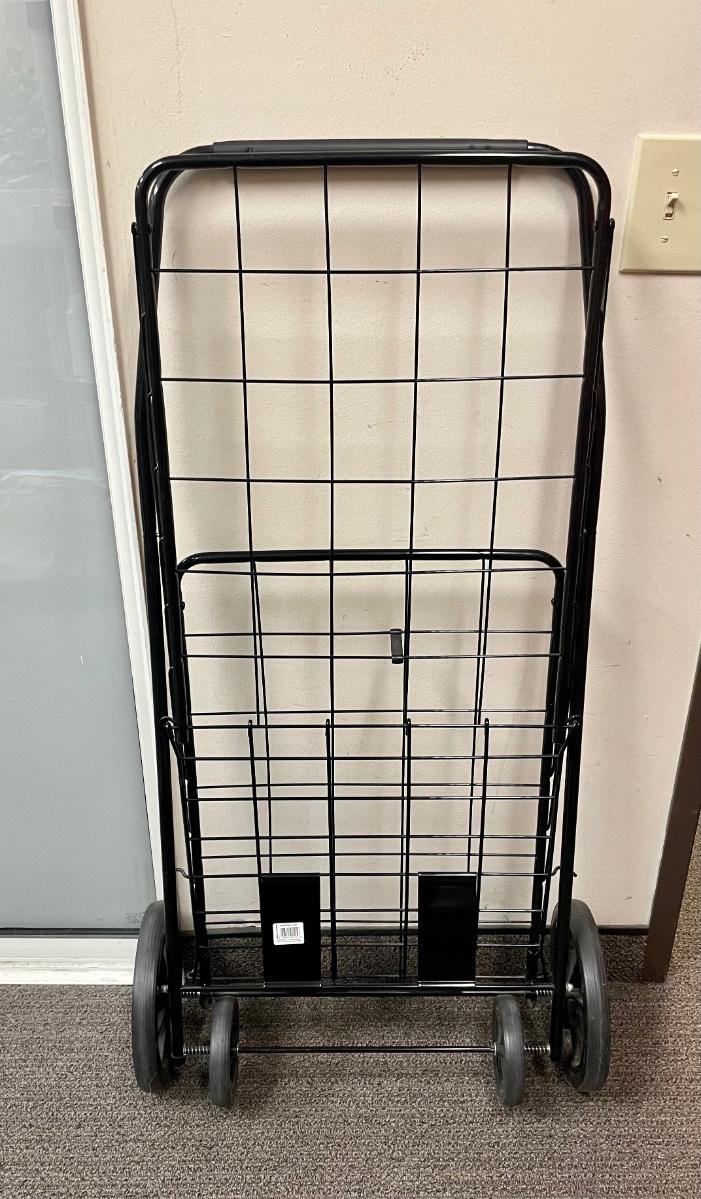 lapsible Metal Shopping Cart with Wheels. Very clean, near new condition. Approx. 40” height at handle. See photos for other dimensions.