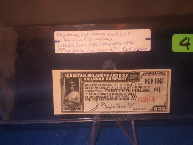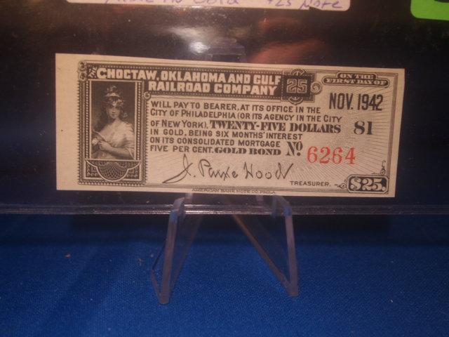 Choctaw Oklahoma Gulf Railroad 25 dollar Gold Note Collectable note Issued in the late 1800's Payable in Gold in November of 1942