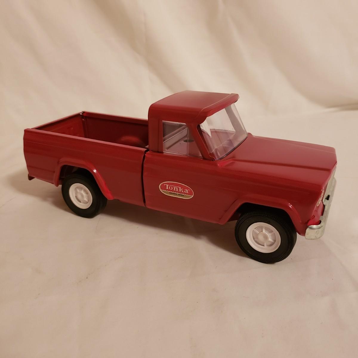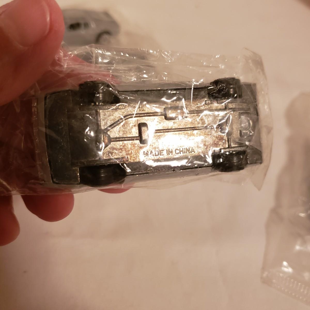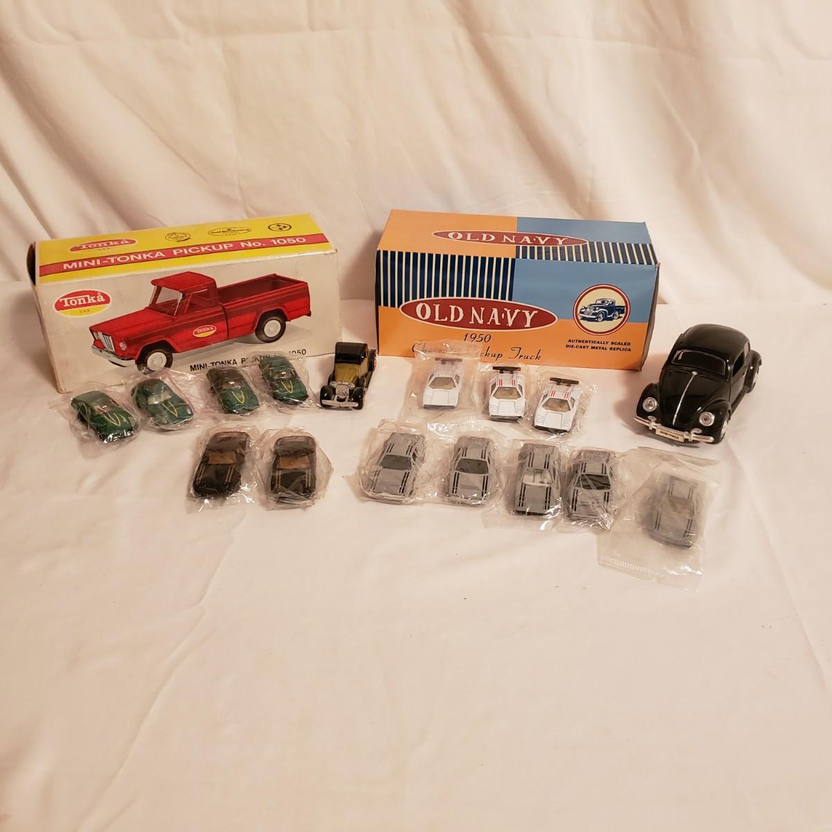 This is a lot of collectable cars! The Tonka pickup no. 1050 is all metal with rubber tires and comes in the original box. The truck measures 3" x 9" x 4"H. The Old Navy truck is a 1950 Chevrolet also die-cast metal in original box. The cars still in plastic are made in China. The black Beatle is metal with plastic undercarriage. The Cadillac no. 309 is plastic.