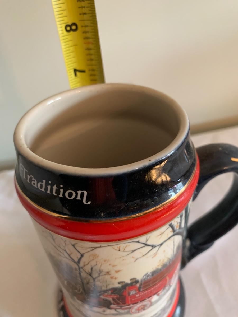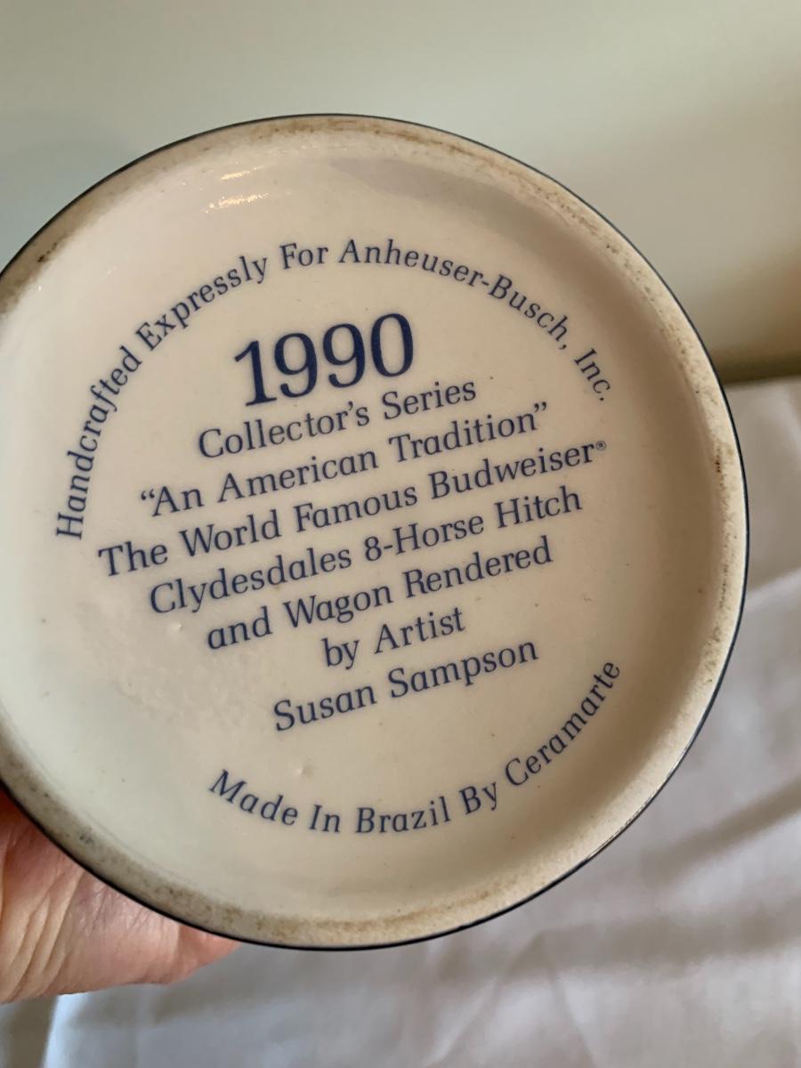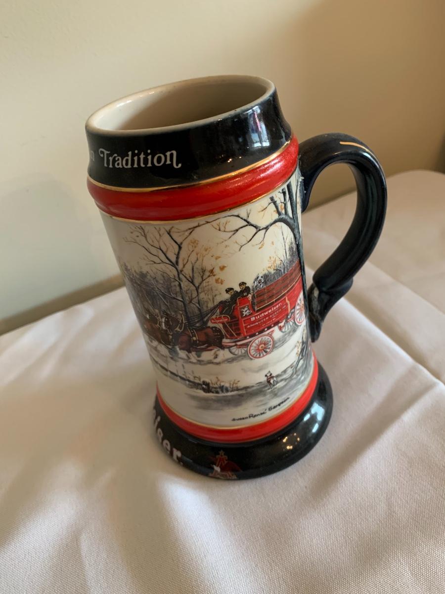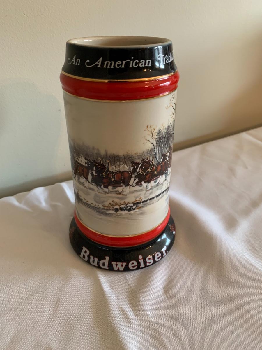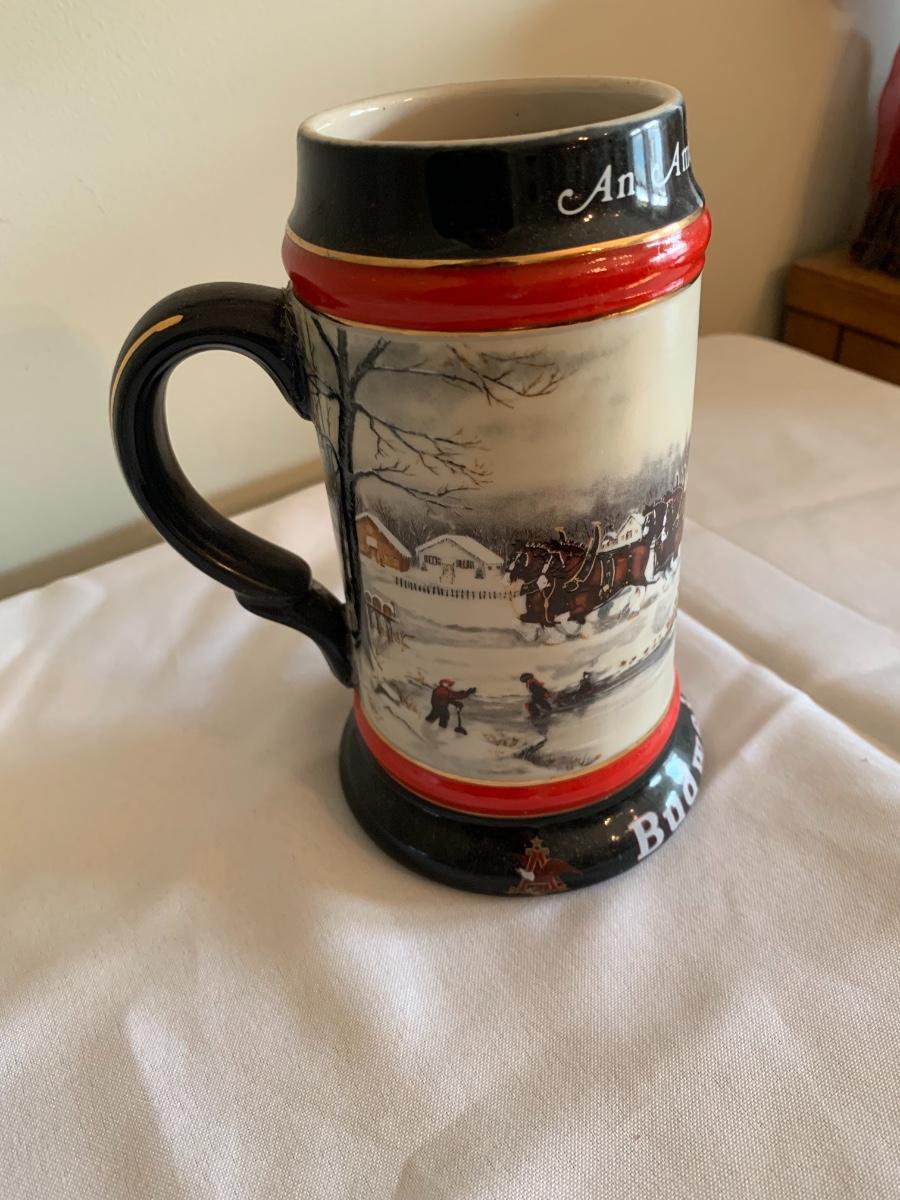 This vintage 1990 Budweiser beer stein features a traditional Christmas scene by artist Susan Sampson