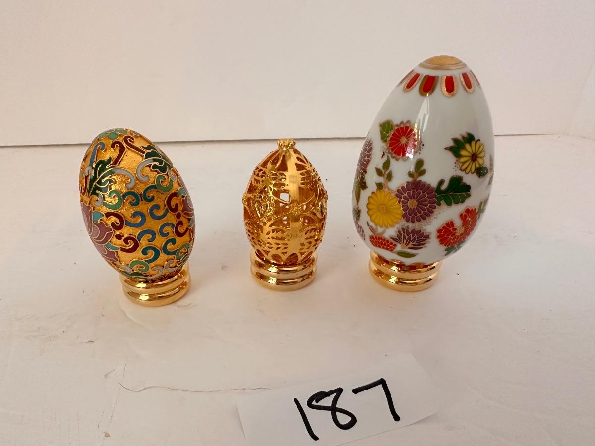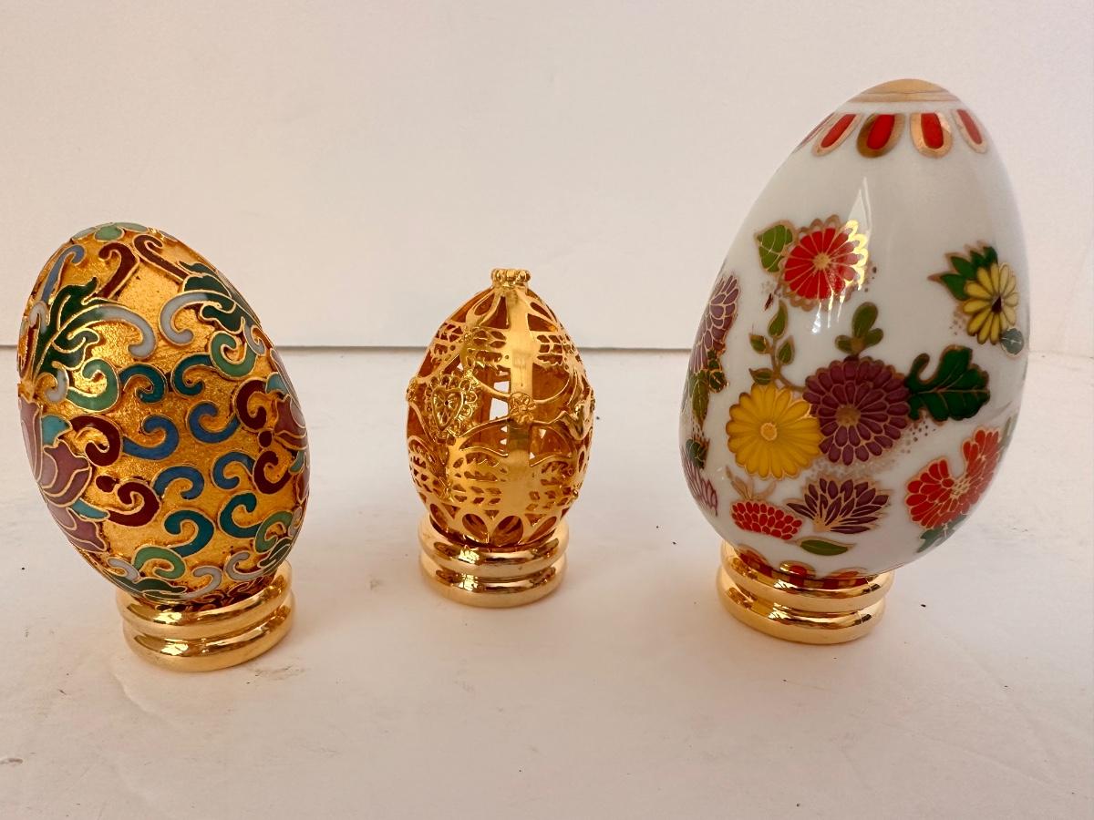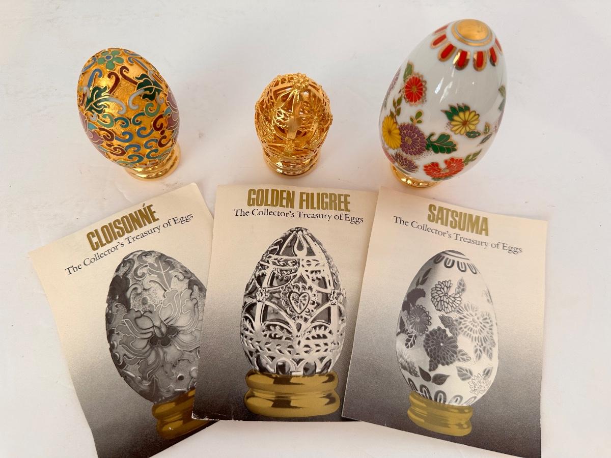COLLECTABLE EGG FIGURINE LOT AS PICTURED CLOISONNE, GOLDEN FILIGREE, SATSUMA, THE COLLECTOR'S TREASURY OF EGGS