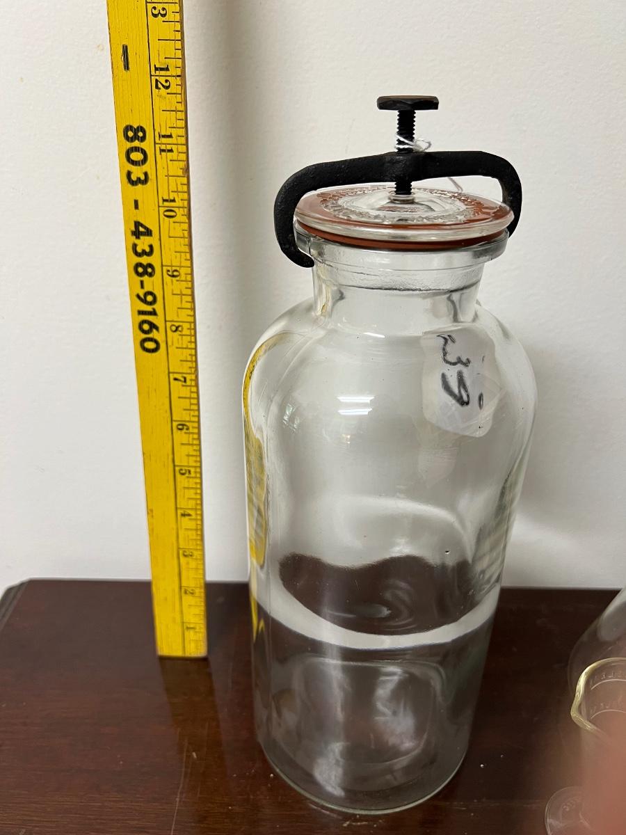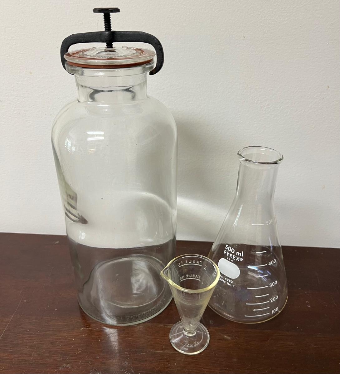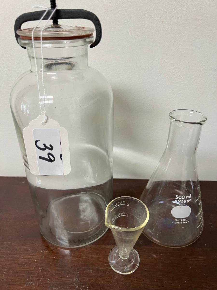 collectable pyrex measuring cups and antique glass apothecary jar w/ clamp