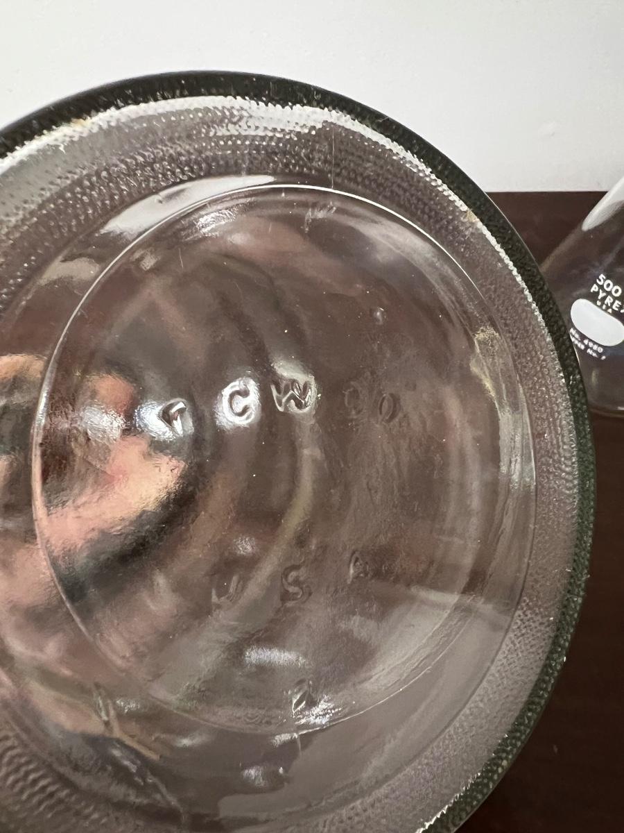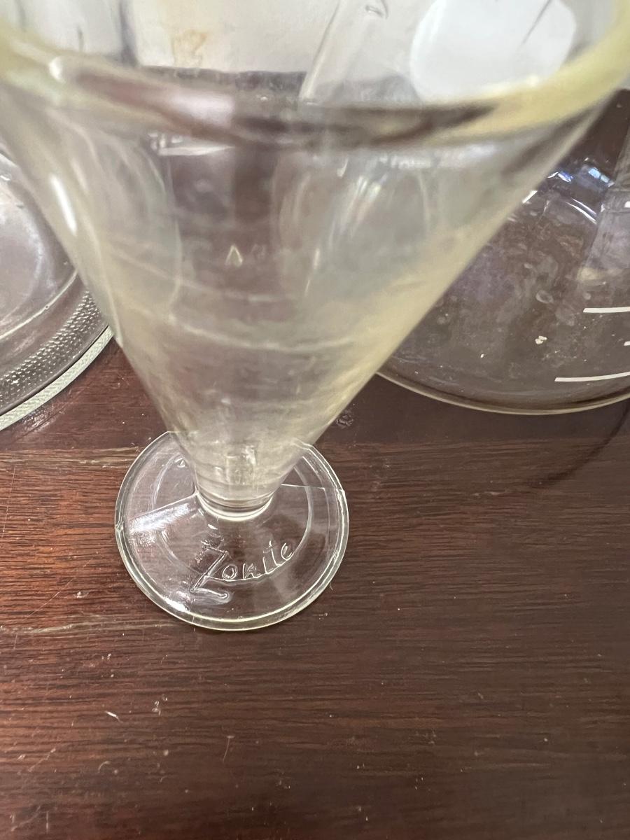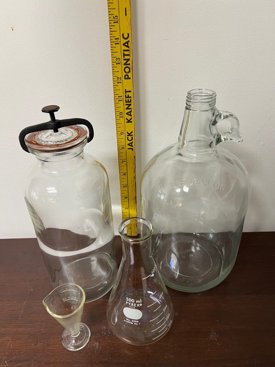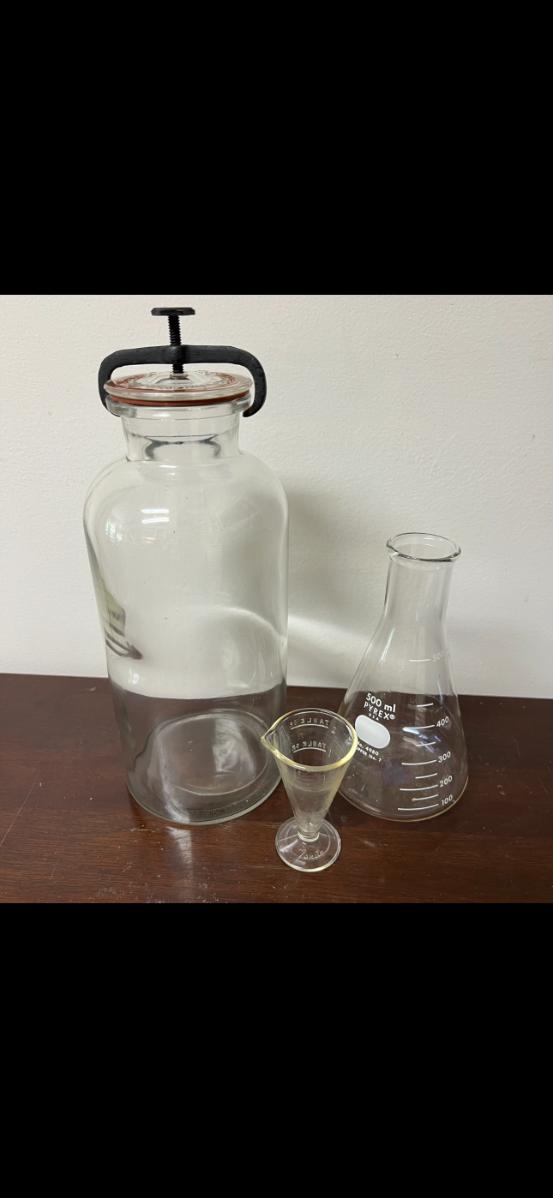 collectable pyrex measuring cups and antique glass apothecary jar w/ clamp