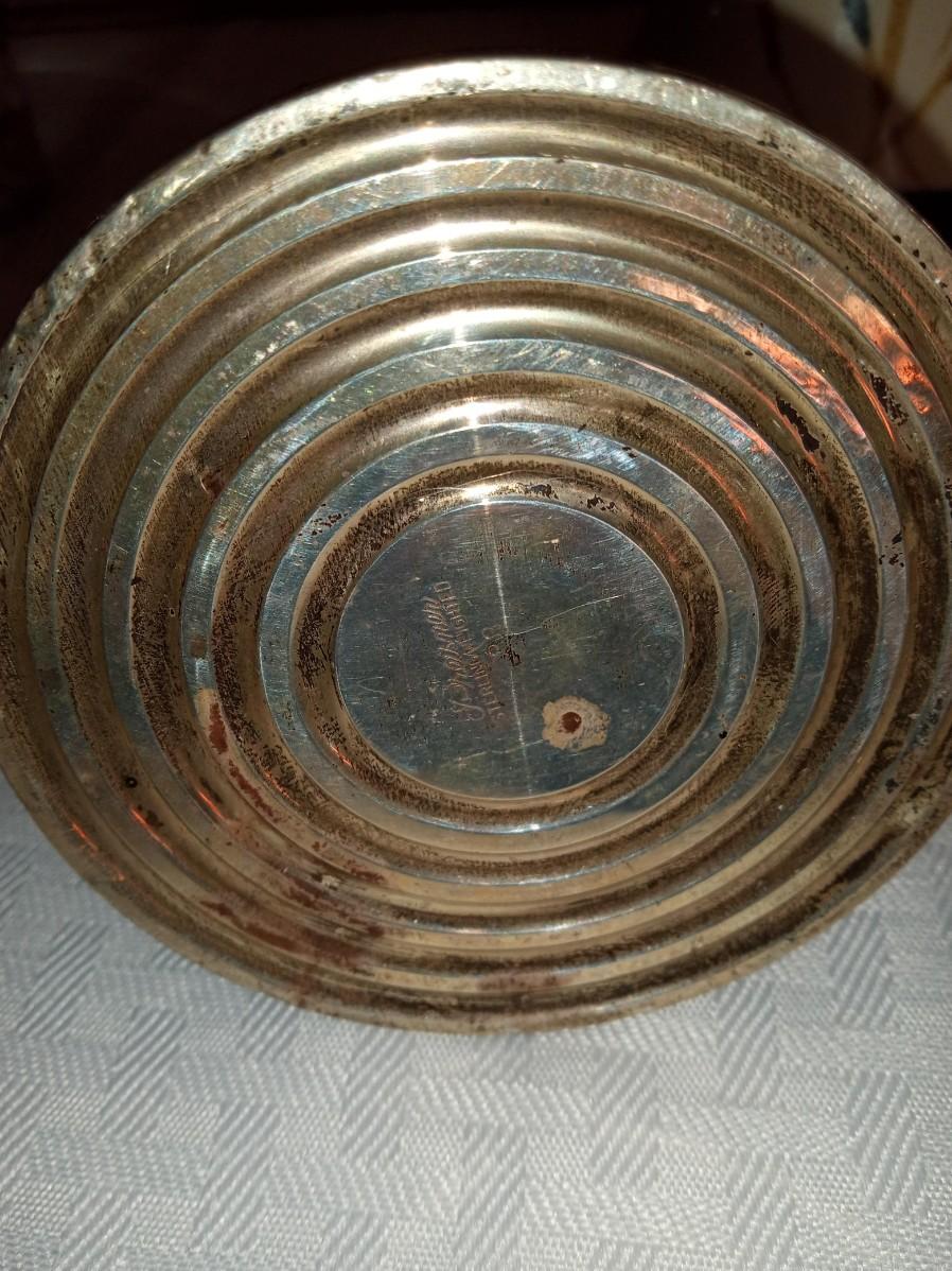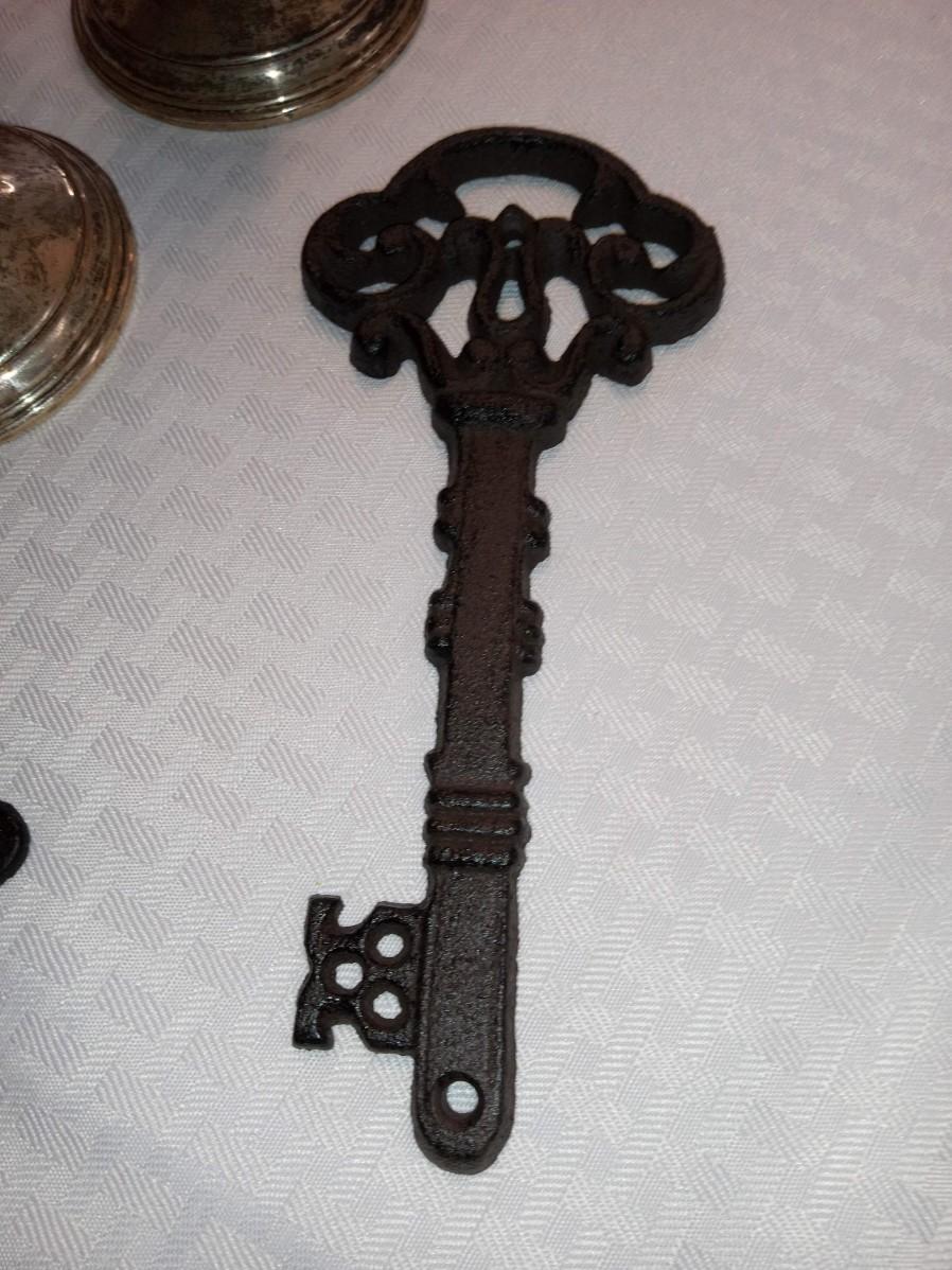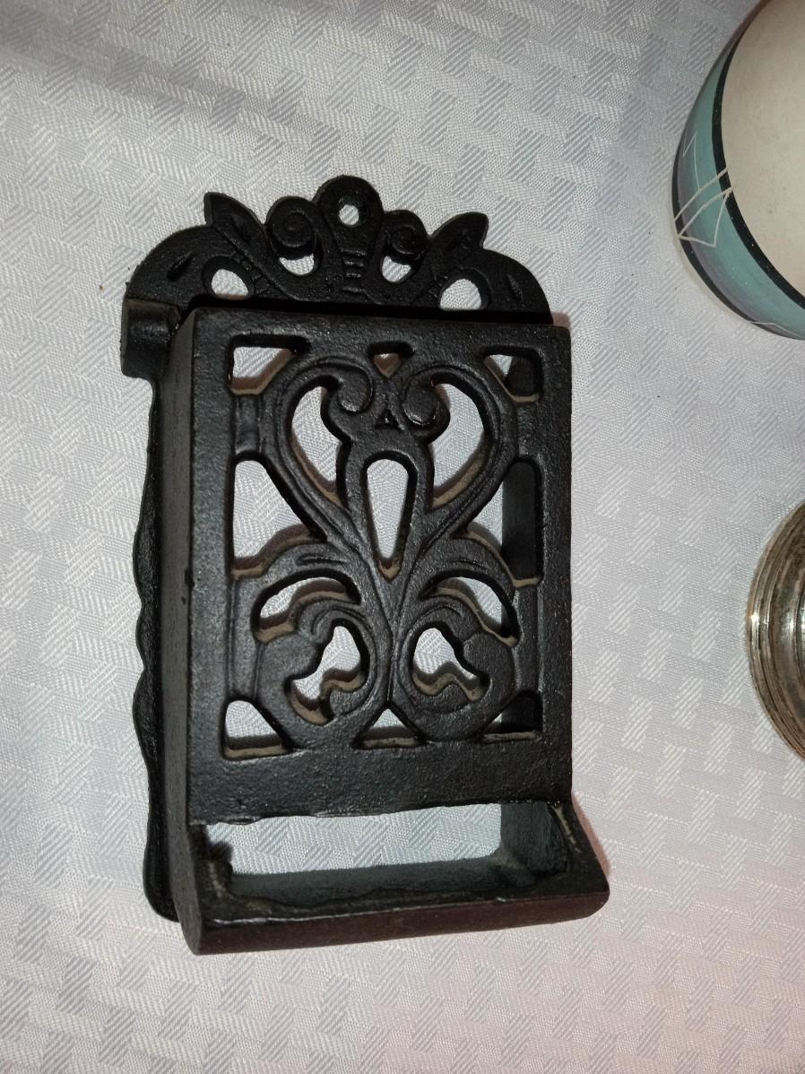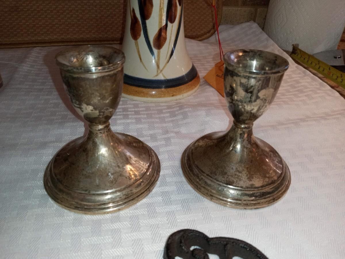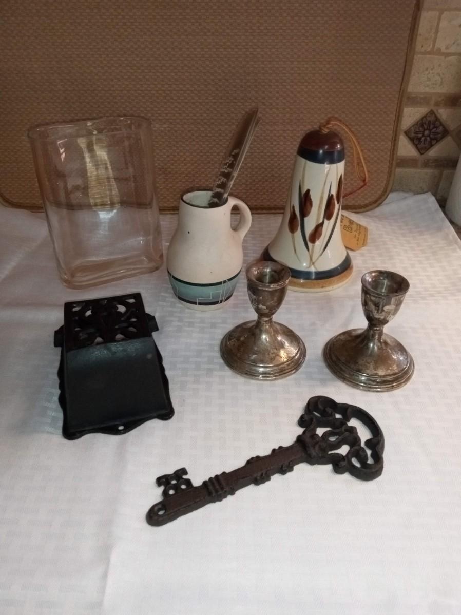 GLASS VASE, CAST IRON MATCH HOLDER AND KEY, STERLING SILVER WEIGHTED CANDLESTICKS AND A WIND BELL
