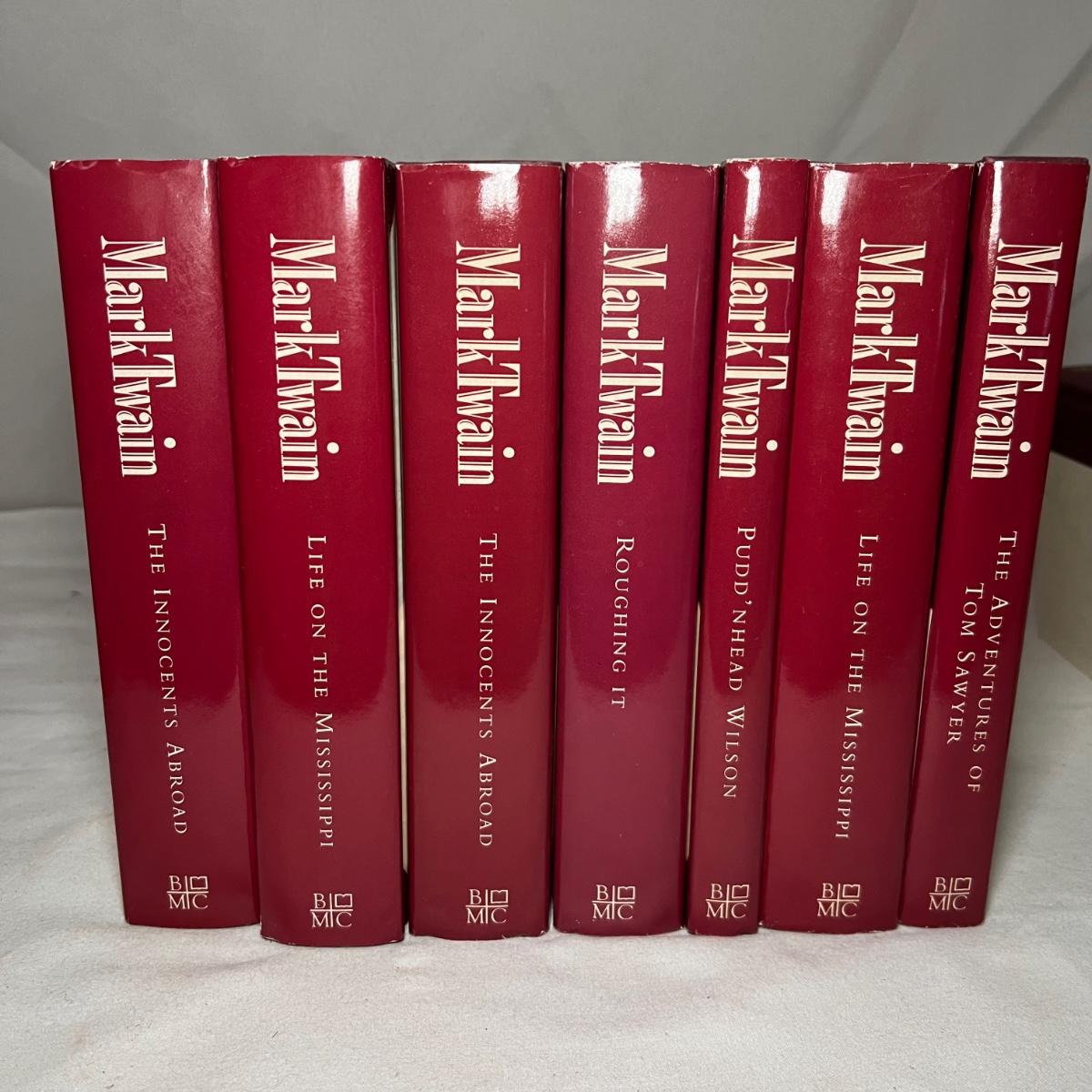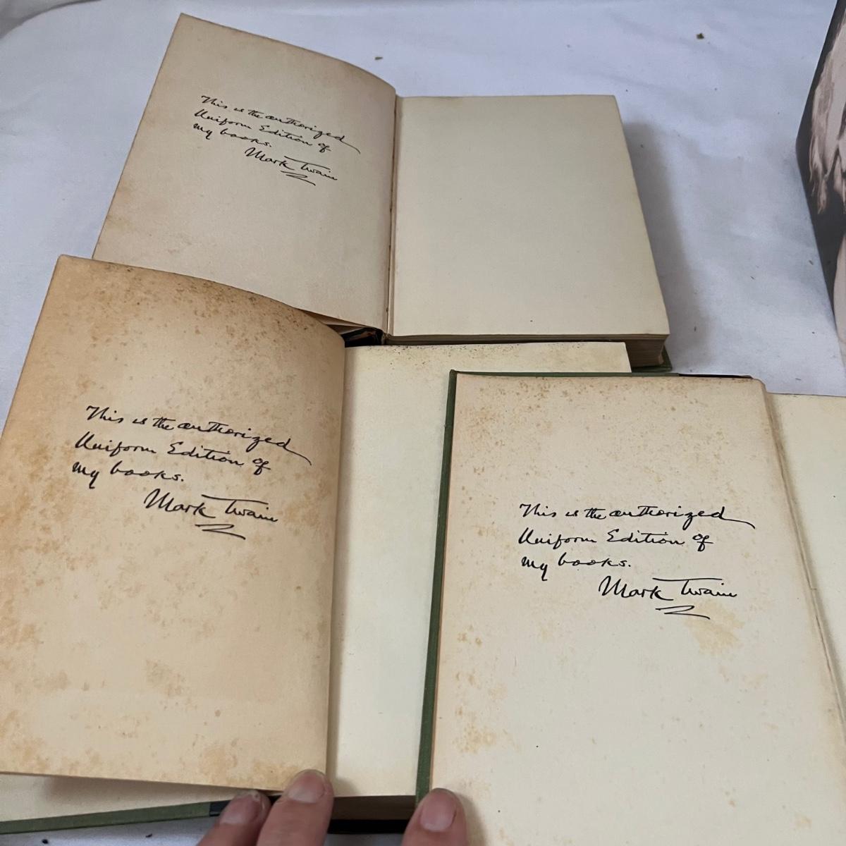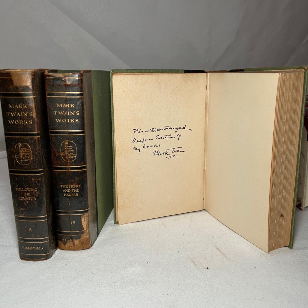 Thirteen books from Mark Twain. Three of these books have a stamped endorsement from the author, note that there is some looseness of pages from the spines and discoloration of pages. Of the nine Book of the Month books, two do not have dust covers. The Book of the Month books are newer and cleaner.