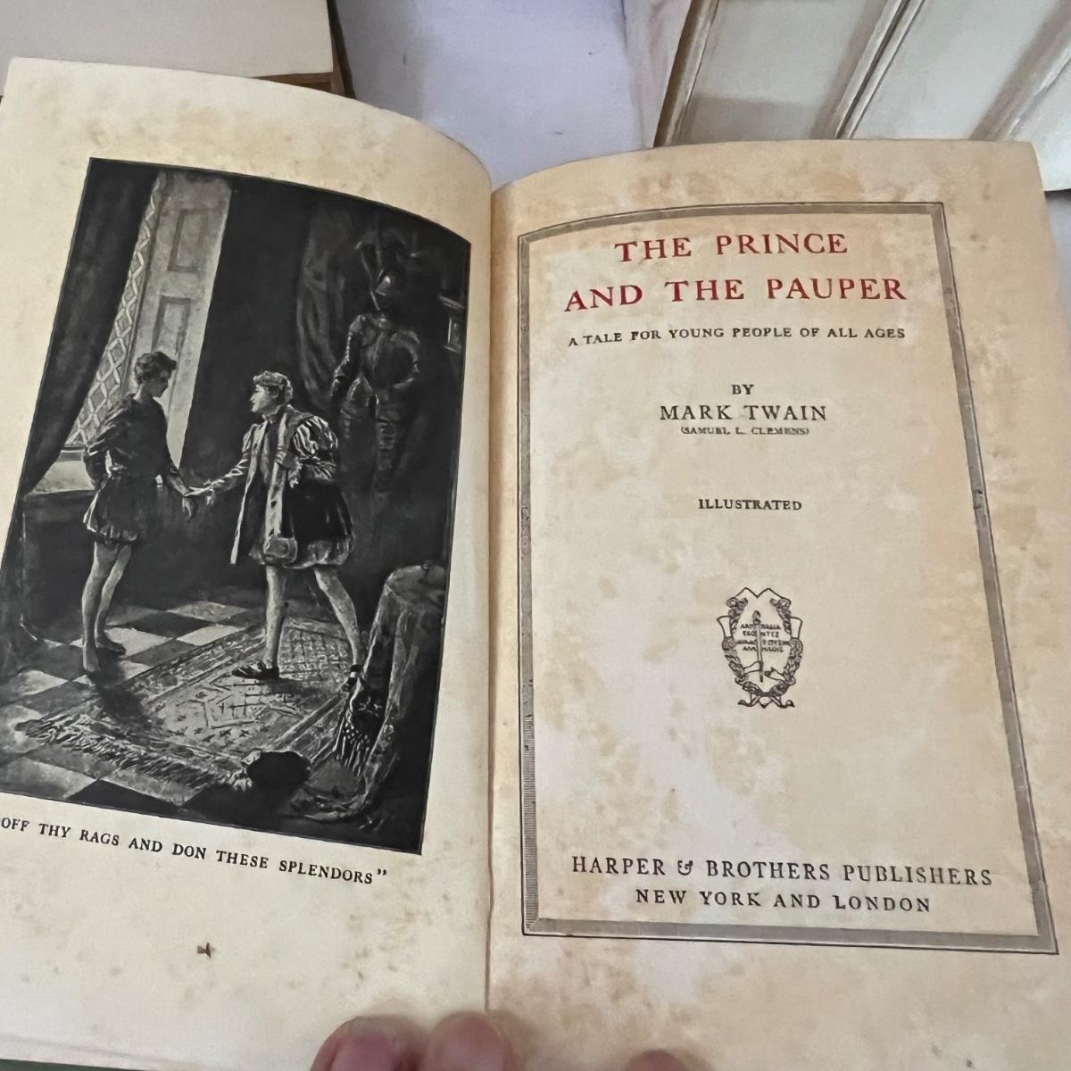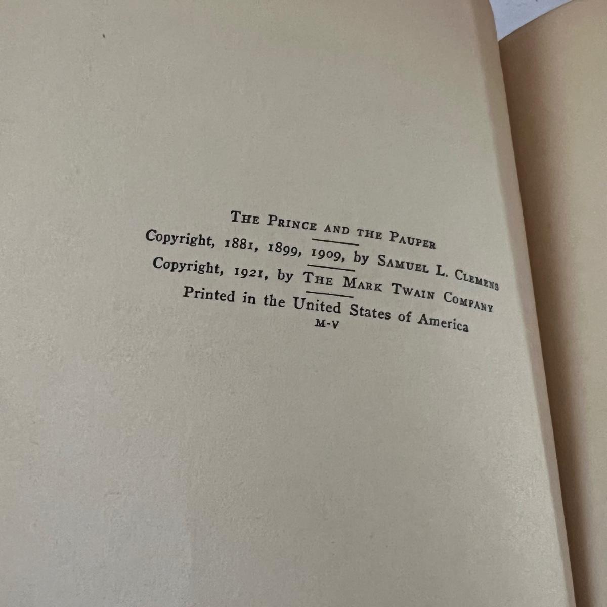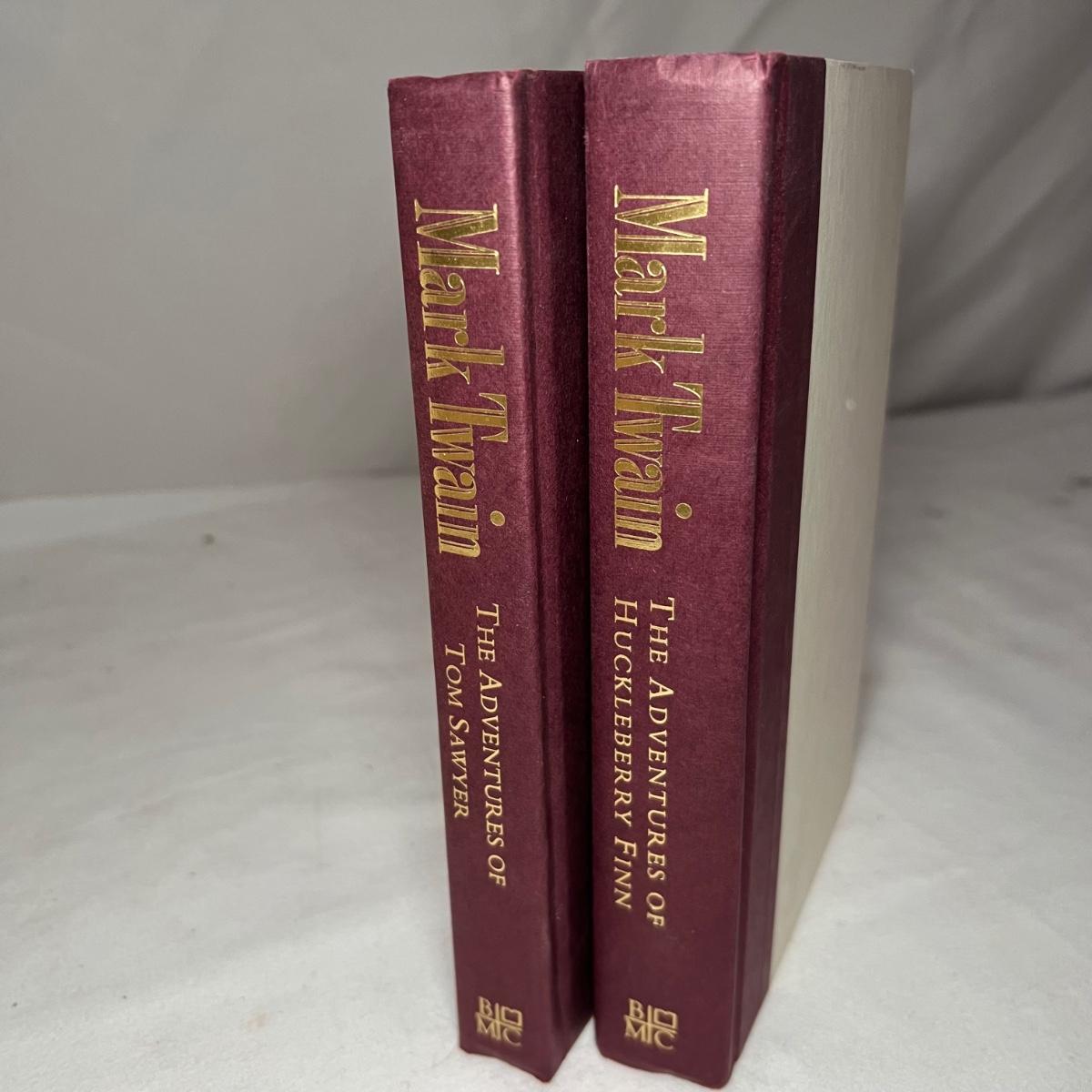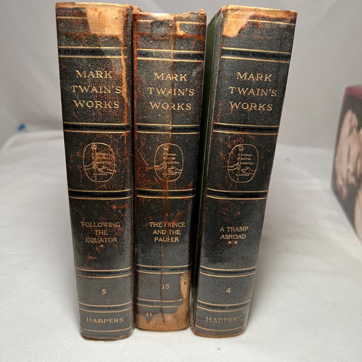Thirteen books from Mark Twain. Three of these books have a stamped endorsement from the author, note that there is some looseness of pages from the spines and discoloration of pages. Of the nine Book of the Month books, two do not have dust covers. The Book of the Month books are newer and cleaner.