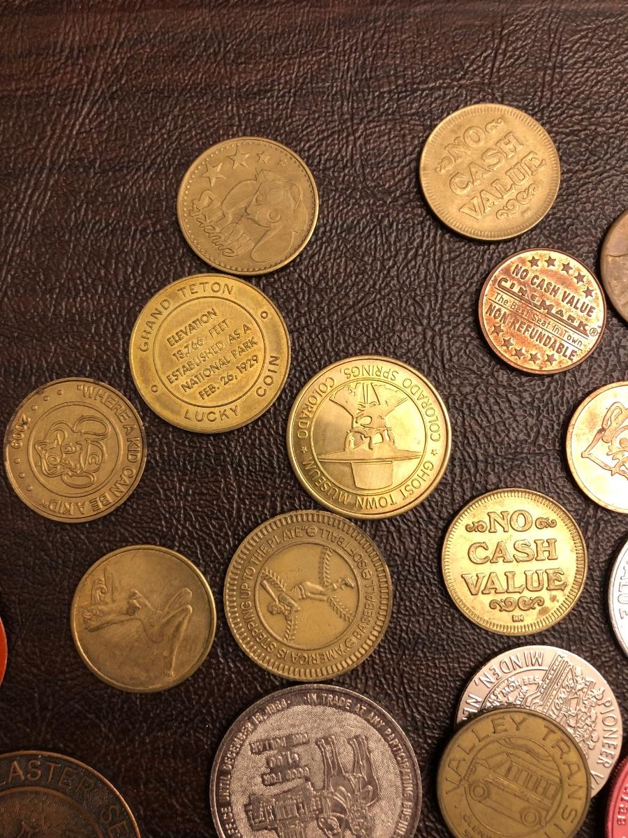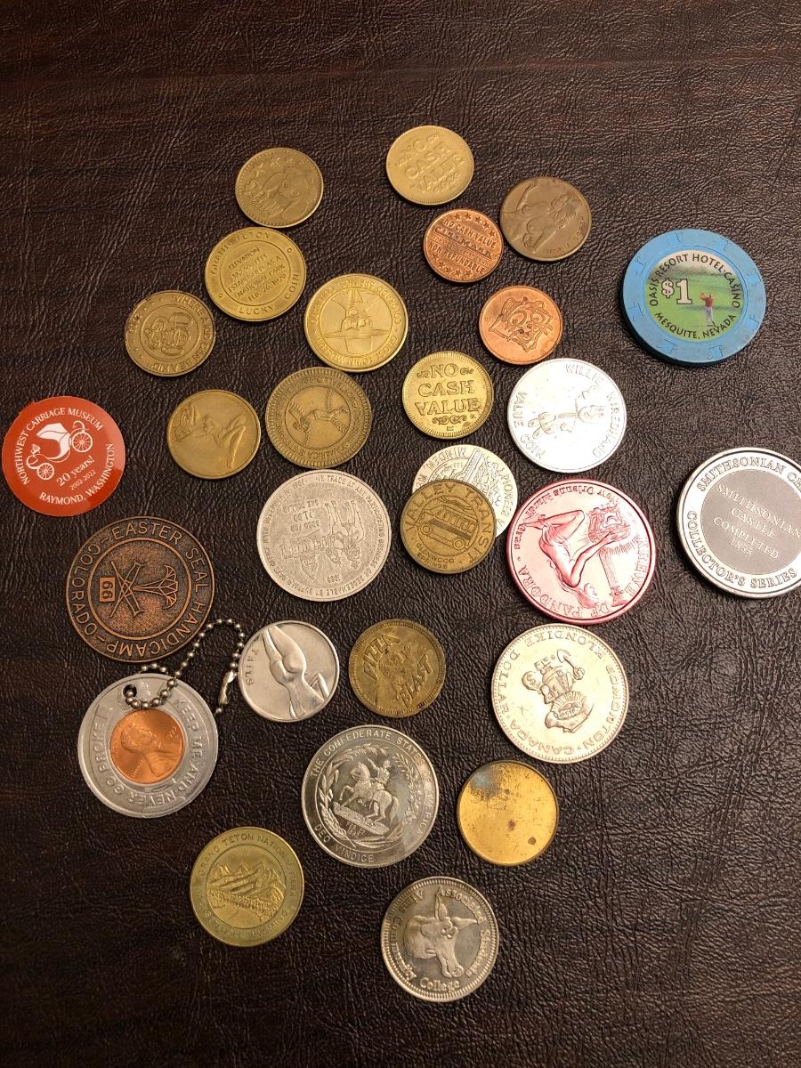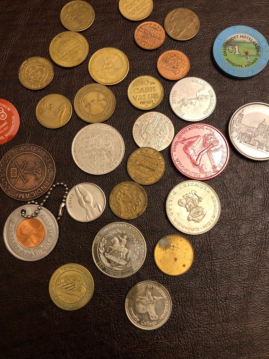 Nice lot of various tokens, coins, casino chips, and medallions.