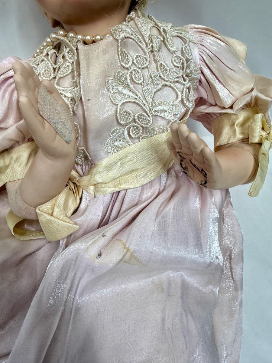 In fair condition. Her hair is a little messy. Her hands have had velcro applied to hands to keep them together in prayer. She's wearing a vintage pearl necklace.