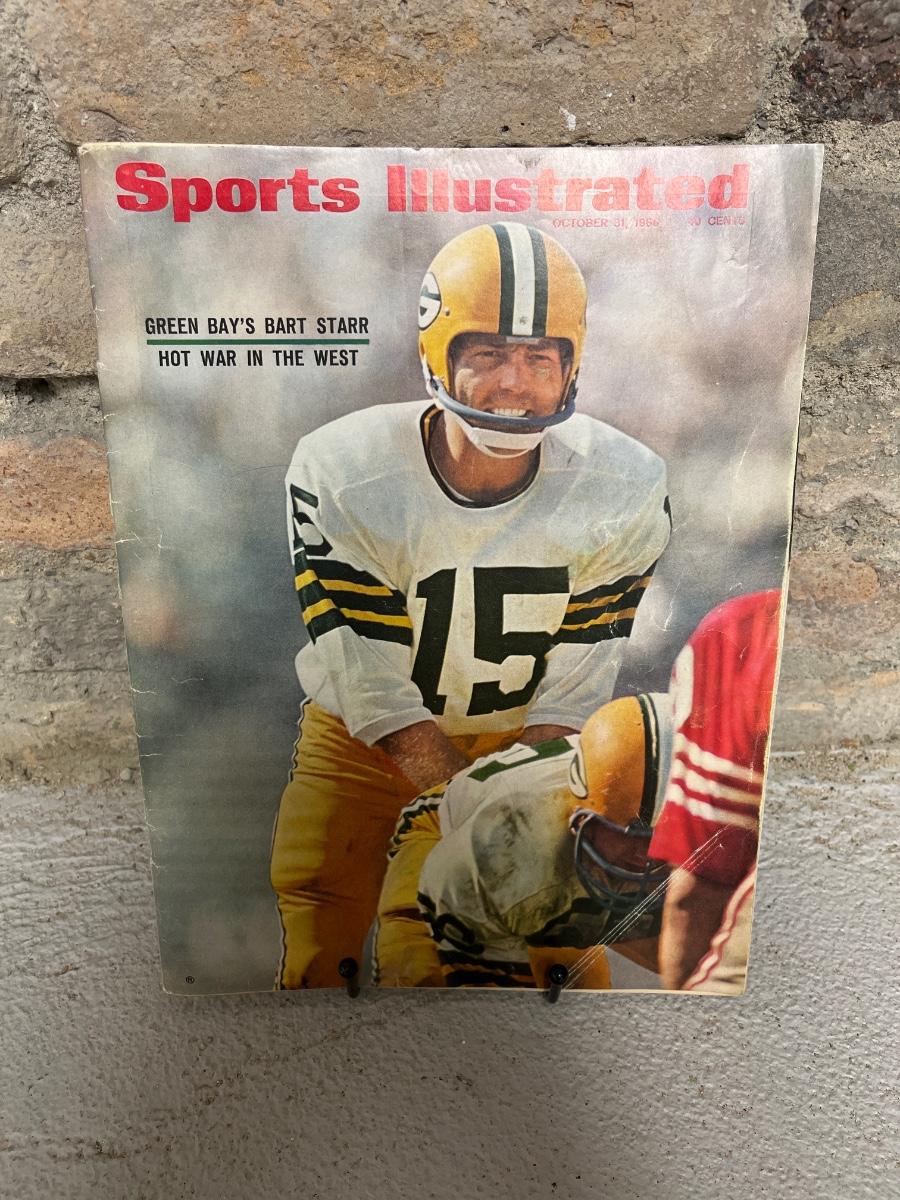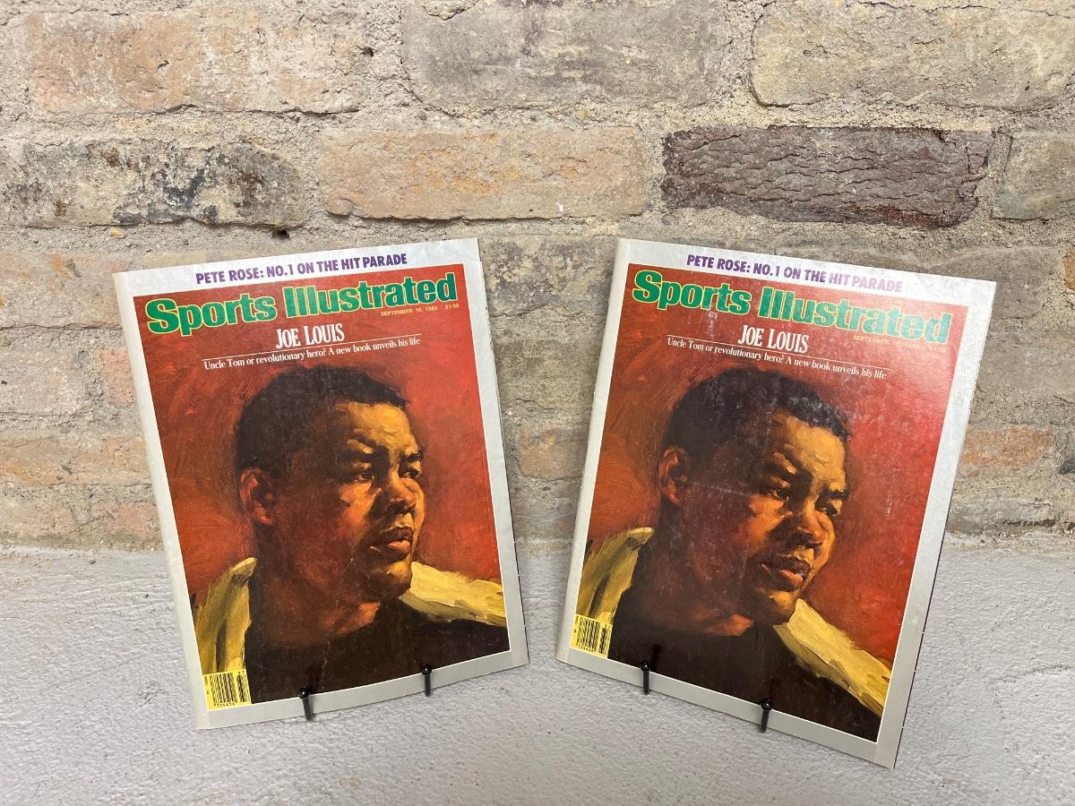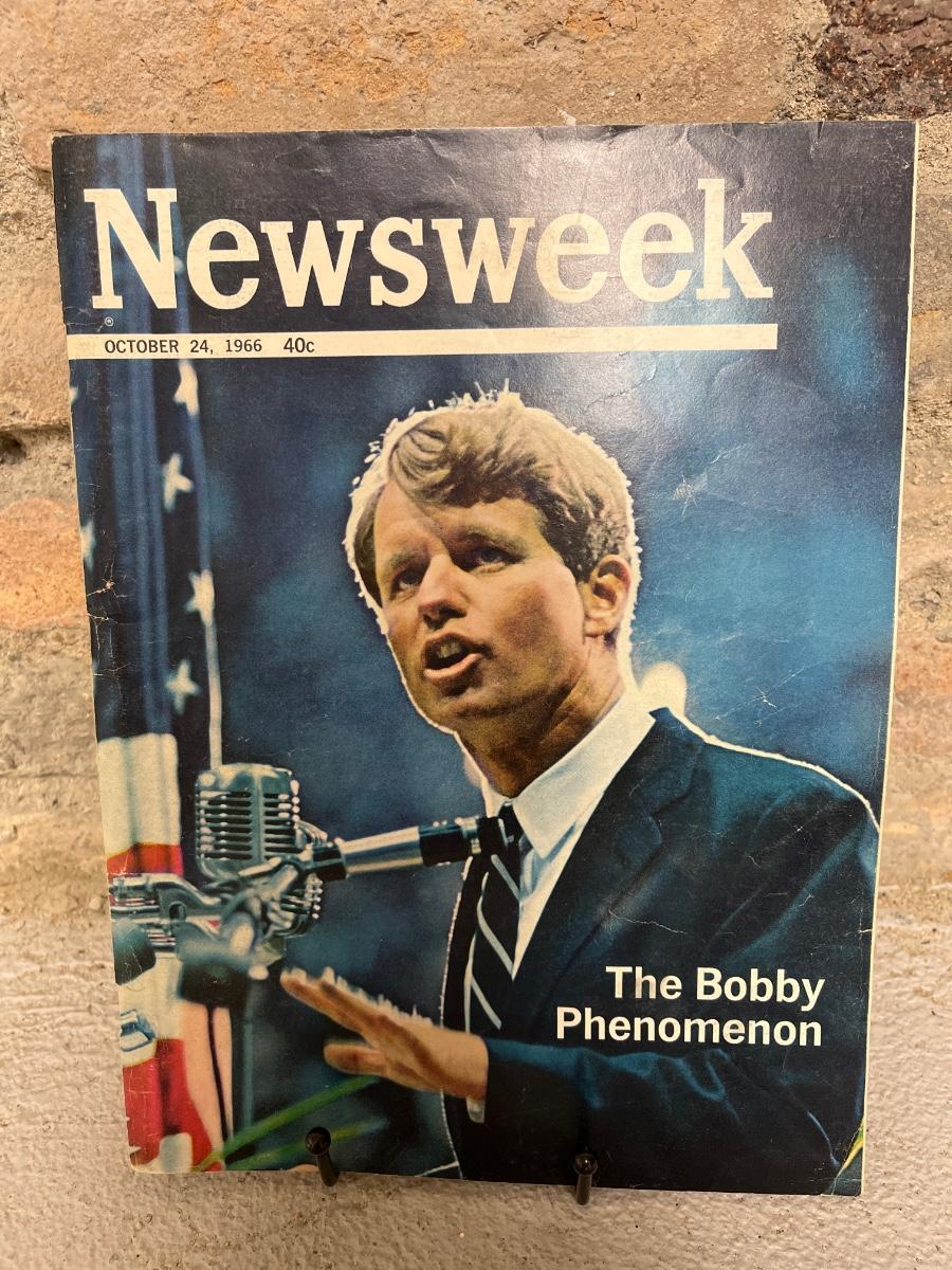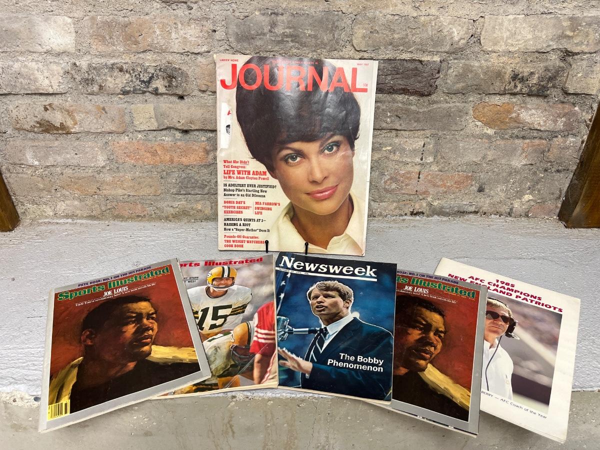 October 1966 Newsweek featuring RFK, October’66 SI featuring BART Starr, May 1967 LHJ featuring a political figure, two copies of the September’85 SI featuring Joe Louis, and a 1985 NE Patriots booklet