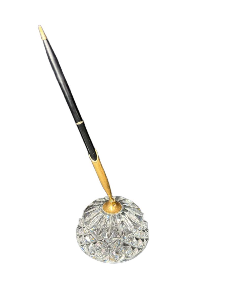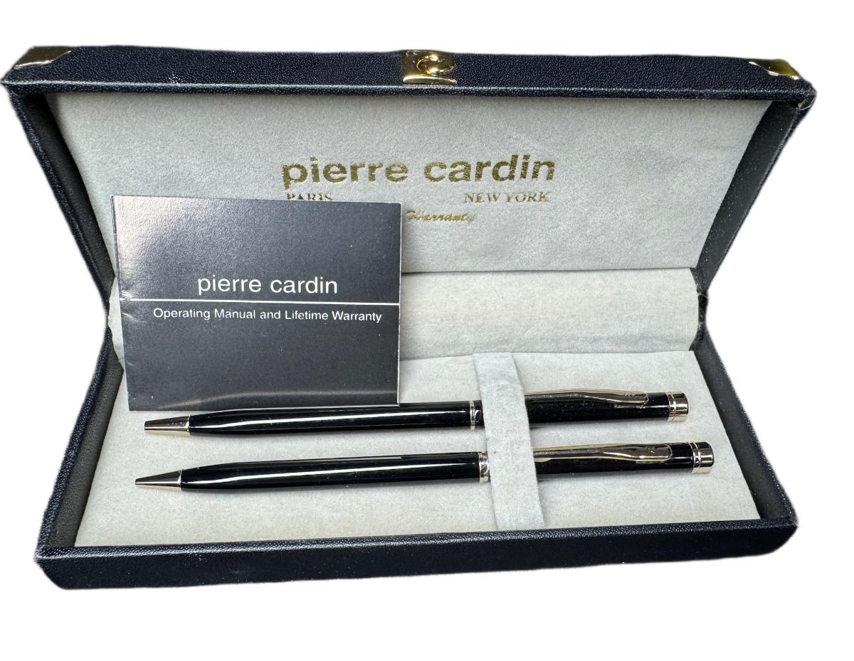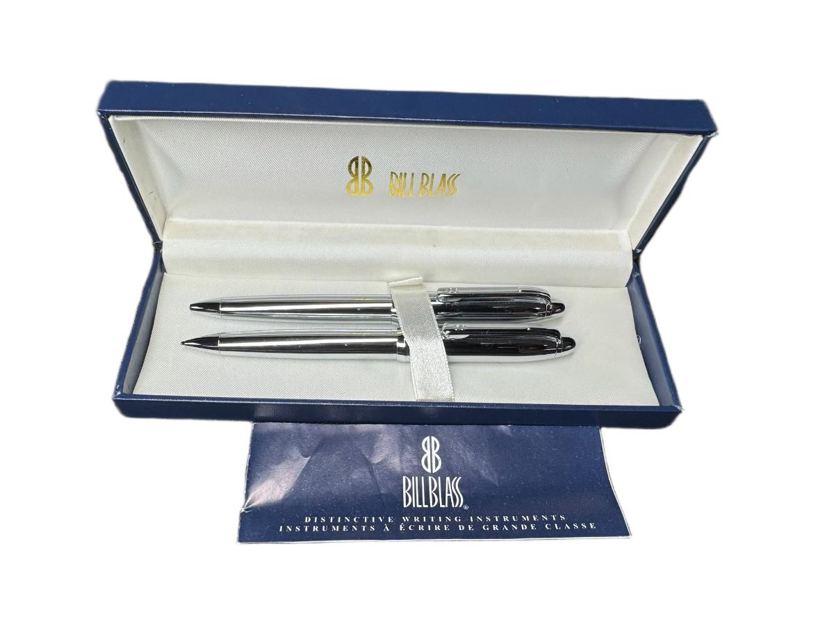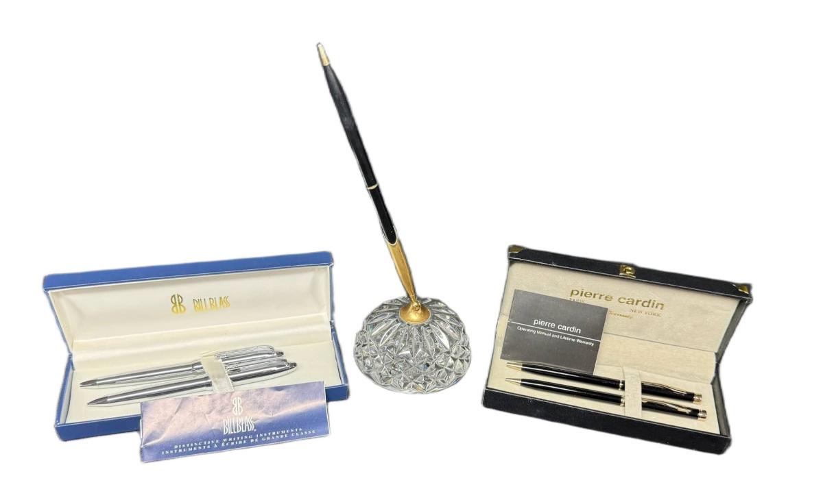 Includes a Pierre Cardin pen and pencil set, a chromed Bill Blass pen and pencil set, and a Waterford crystal desk pen. Total of three pieces. [CS]