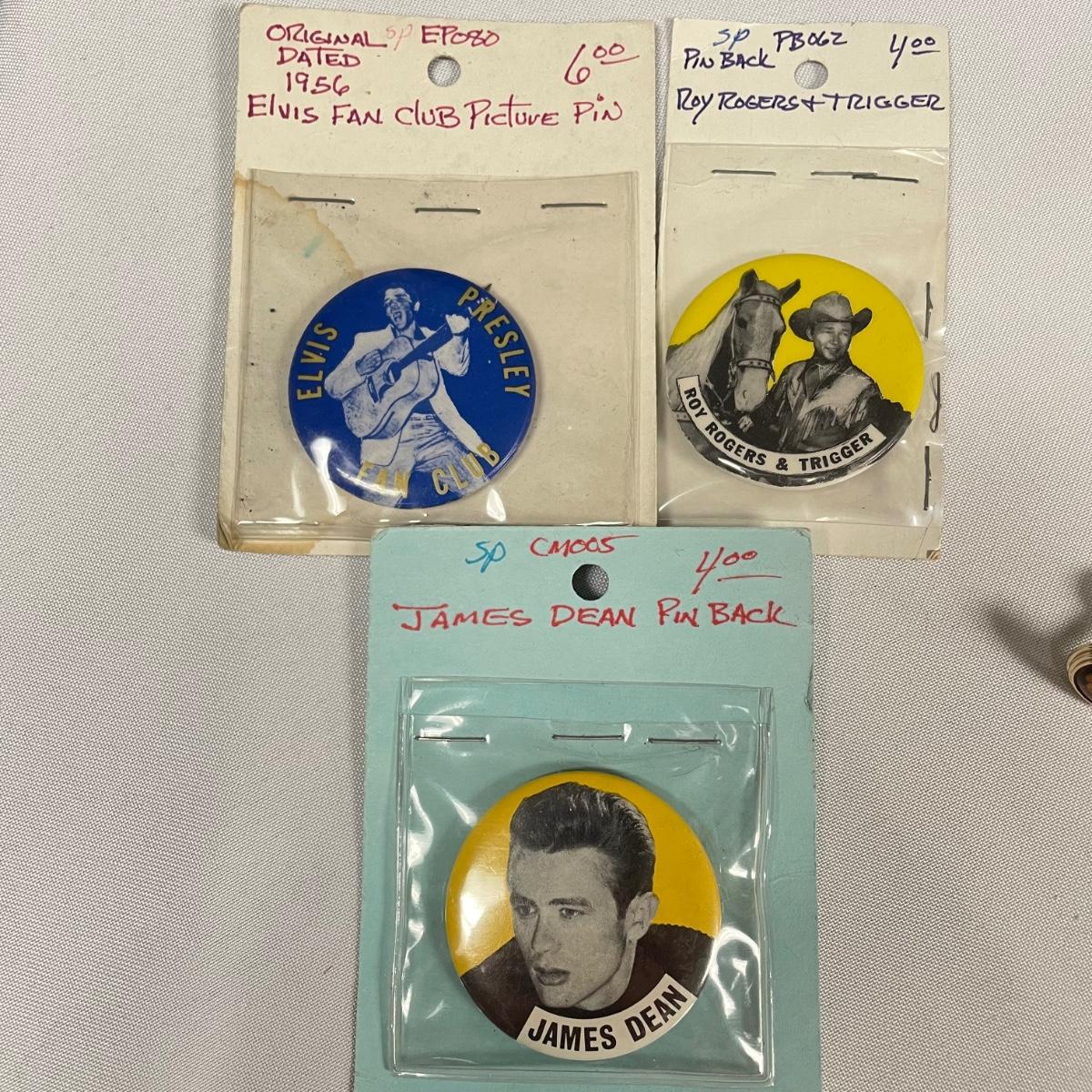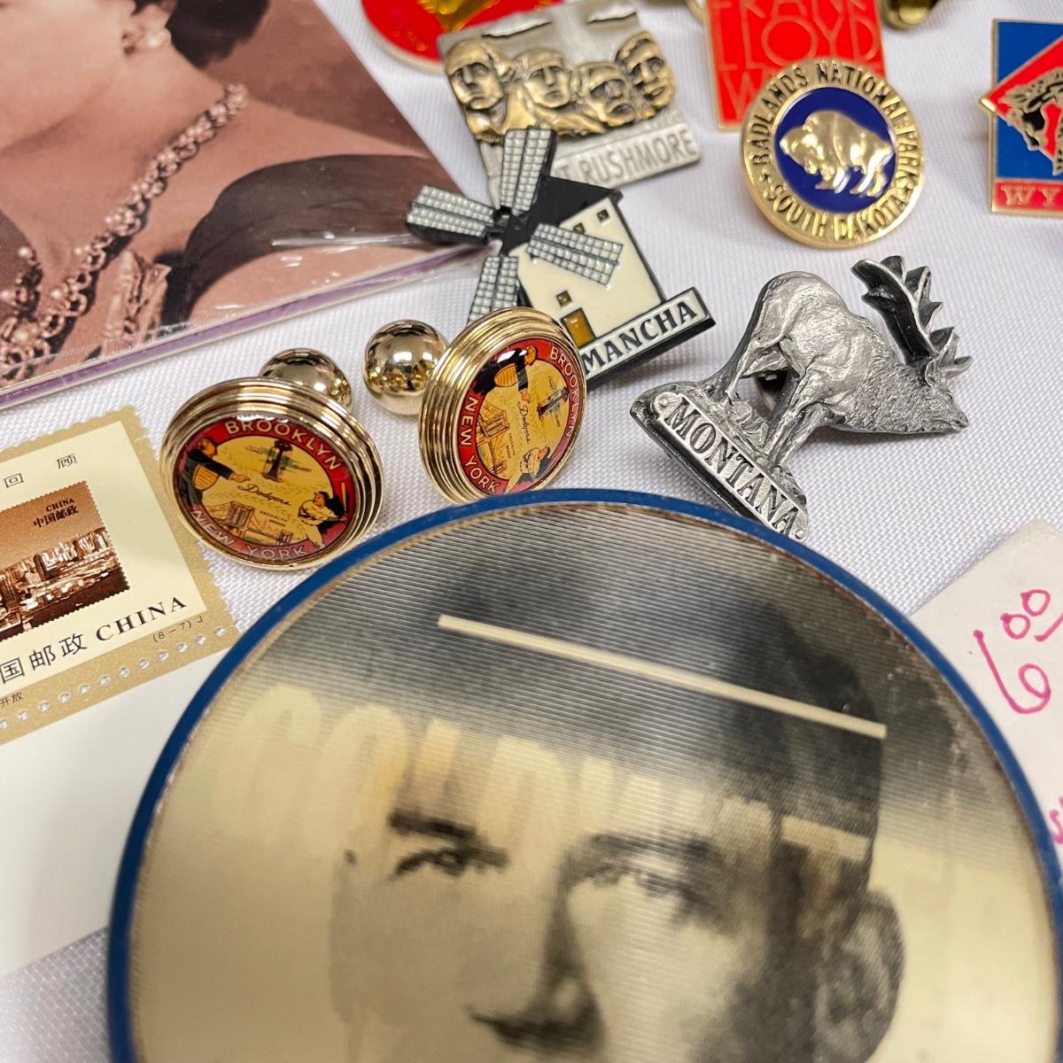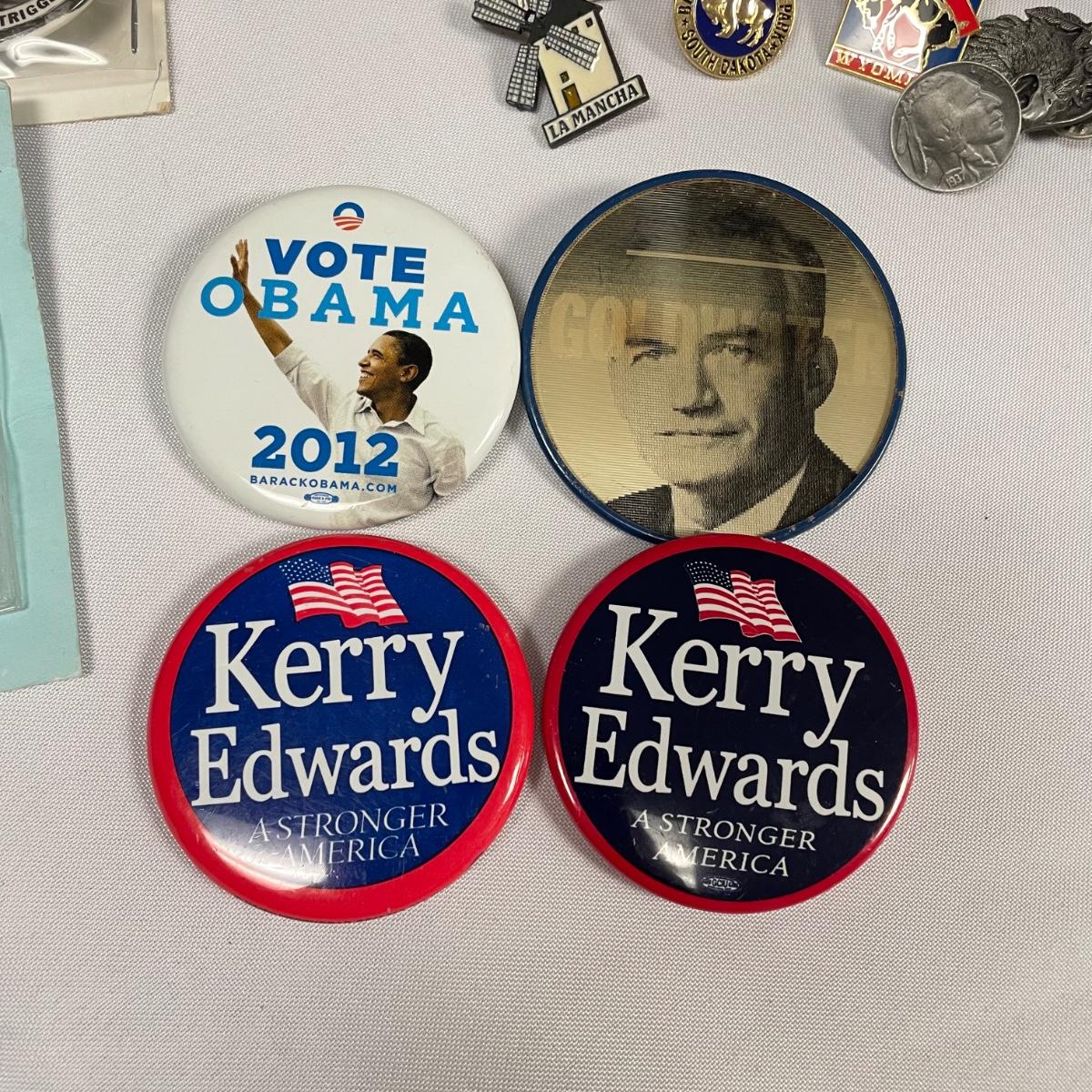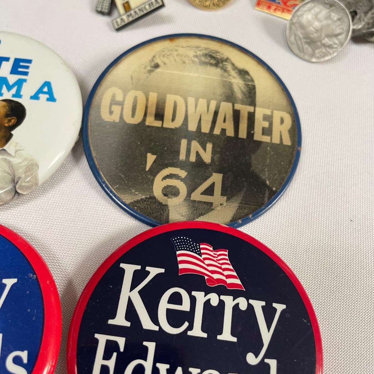 A fun collection of vintage celebrity buttons, campaign buttons, travel pins, Royal Canadian mint coins (still wrapped in plastic) and a pair of Brooklyn Dodgers tuxedo buttons. The Goldwater pin is holographic and measures 2.5”D. Known pin stamps are shown in photos, the Badlands and Montana stamps are illegible. See images. All sales are final. No returns or refunds. Please bid accordingly. Shipping available.