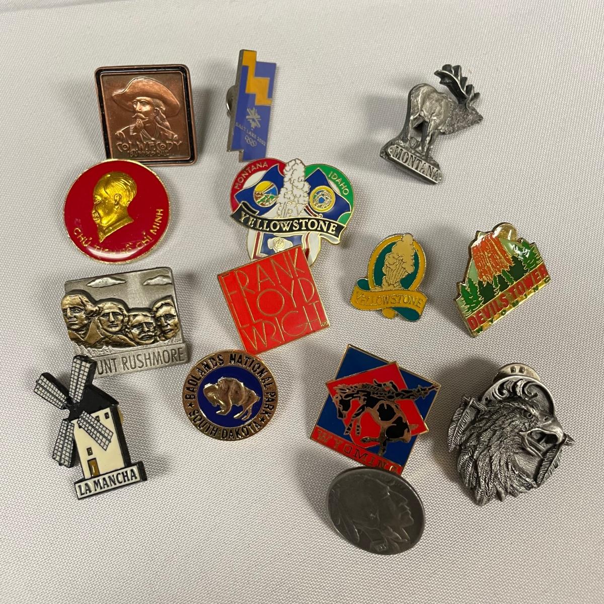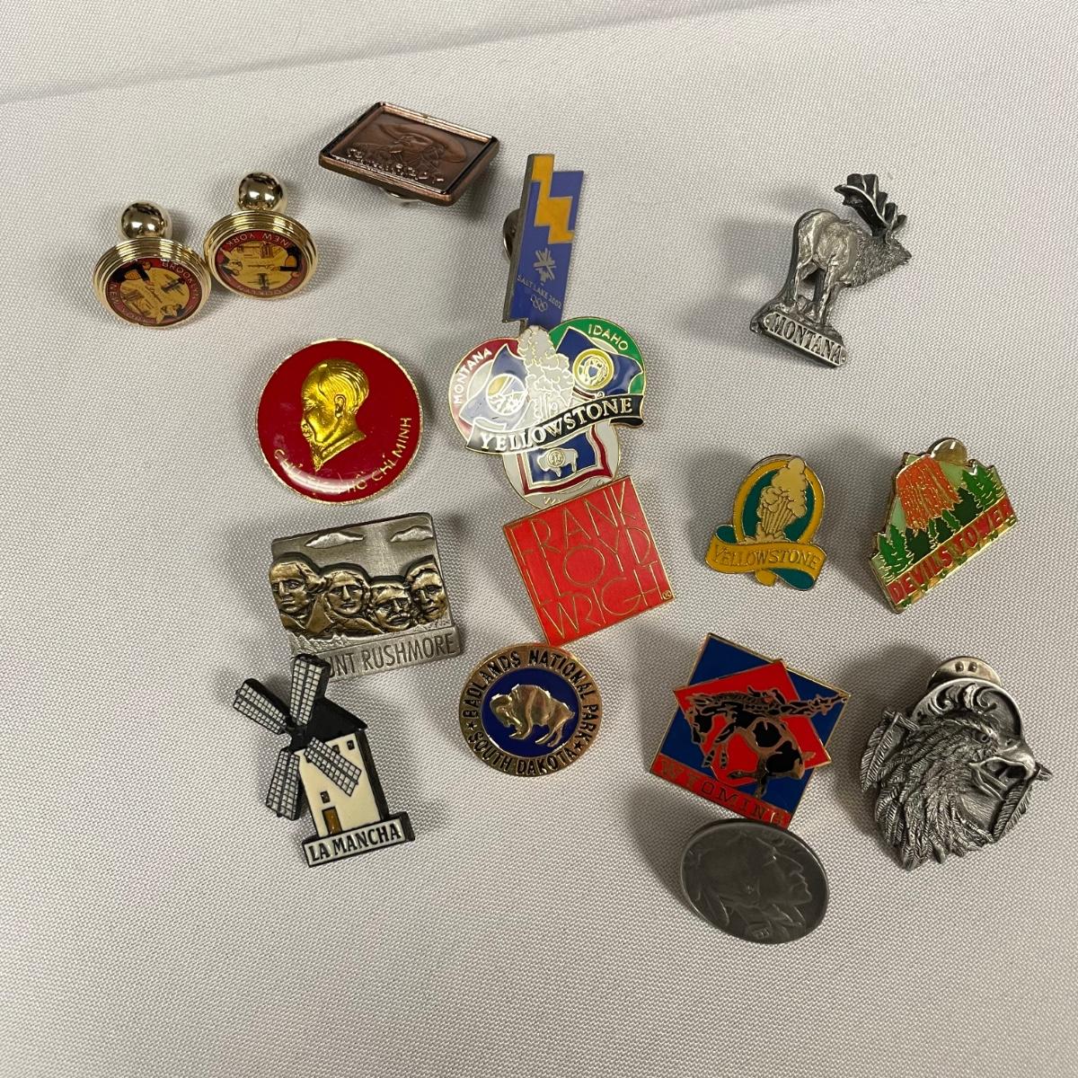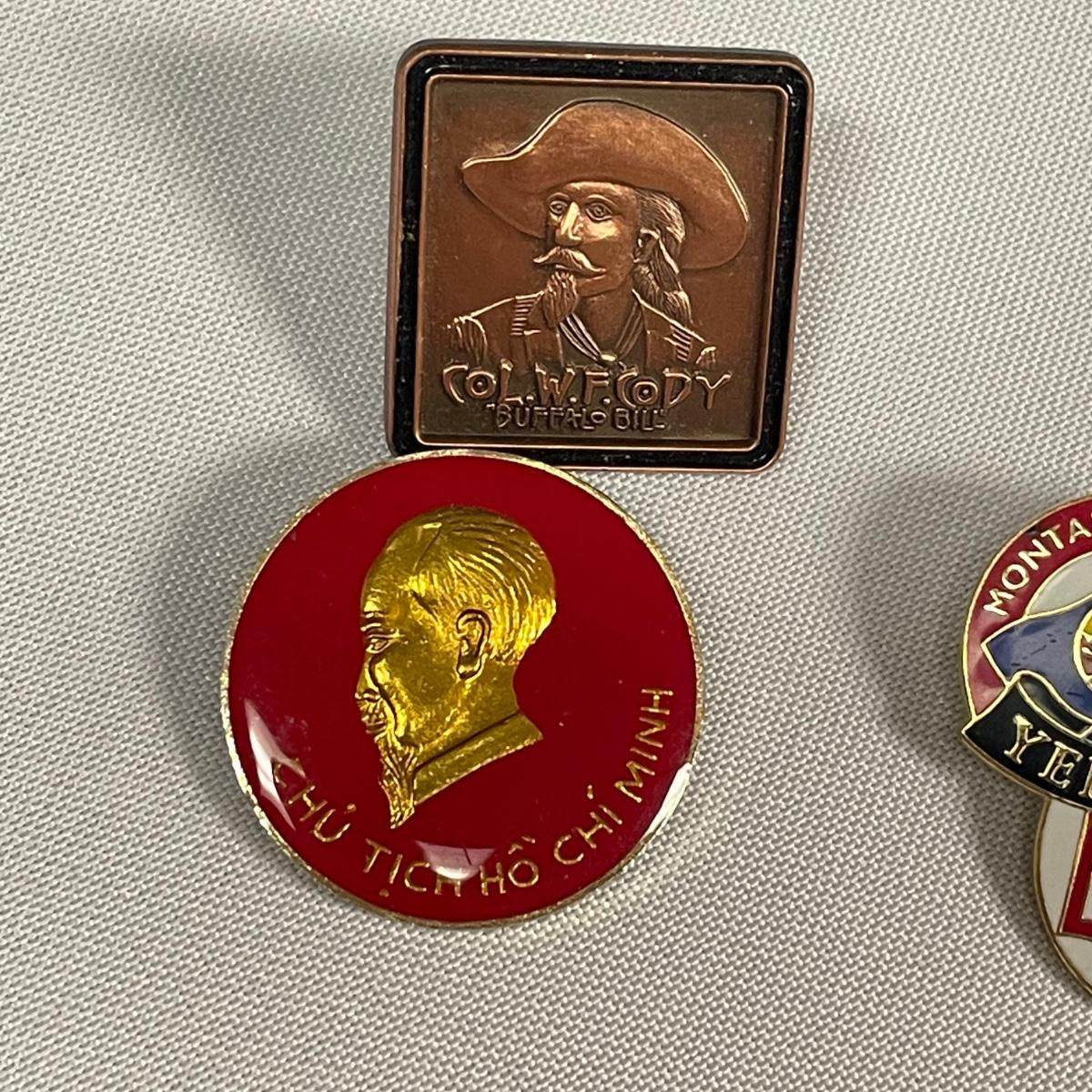 A fun collection of vintage celebrity buttons, campaign buttons, travel pins, Royal Canadian mint coins (still wrapped in plastic) and a pair of Brooklyn Dodgers tuxedo buttons. The Goldwater pin is holographic and measures 2.5”D. Known pin stamps are shown in photos, the Badlands and Montana stamps are illegible. See images. All sales are final. No returns or refunds. Please bid accordingly. Shipping available.