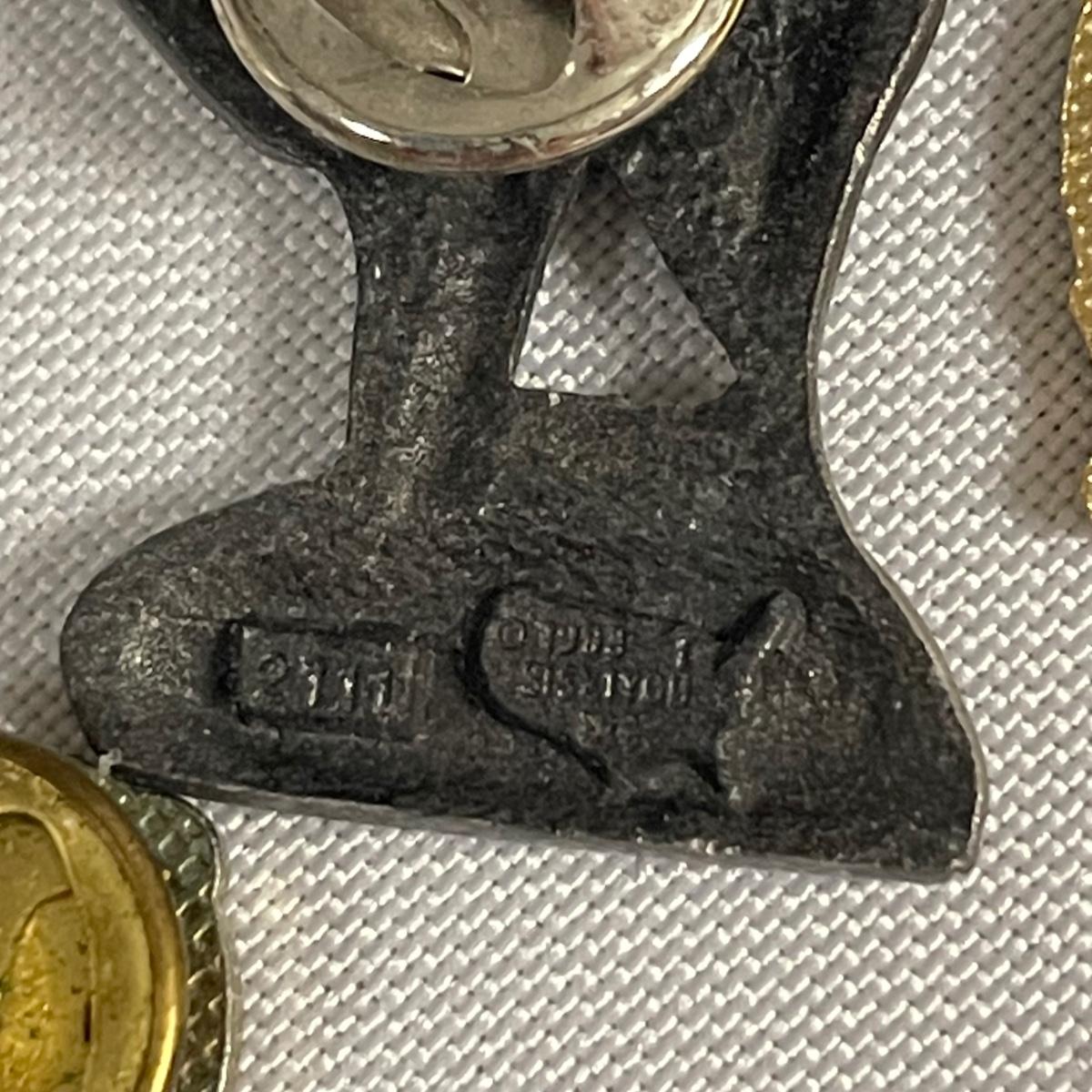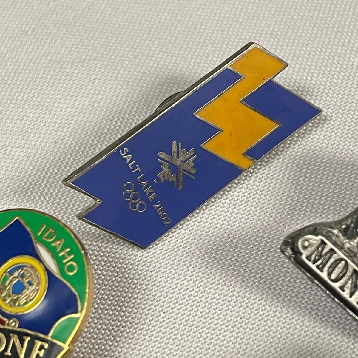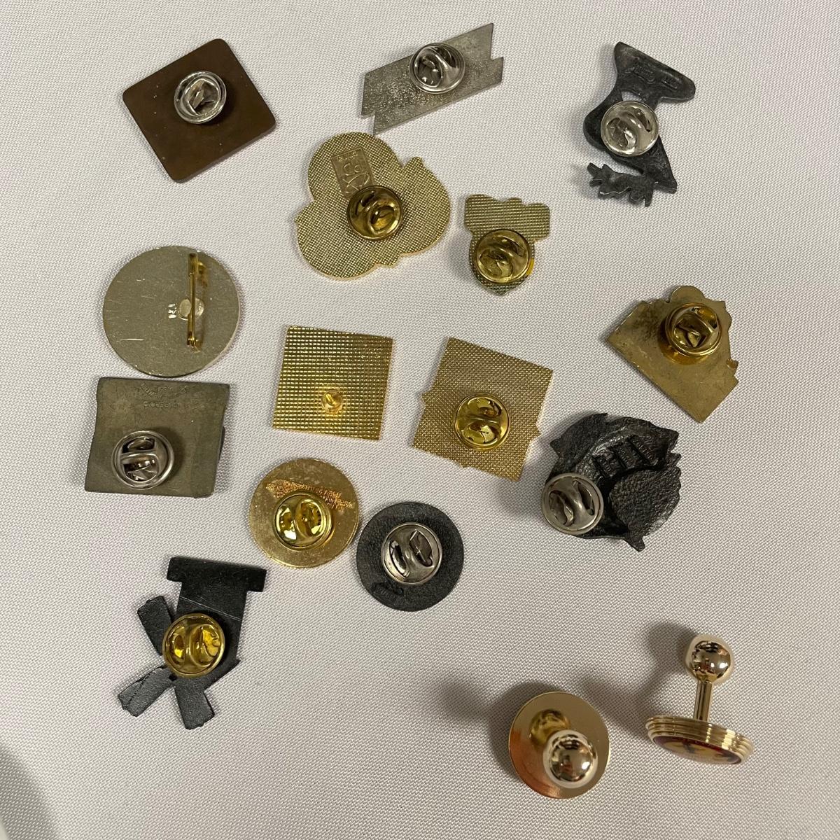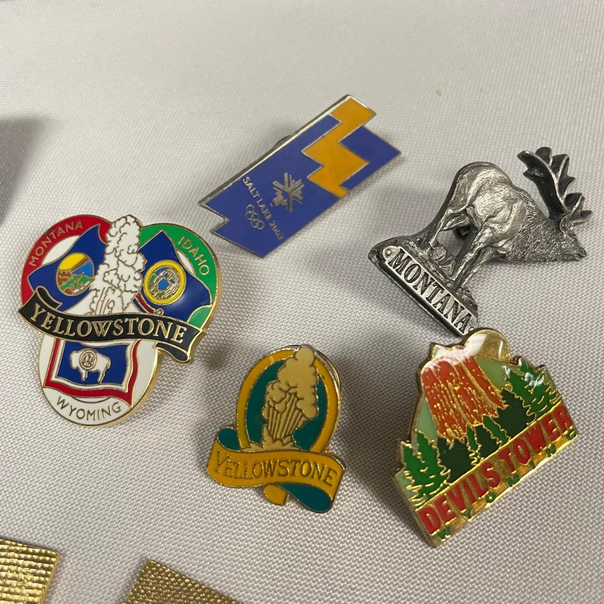 A fun collection of vintage celebrity buttons, campaign buttons, travel pins, Royal Canadian mint coins (still wrapped in plastic) and a pair of Brooklyn Dodgers tuxedo buttons. The Goldwater pin is holographic and measures 2.5”D. Known pin stamps are shown in photos, the Badlands and Montana stamps are illegible. See images. All sales are final. No returns or refunds. Please bid accordingly. Shipping available.