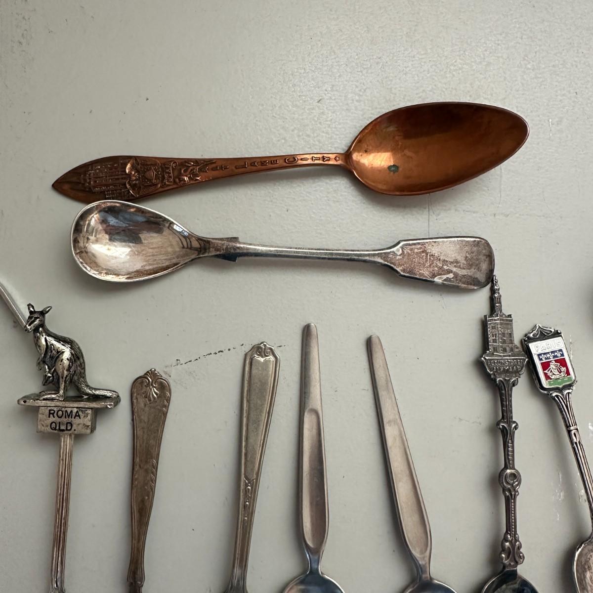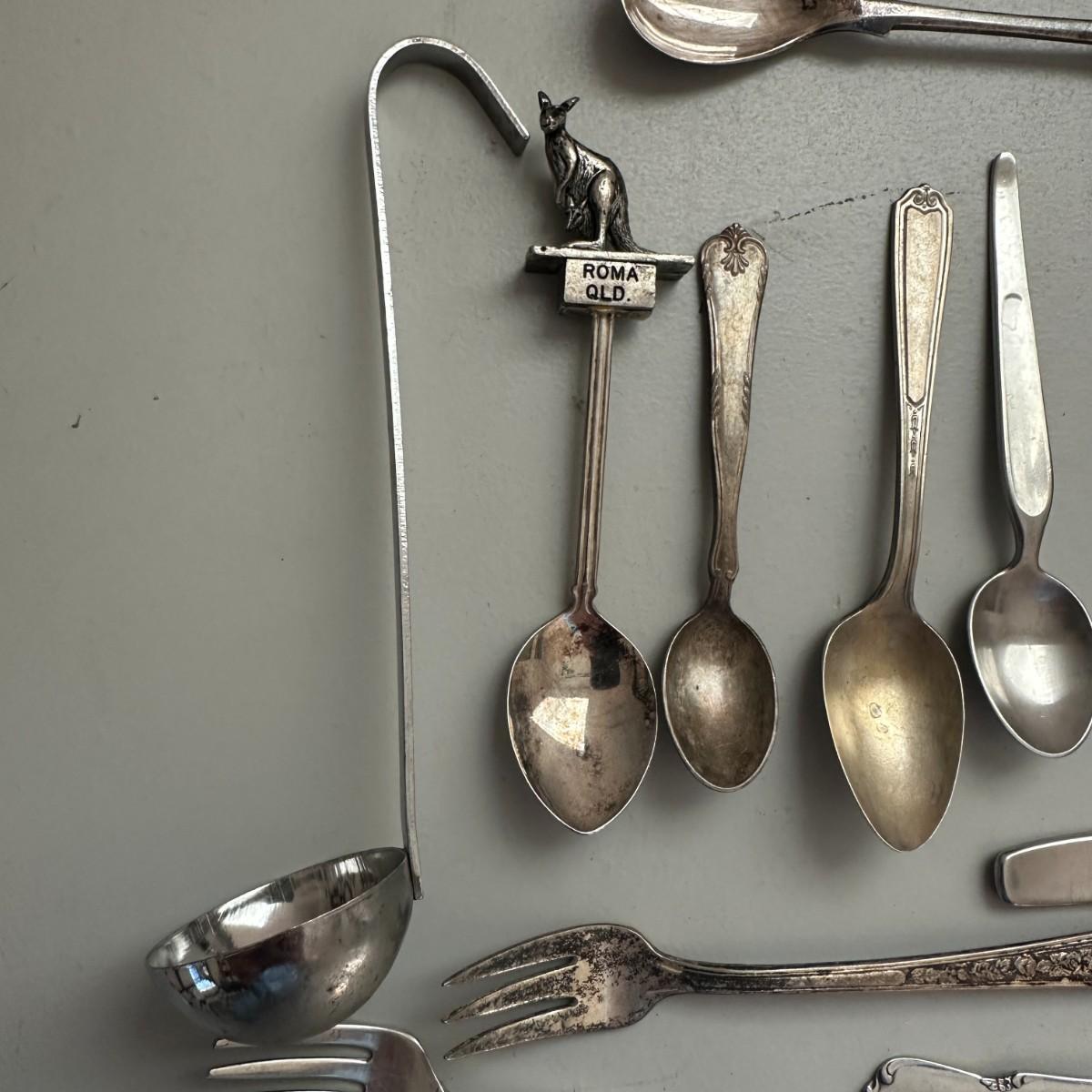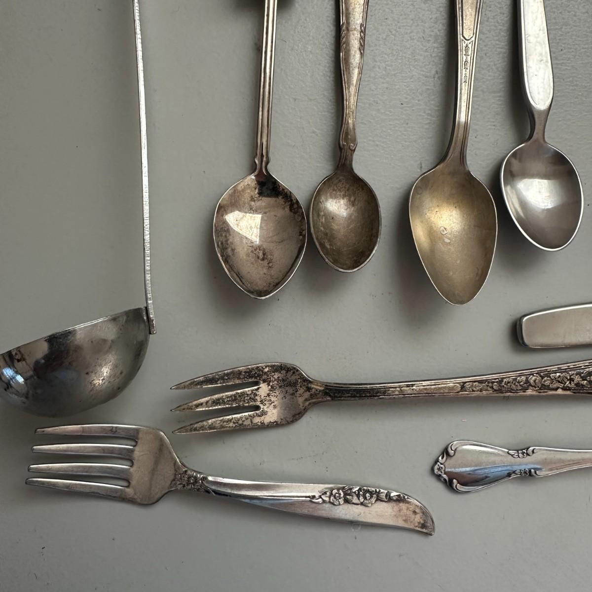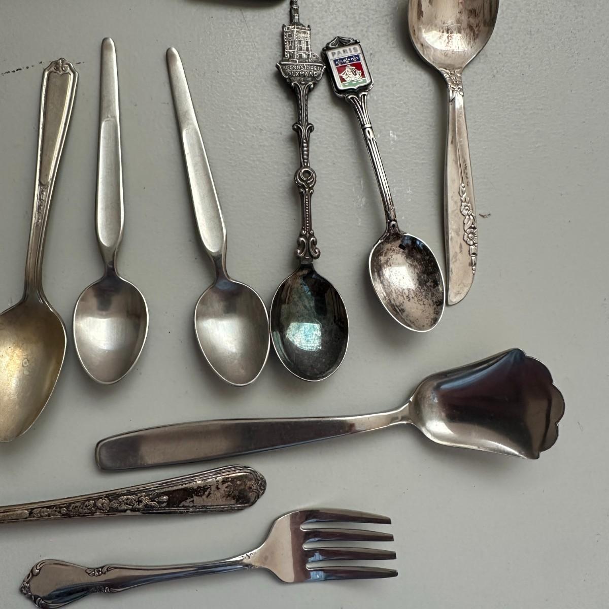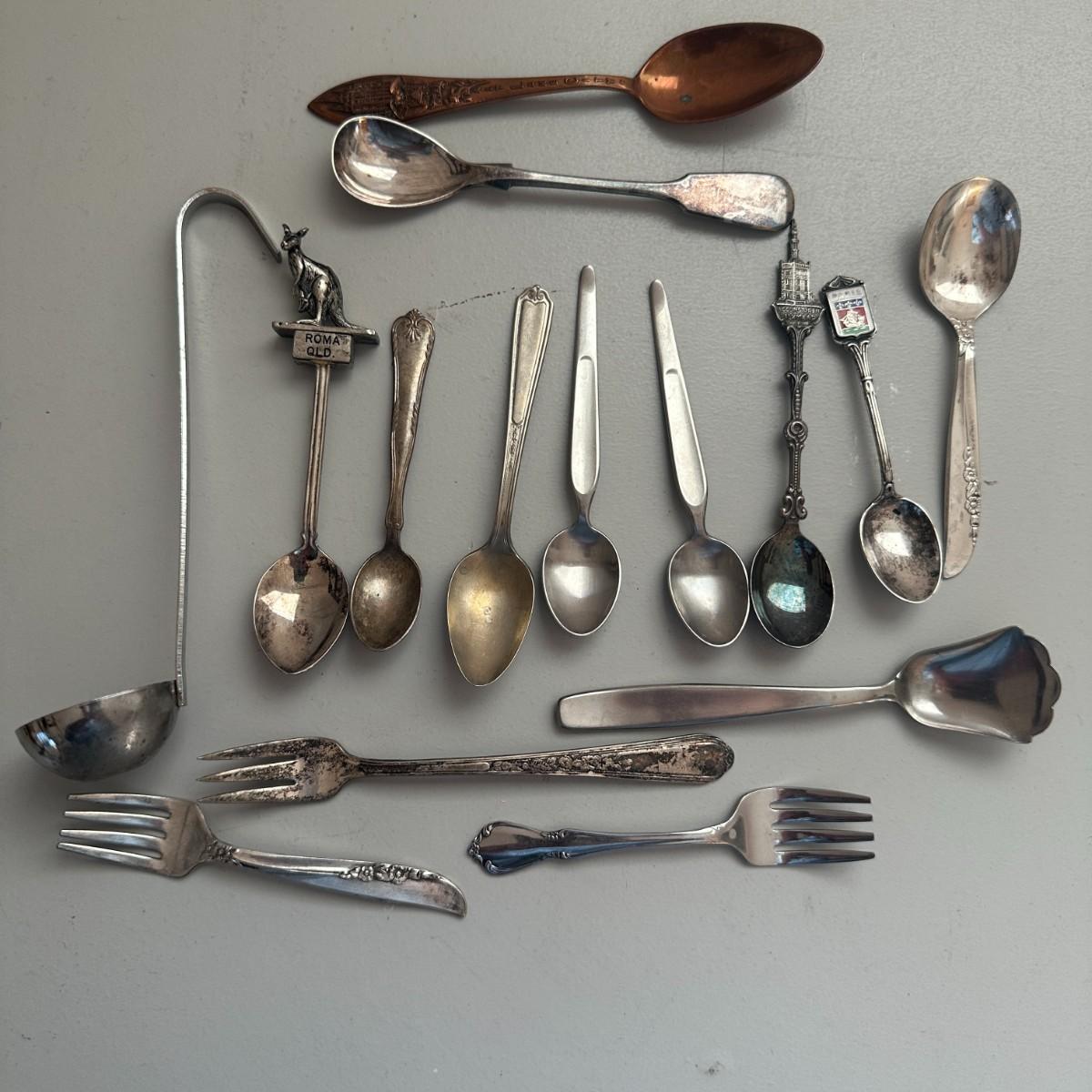 Misc. metals and sizes. Some spoons in lot are actually forks.