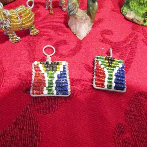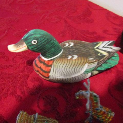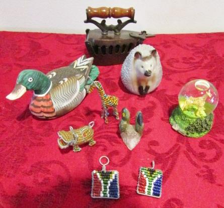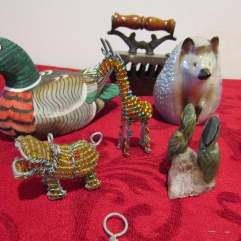 WOODEN DUCK, ANTIQUE IRON, BEADED ANIMALS AND PENDANTS, SNOWGLOBE