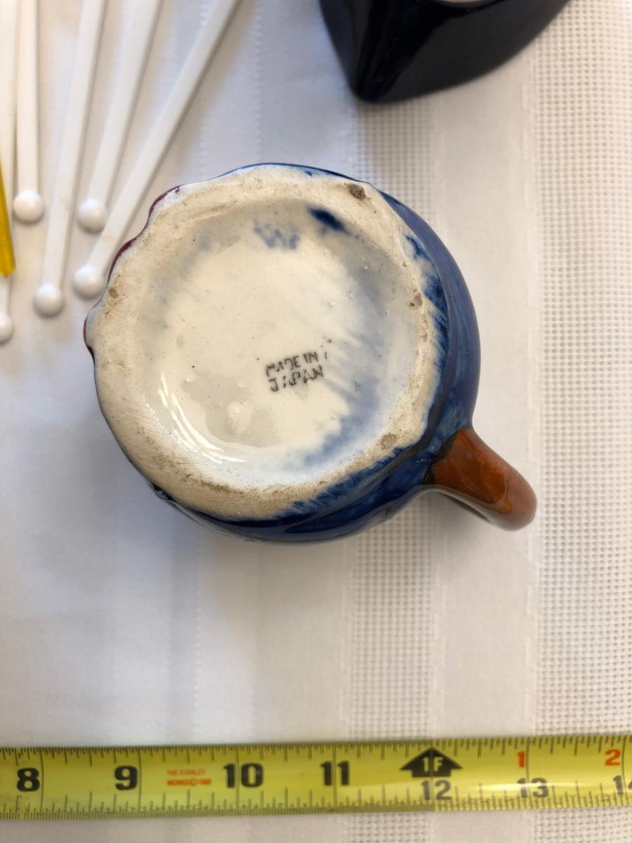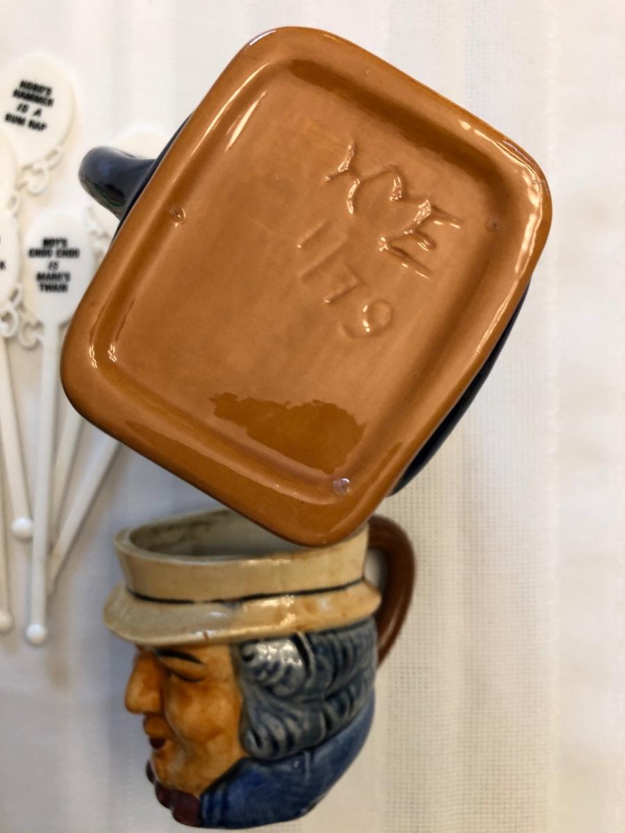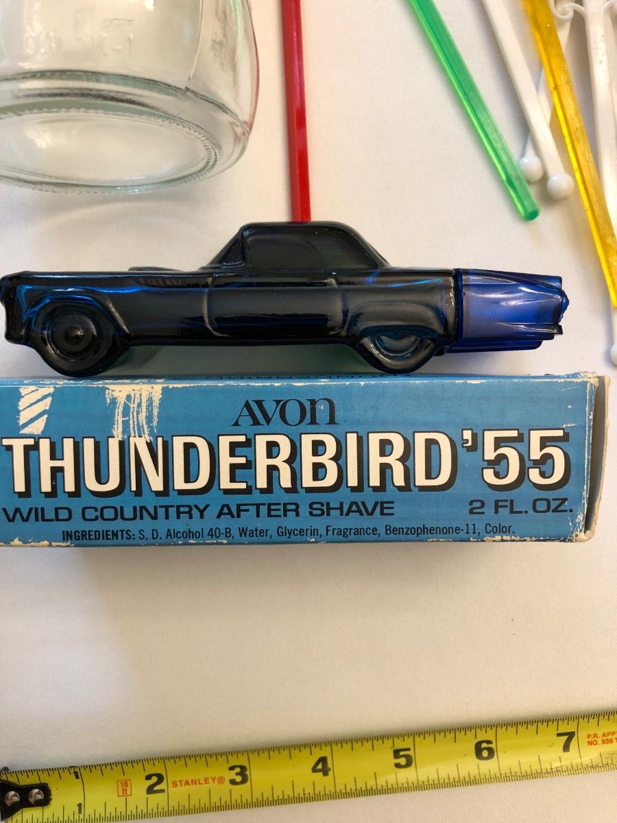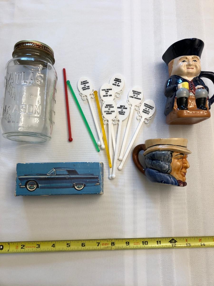 Humorous plastic drink stirrers, Atlas mason jar, Avon blue “˜55 Thunderbird, and two Toby mugs.