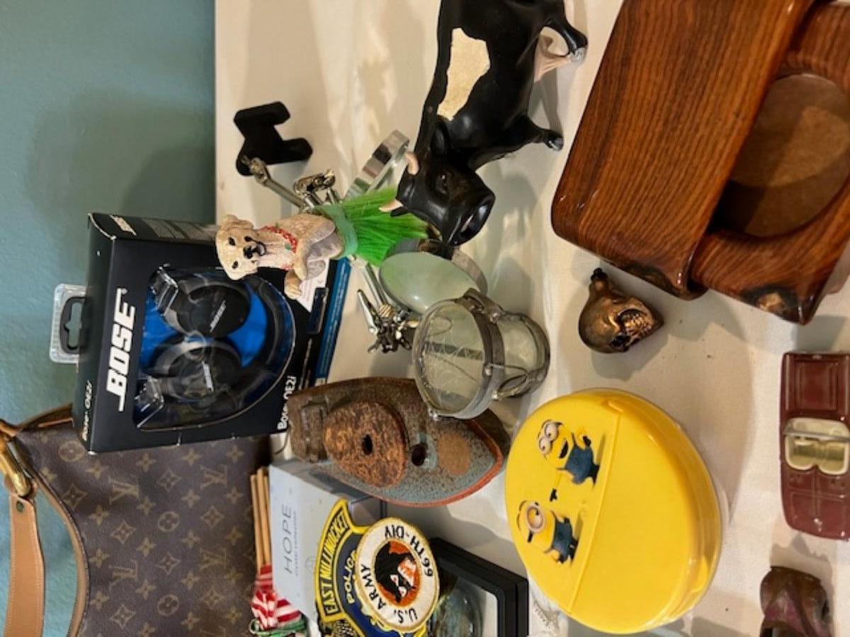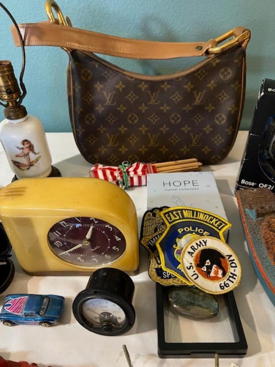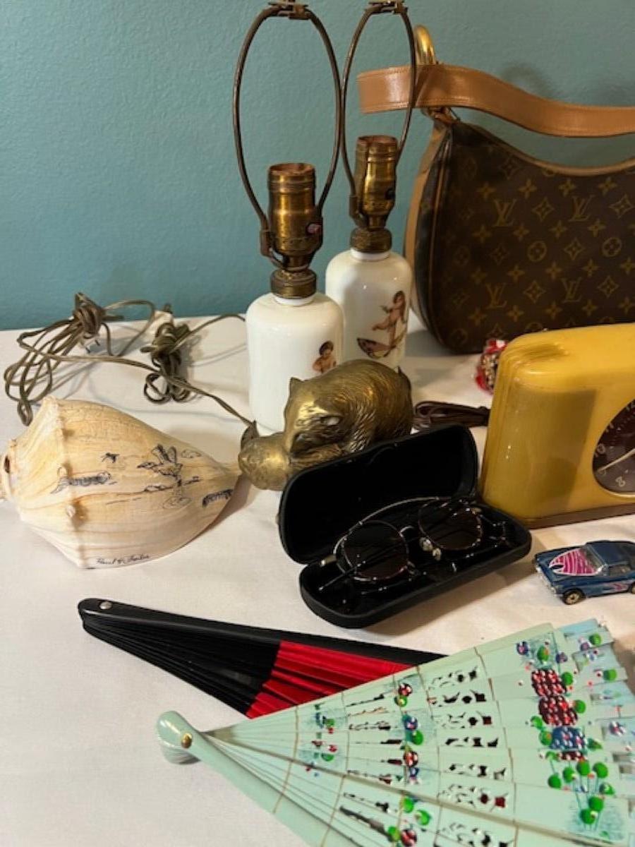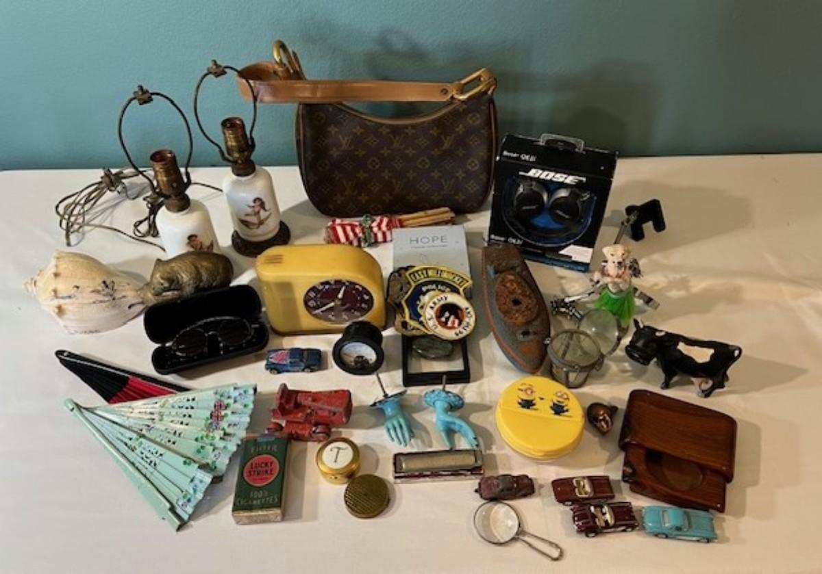 Includes lamps, Bose headphones, repro Louis Vuitton purse, figurines, hand fans, patches, conch shell, harmonica, vintage clock, and more. Total of 38 pieces. Not tested.