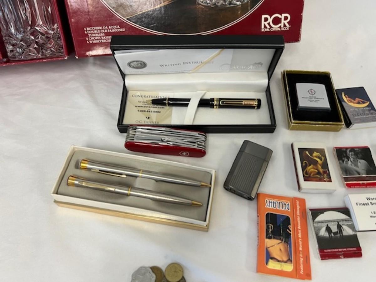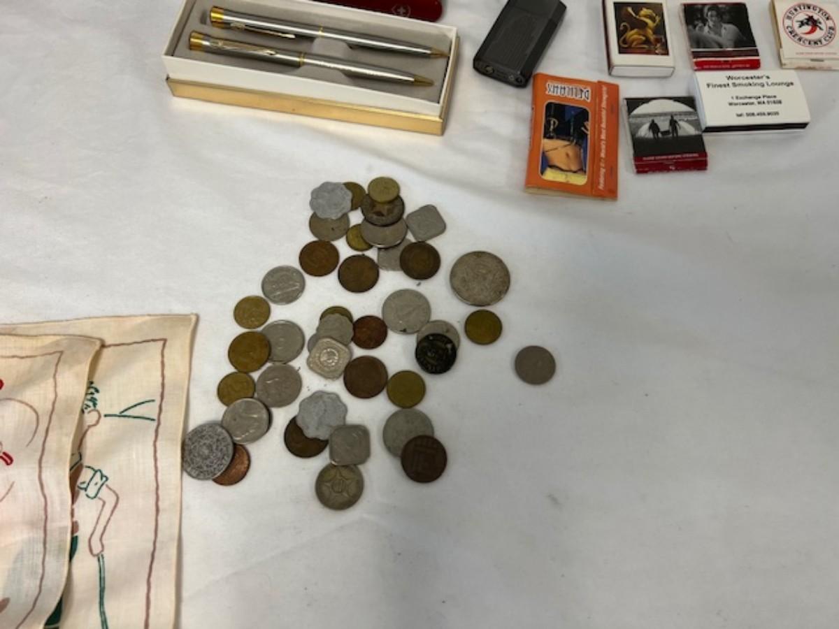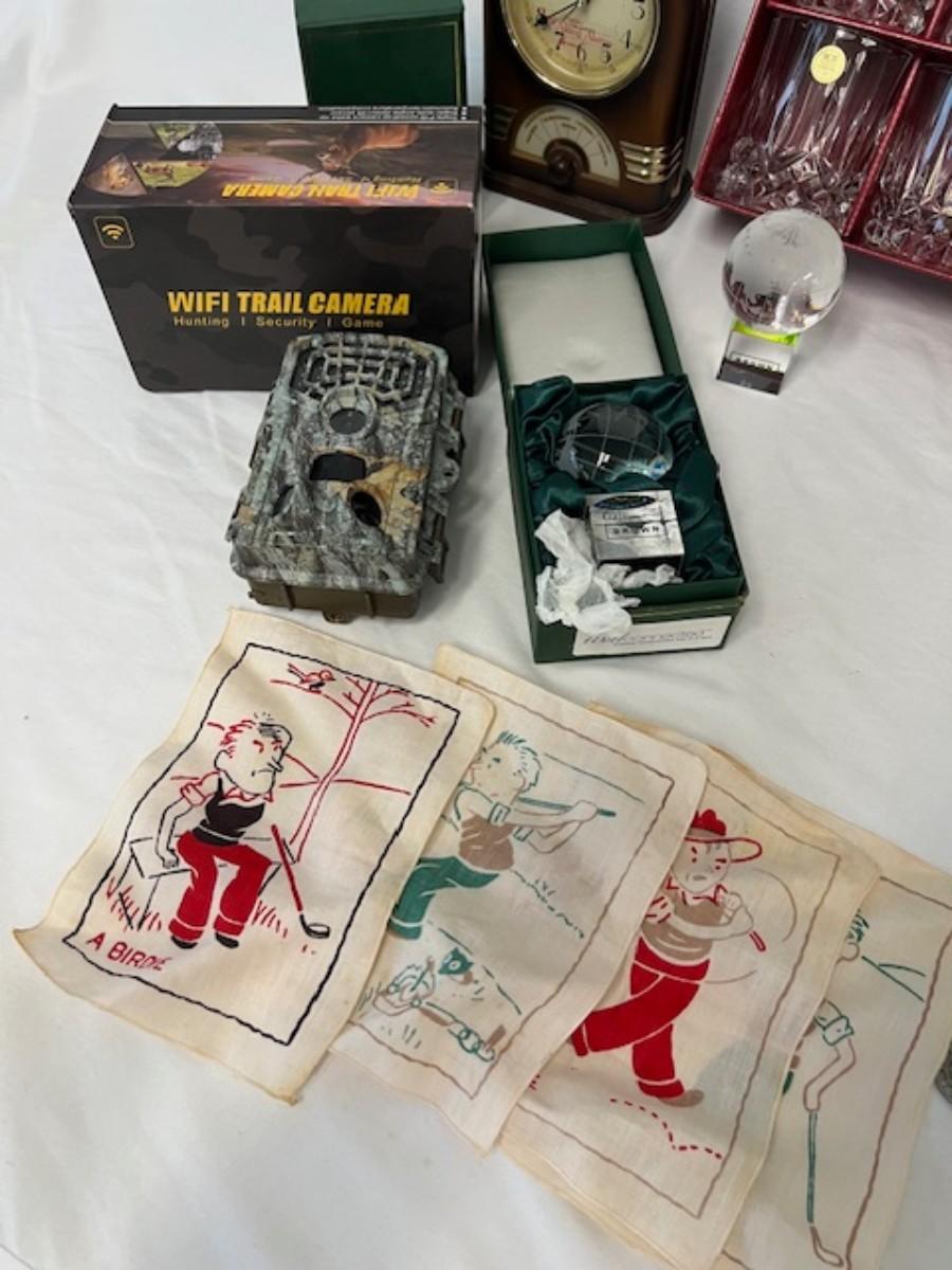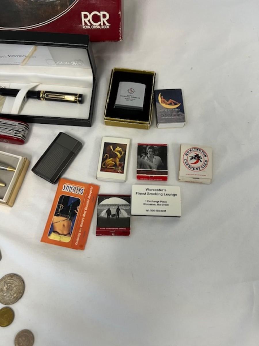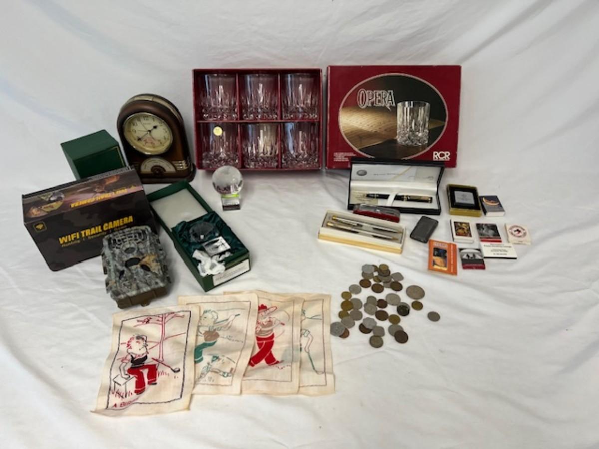 Includes a trail camera, tobacciana, pens, coins, a clock, a knife, paperweights, and more. Total of 25+ pieces. [ST]