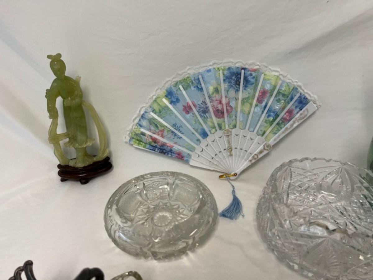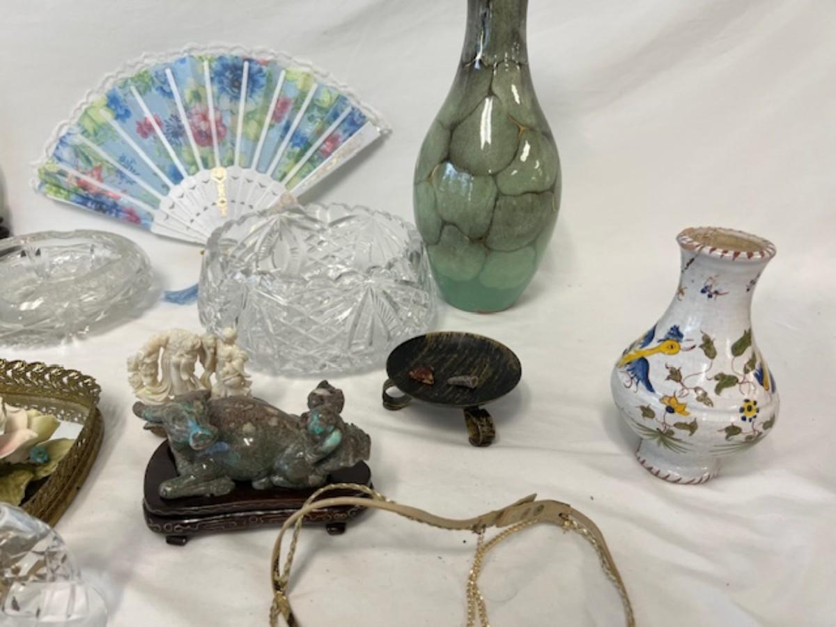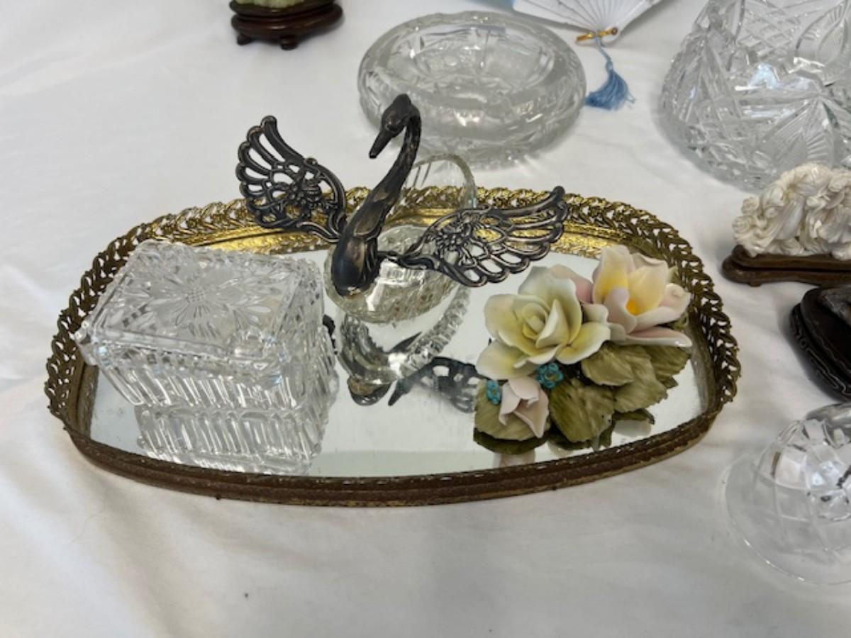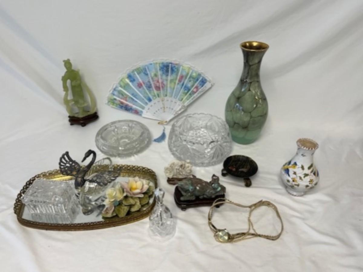 Includes crystal, vases, vanity tray, bell, and more. Some have age related wear. Some may have repairs or damage. Total of 15 pieces. [KB]
